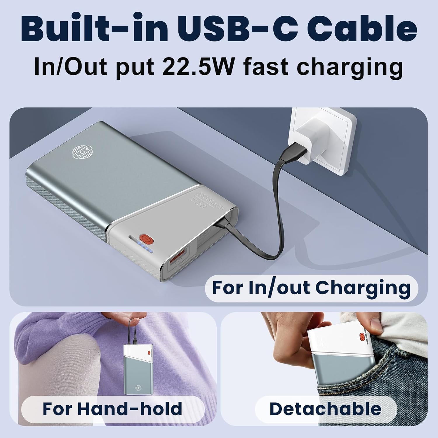 Portable Charger Power Bank 20000mAh - 22.5W PD Super Fast Charging with Detchable Cable in & Output, Travel Essential Battery Pack Compatible with iPhone16/15/14/13 iPad MacBook Samsung Android etc