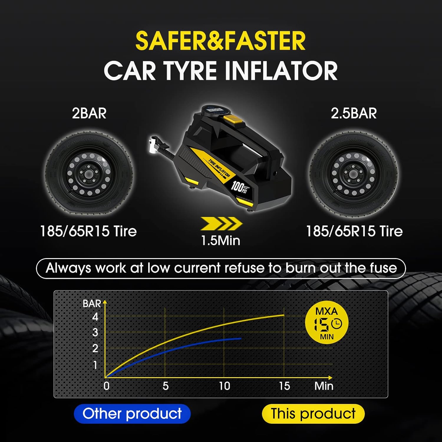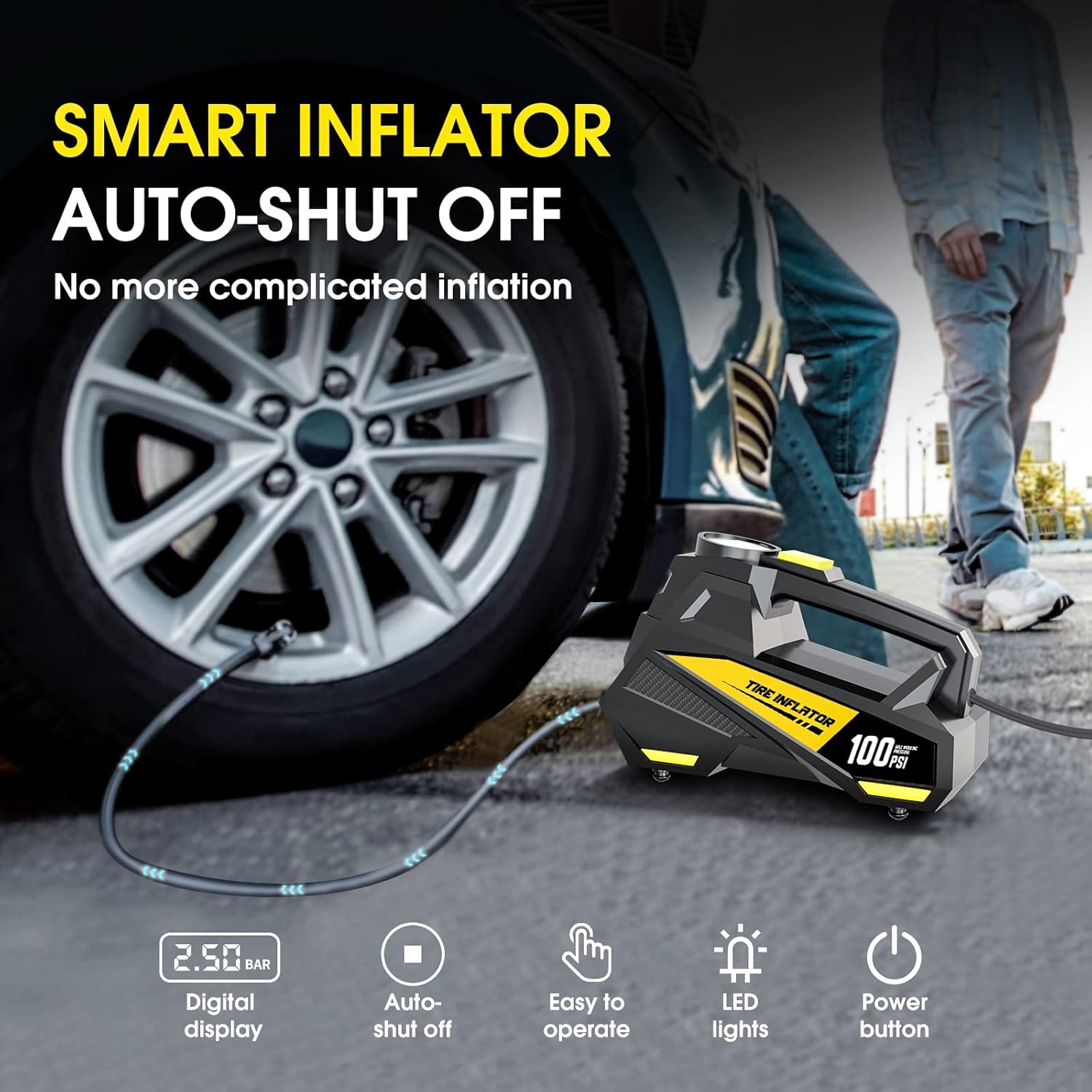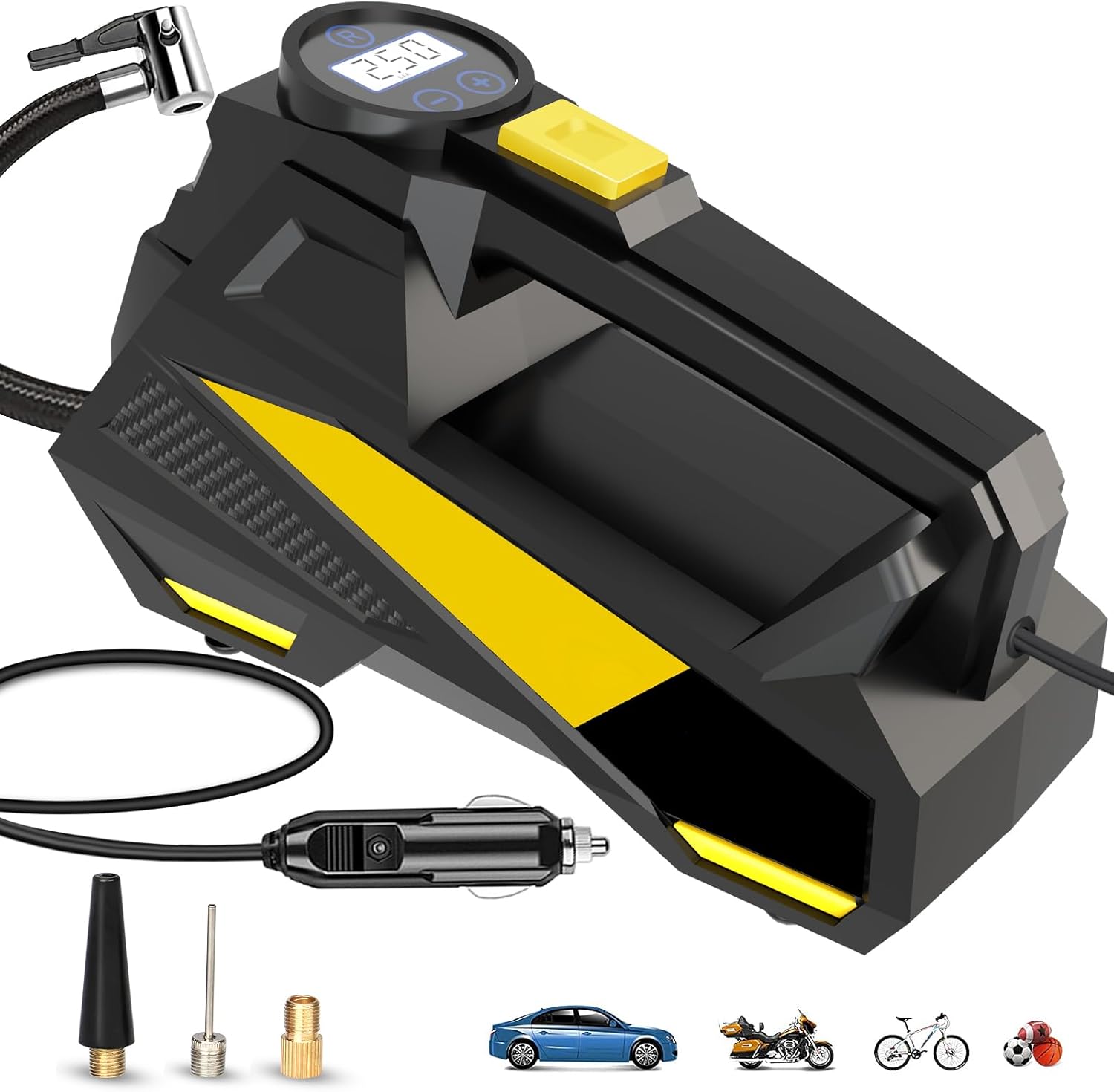 PROFESSIONAL GRADE INFLATION FOR MULTI-VEHICLE USE - This 150 PSI portable air compressor offers fast inflation for car tires, motorcycles, bicycles and sports equipment such as basketballs or soccer balls. Powered by an automatic 12V DC pump through your car's cigarette lighter, achieve precise pressure settings (5-150PSI) with minimum noise (<72dB). The 12-foot reinforced air hose and brass nozzle ensure leak-free connections, while its compact design fits effortlessly into trunks or emergency kits. Perfect for on-road tire emergencies or backyard inflatables