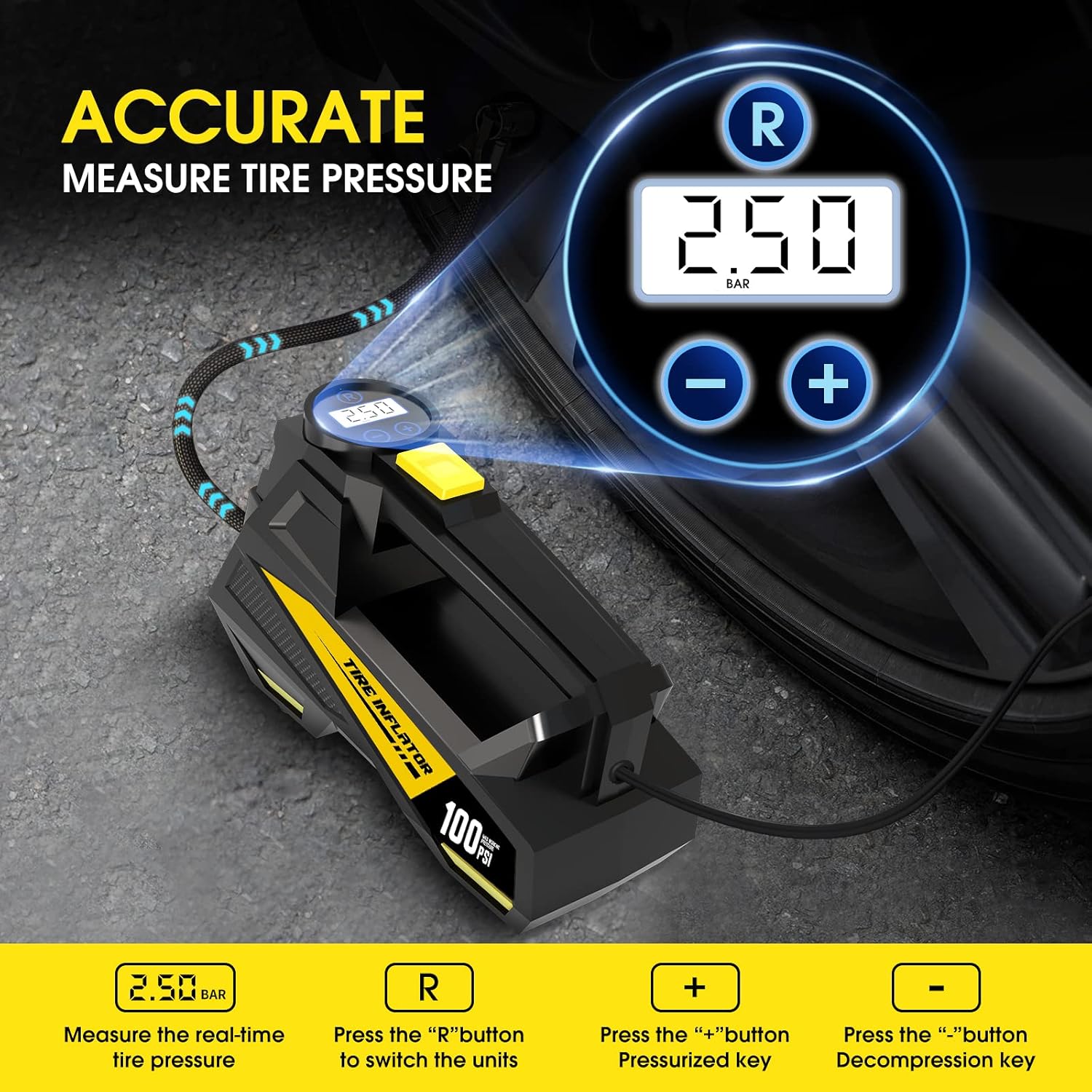 PRECISION CONTROL WITH AUTO SHUT OFF TECHNOLOGY - Equipped with a military-grade LED digital pressure gauge (±1% accuracy), adjust your PSI target and let the auto shut-off feature handle the rest. Bright LCD display displays real-time pressure in PSI, BAR, KPA or KG/CM², ideal for maintaining manufacturer's recommended levels (e.g. 32-35PSI for sedans, 28-40PSI for motorcycles). Dual Power Options - 12V DC or 7800mAh rechargeable battery, ensure uninterrupted use, even during extended sessions
