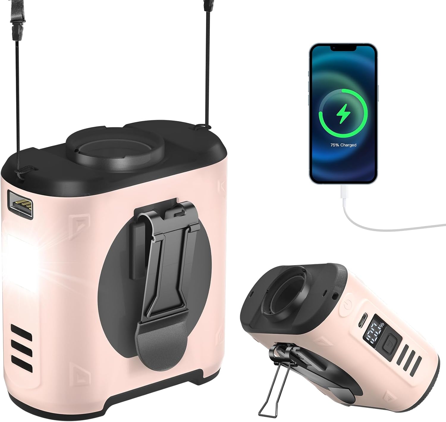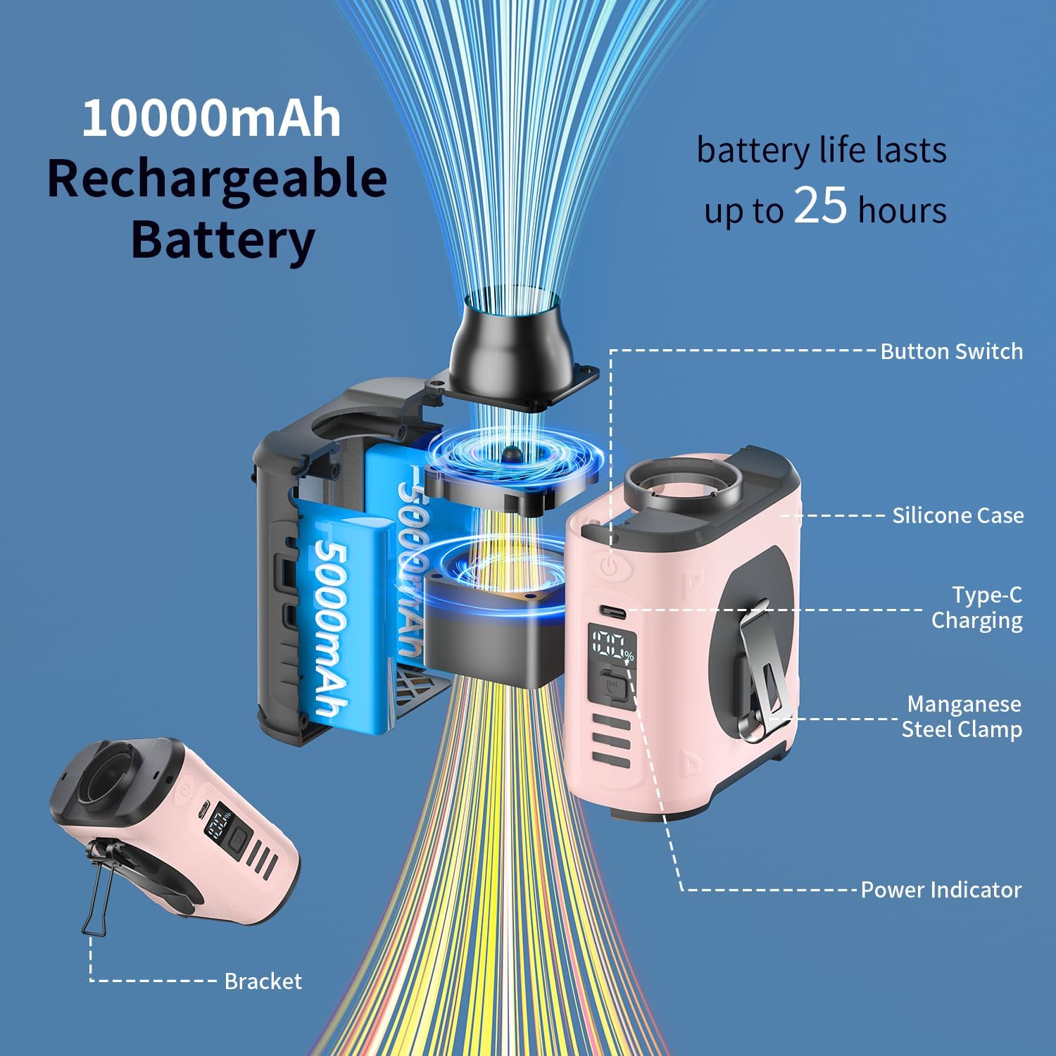 Ultra-Long Battery Life: EEIFO portable waist clip fan is equipped with 10,000mAh high-capacity battery, it fully charges in 4 hours. Depending on the selected wind speed level, it can operate continuously for 7 to 40 hours on a full charge, ensuring all-day use. Featuring a 5V-2A Type-C input and a 5V-2A USB output port, the rechargeable portable fan can also serve as an emergency power bank for charging phones and other devices.