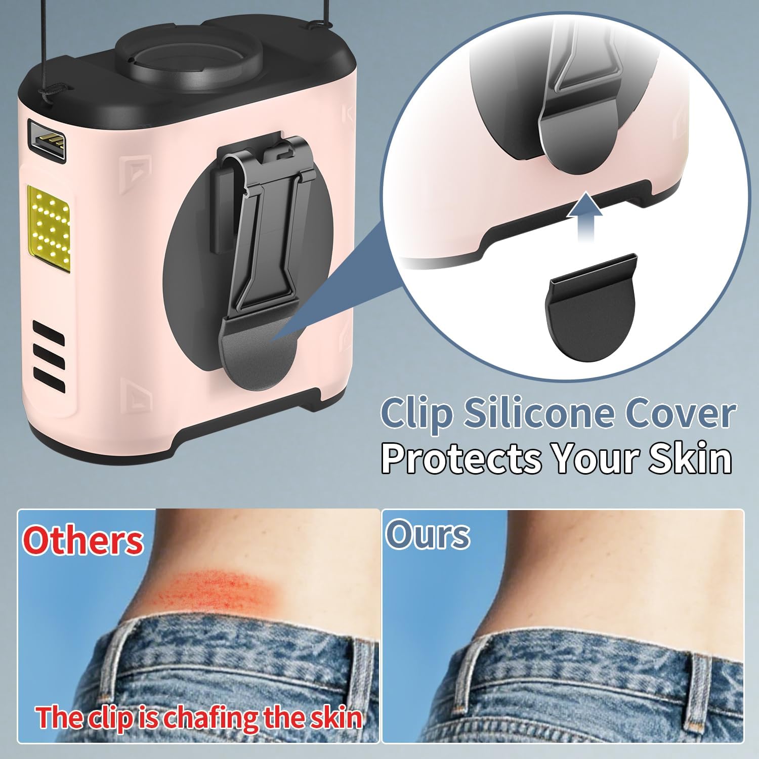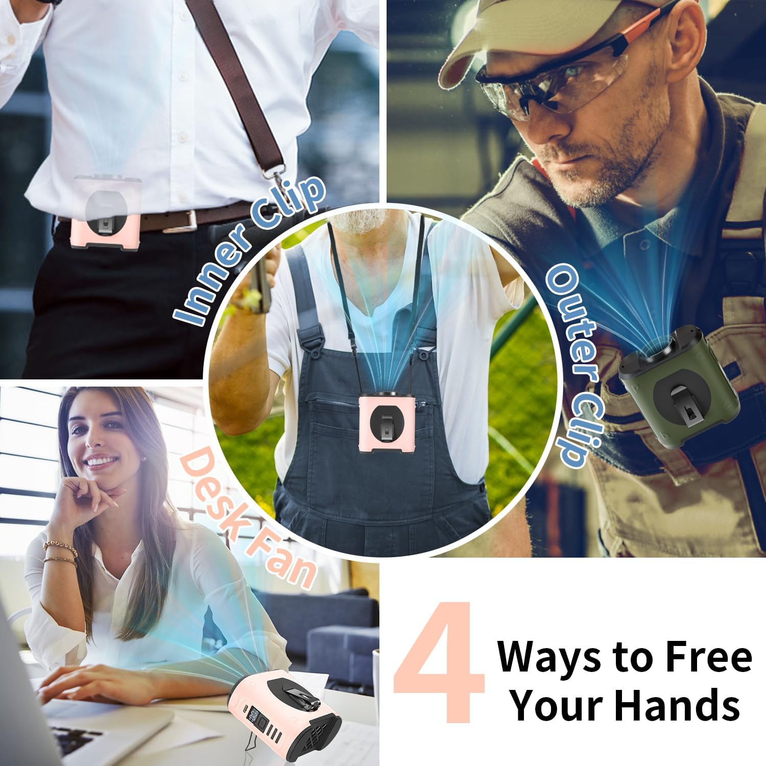 Multifunctional Waist Fan: A portable fan that integrates waist clip fan, desk fan, and neck fan into one, allowing for cooling anytime and anywhere. Additionally, this wearable fan features a built-in LED light for nighttime visibility and an SOS signal light function for emergency situations.