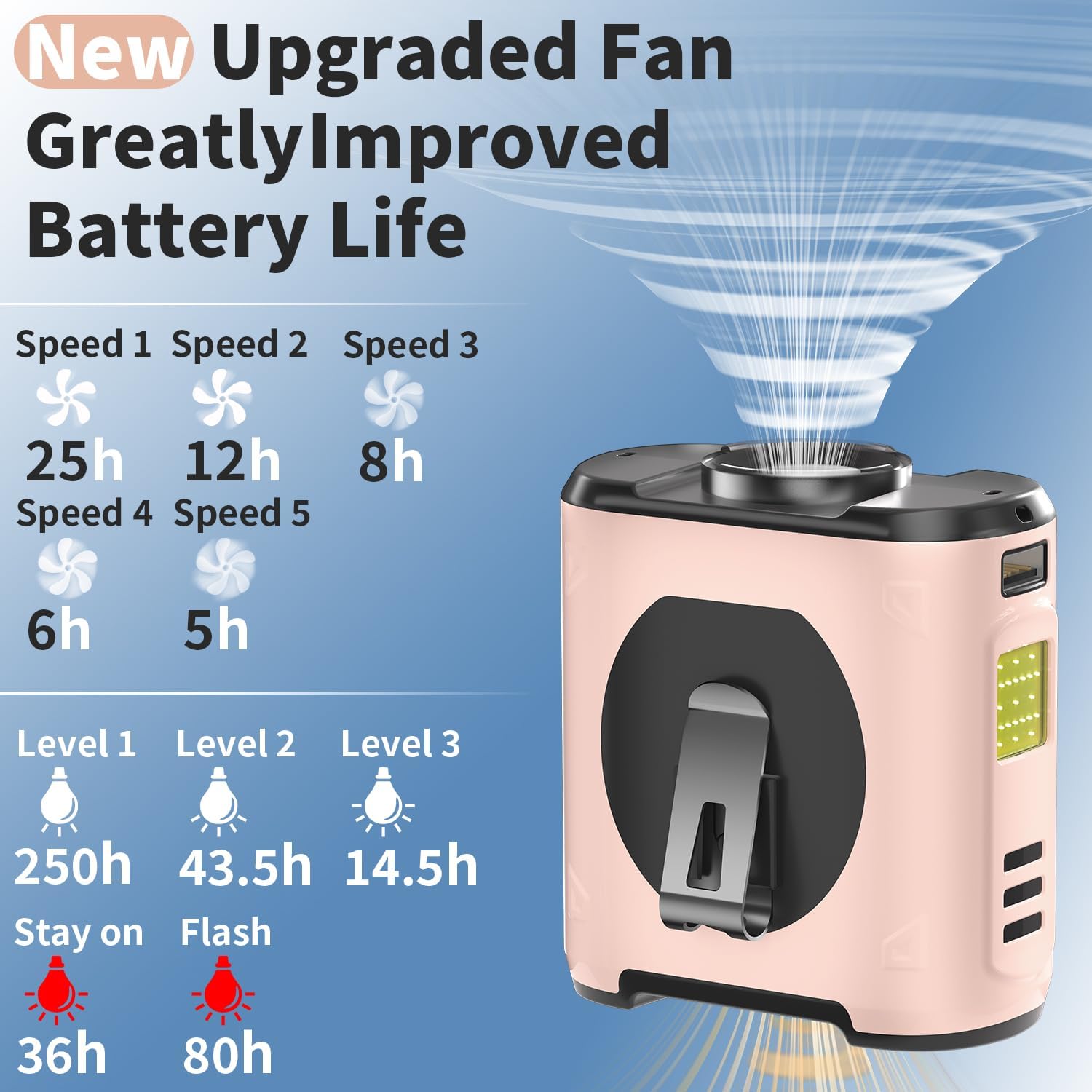 Super Strong Wind Power: Powered by a high-speed brushless motor with a maximum speed of 16,000 RPM, our waist fan clip on generates a strong airflow of 18mf/s, instantly dissipating heat. With five adjustable wind speed settings, this belt clip fan meets varying needs—from a gentle breeze to a powerful cooling wind—ensuring optimal comfort whether you're at work or outdoors.