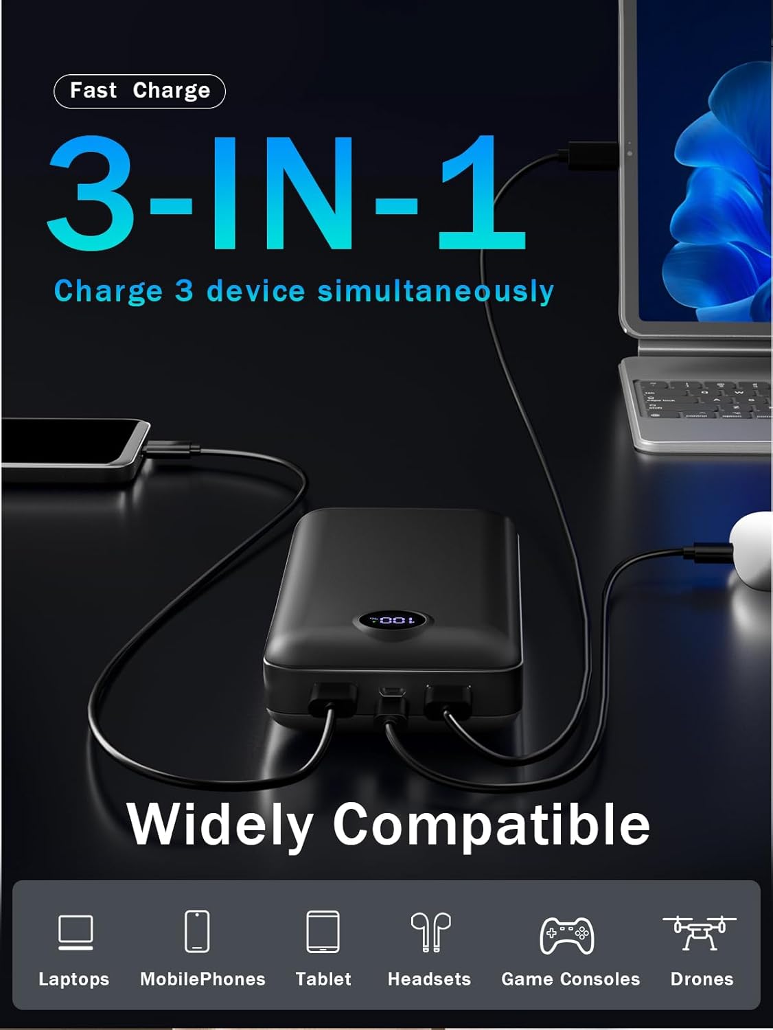 Battery pack provides 2 Inputs (Micro and Type C port), we can flexibly match different types of charging cables; 3 outputs (2 USB & 1 Type C port), Which makes we to share the powerbank with workmates, friends or family, charging 3 devices at the same time, compatible with smart phone, Tablet PC, mini speakers, smartwatch,headsets, cameras, game consoles