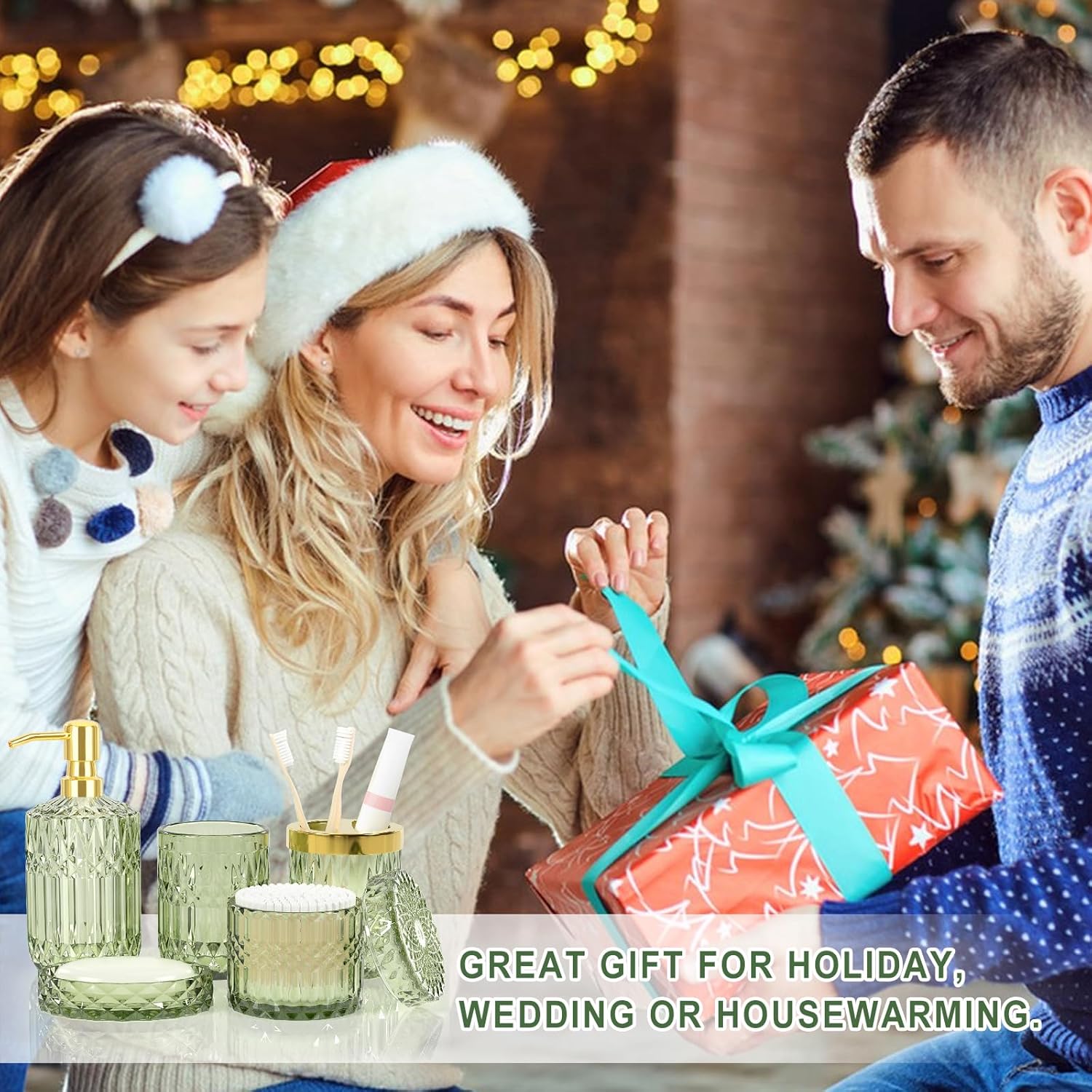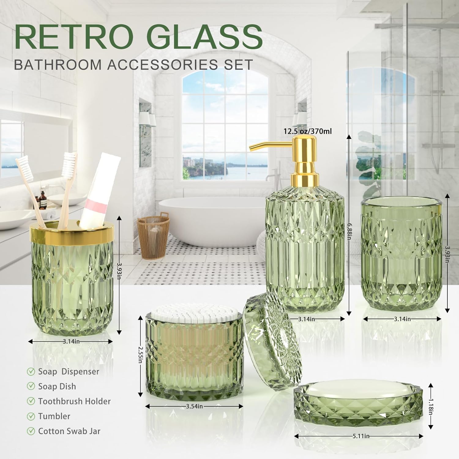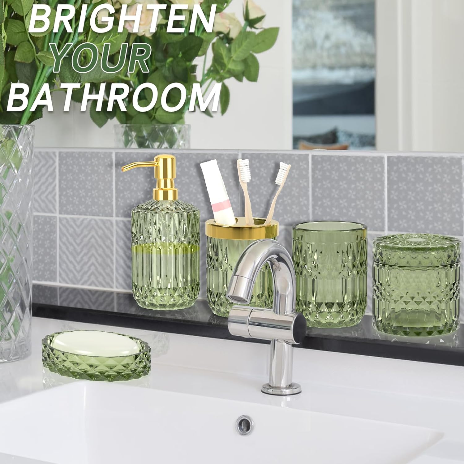 Premium Green Glass Bathroom Accessories Set (5PCS), Glass Soap Dispenser Set with Rust Proof Stainless Steel Pump, Elegant Modern Bathroom Decor Set, Gift for Valentines Day, Birthday or Housewarming