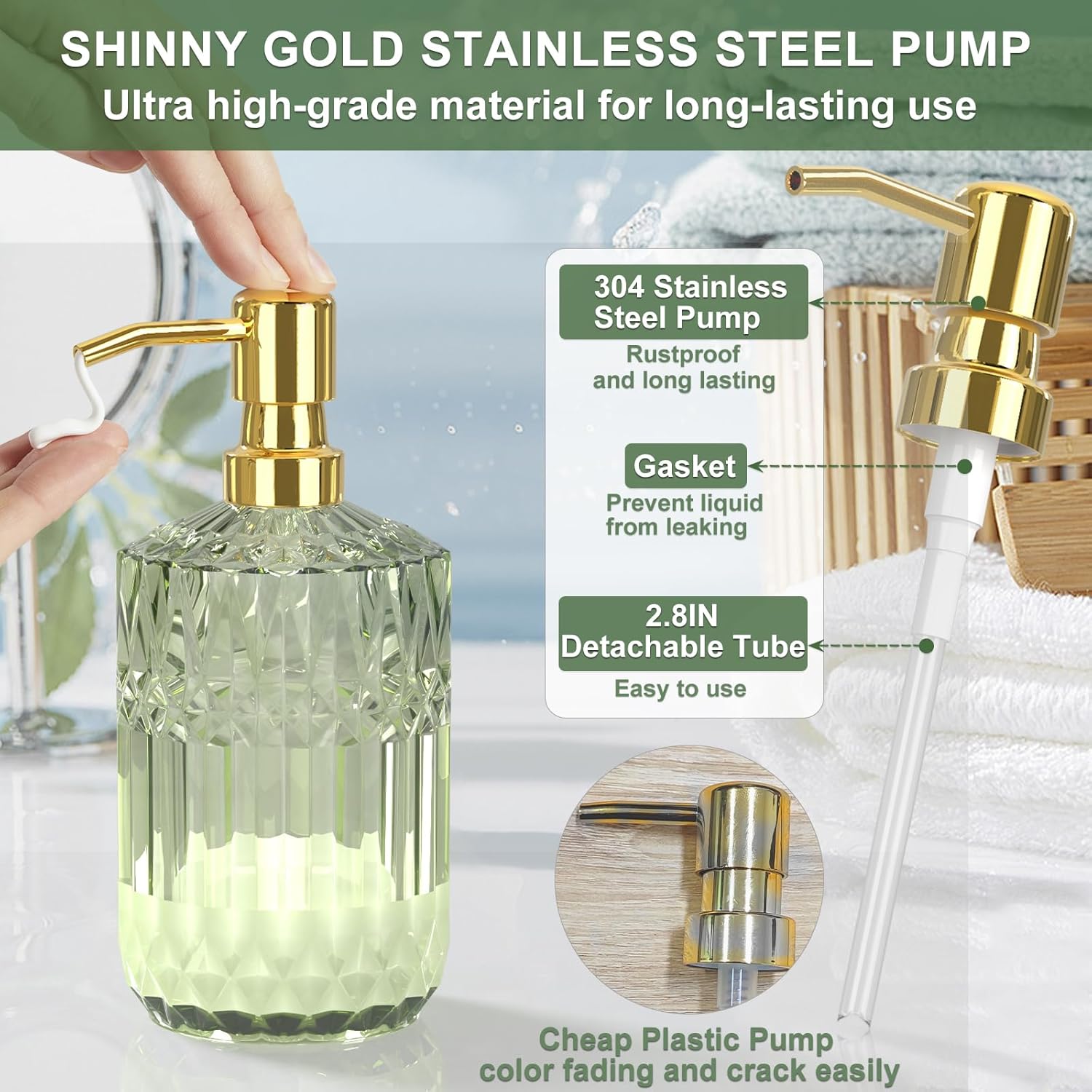 - 【UPGRADED SOAP DISPENSER WITH STURDY PUMP】Based on the requirement, we have used premium rust-proof stainless steel pump to replace the original plastic pump heads. The green soap dispenser of stainless steel pump will retain its vibrant appearance without succumbing easily to corrosion or rusting. Easy to press liquid out and not break like plastic.