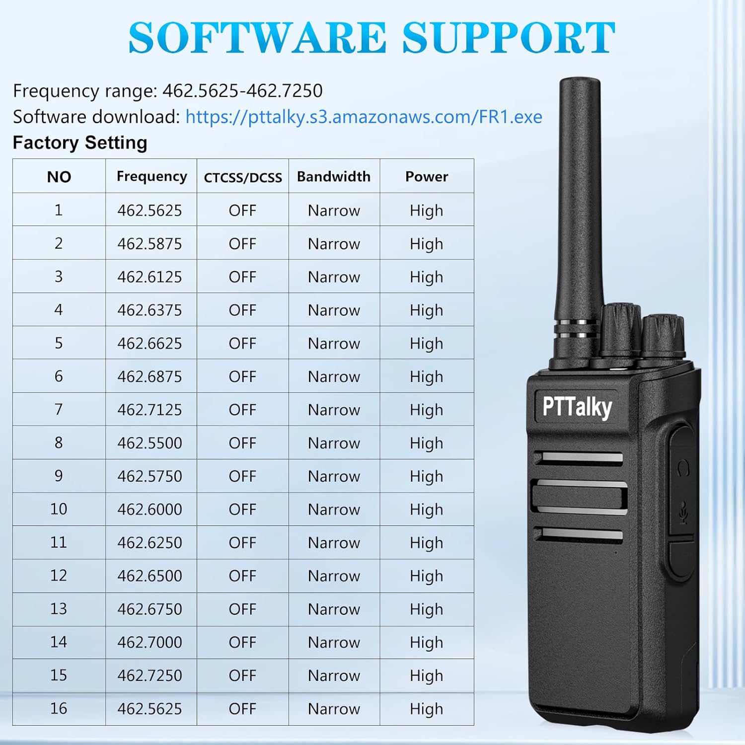 - 【Software Support】You can download software to edit the functions of the FR1 walkie talkie. Frequency Range: FRS ONLY. CTCSS/DCS can be edited. Brandwidth ( Narrow) Cannot be edited. software download: https://pttalky.s3.amazonaws.com/FR1.exe