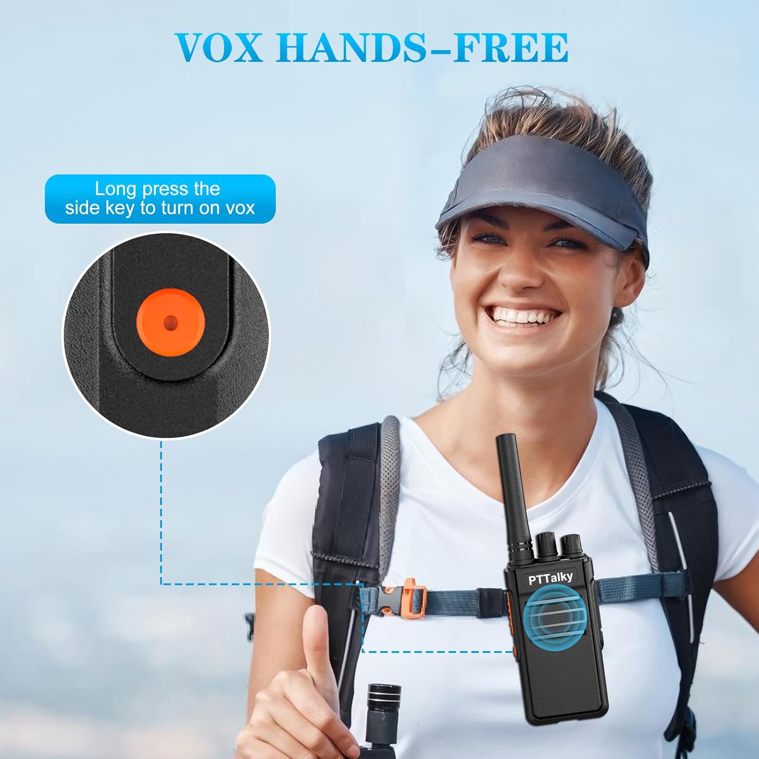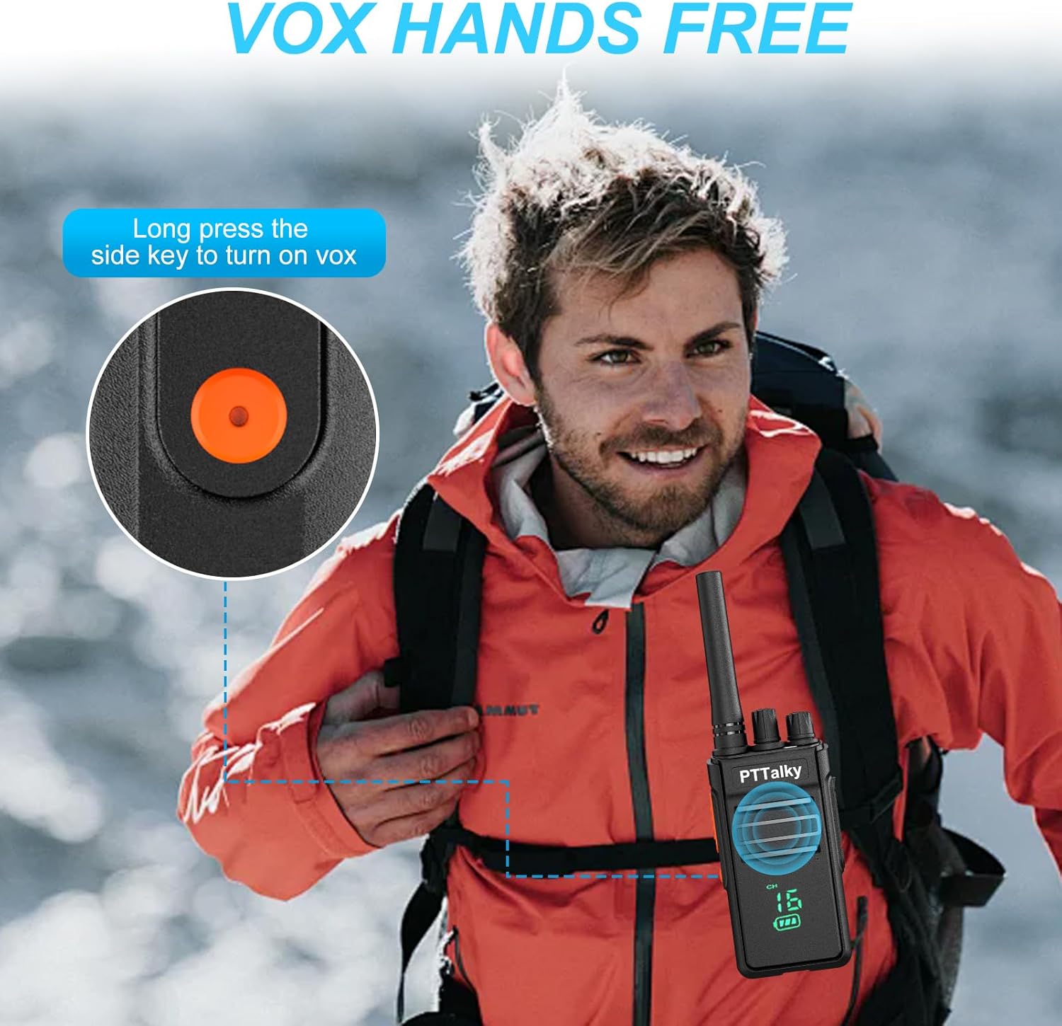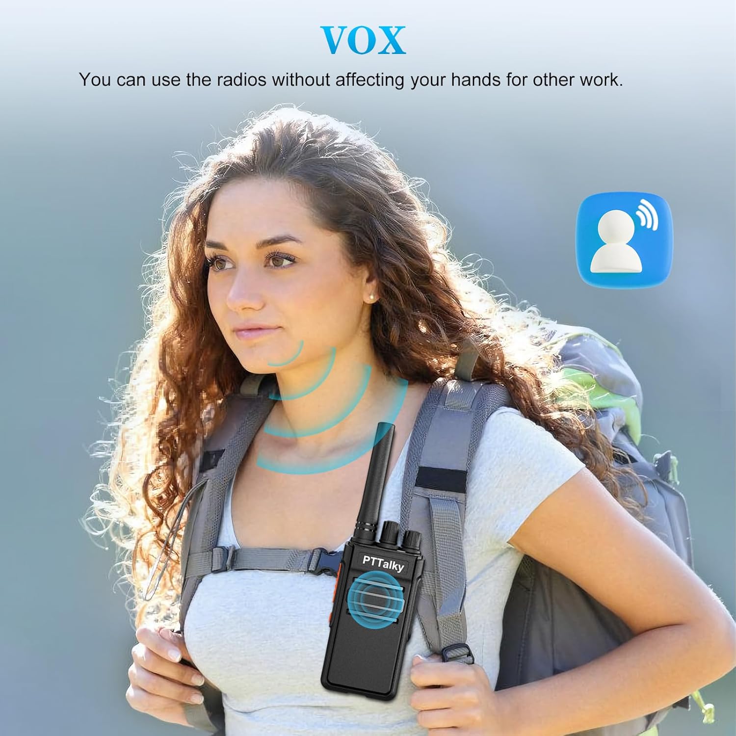 - 【VOX function】The hand free walkie talkies with the VOX function. The round button on the left side can be pressed for three seconds to start the VOX function.You can use the radios without affecting your hands for other work.