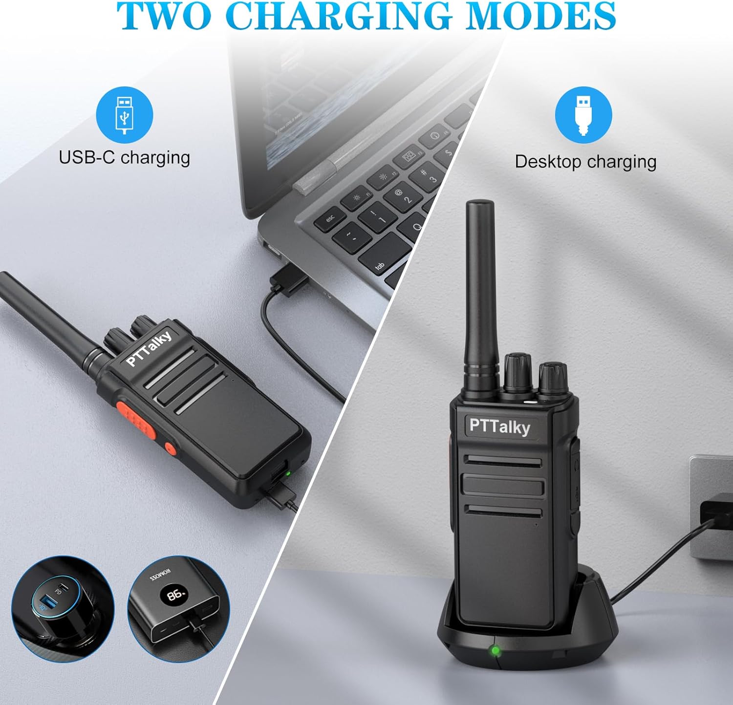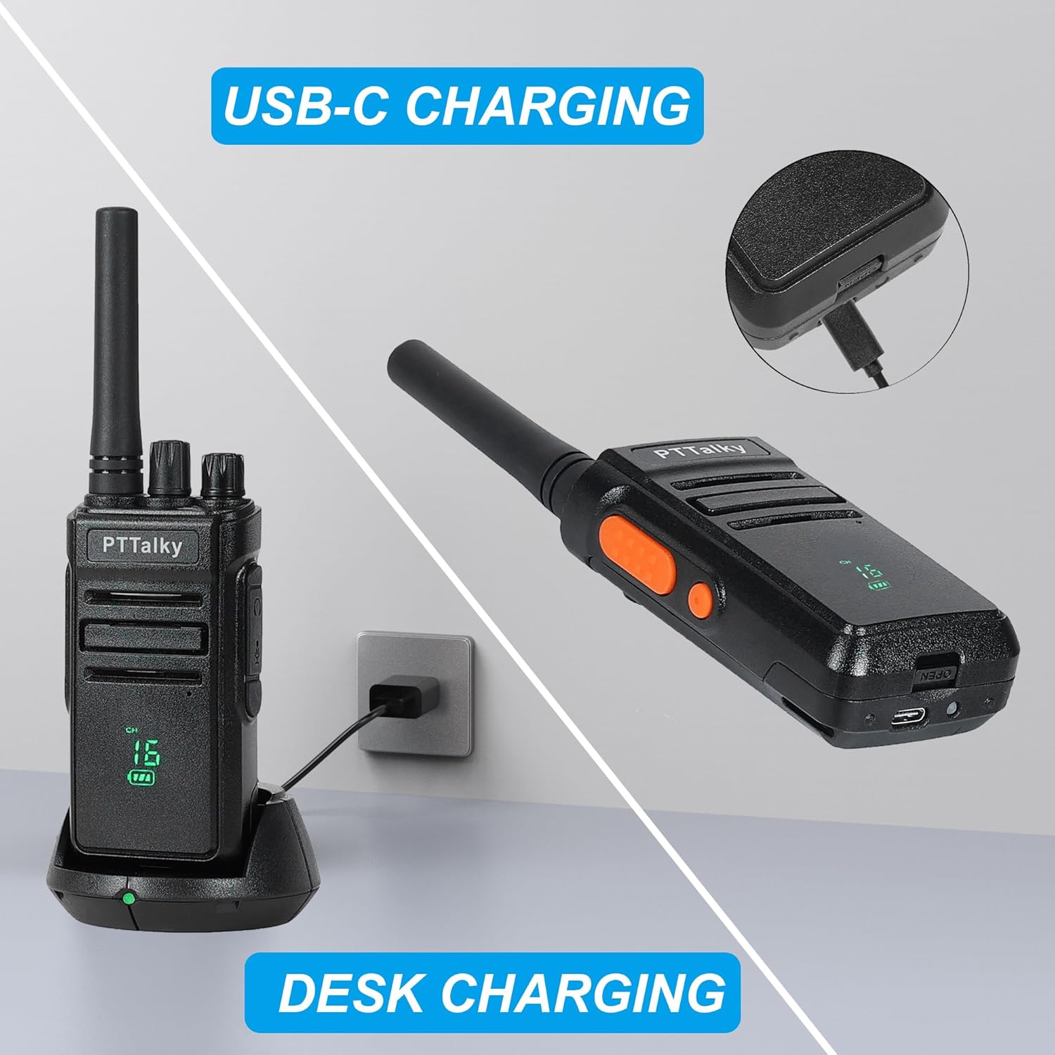 - 【USB-C charging/ 1200mAh battery】The 2 Way Radio's rechargeable 1200 mAh battery is equipped with a USB-C port to support the easier USB-C charging method,especially convenient when going out.