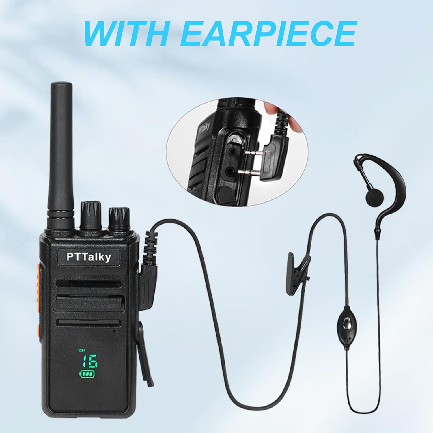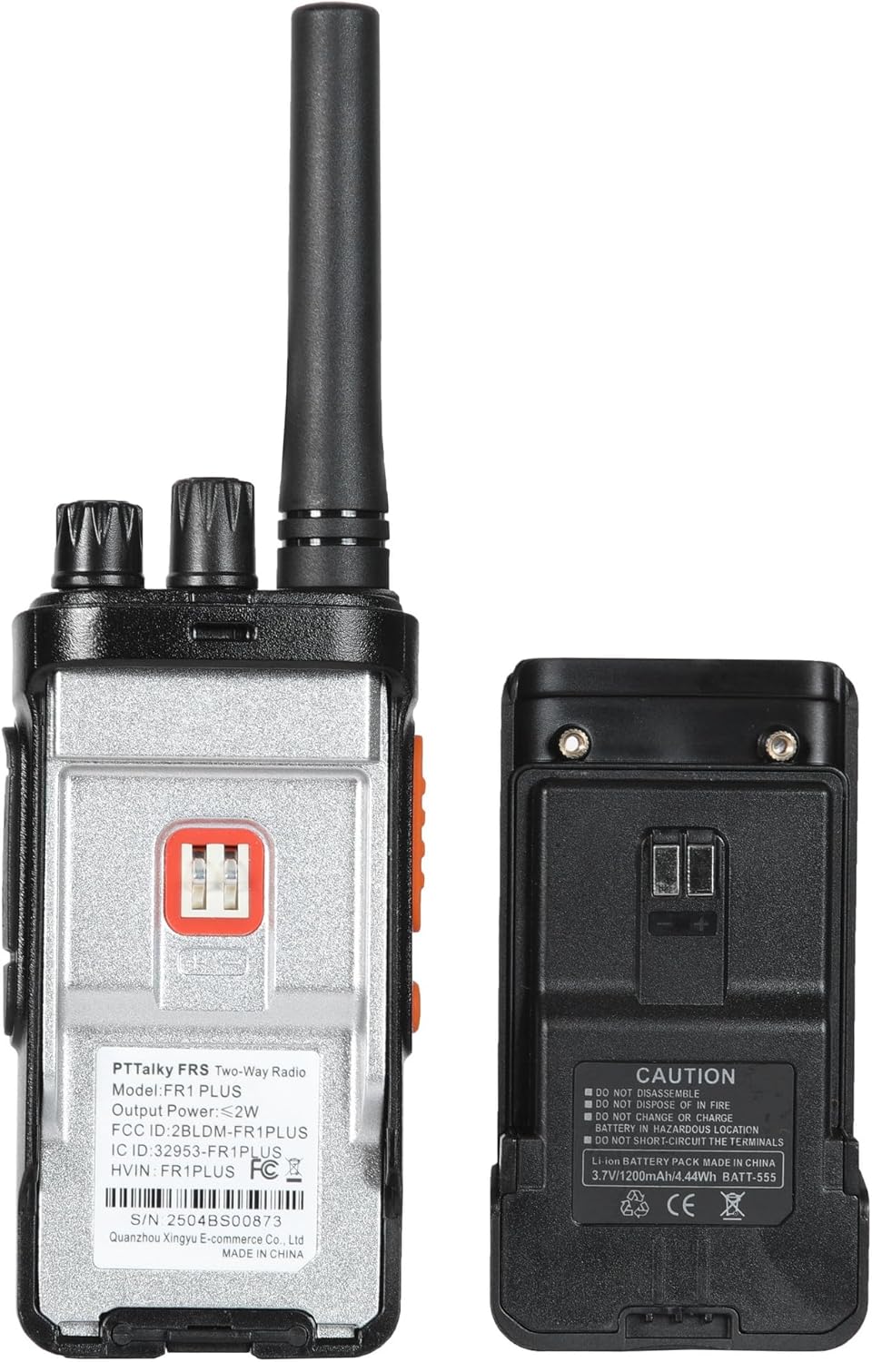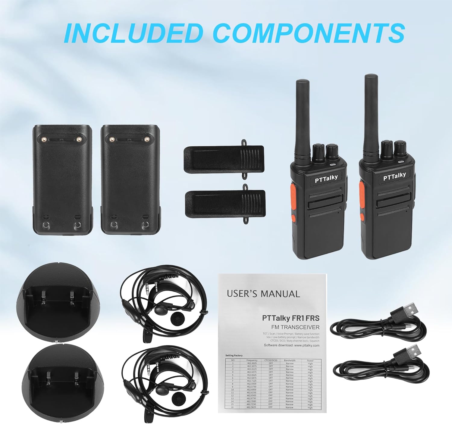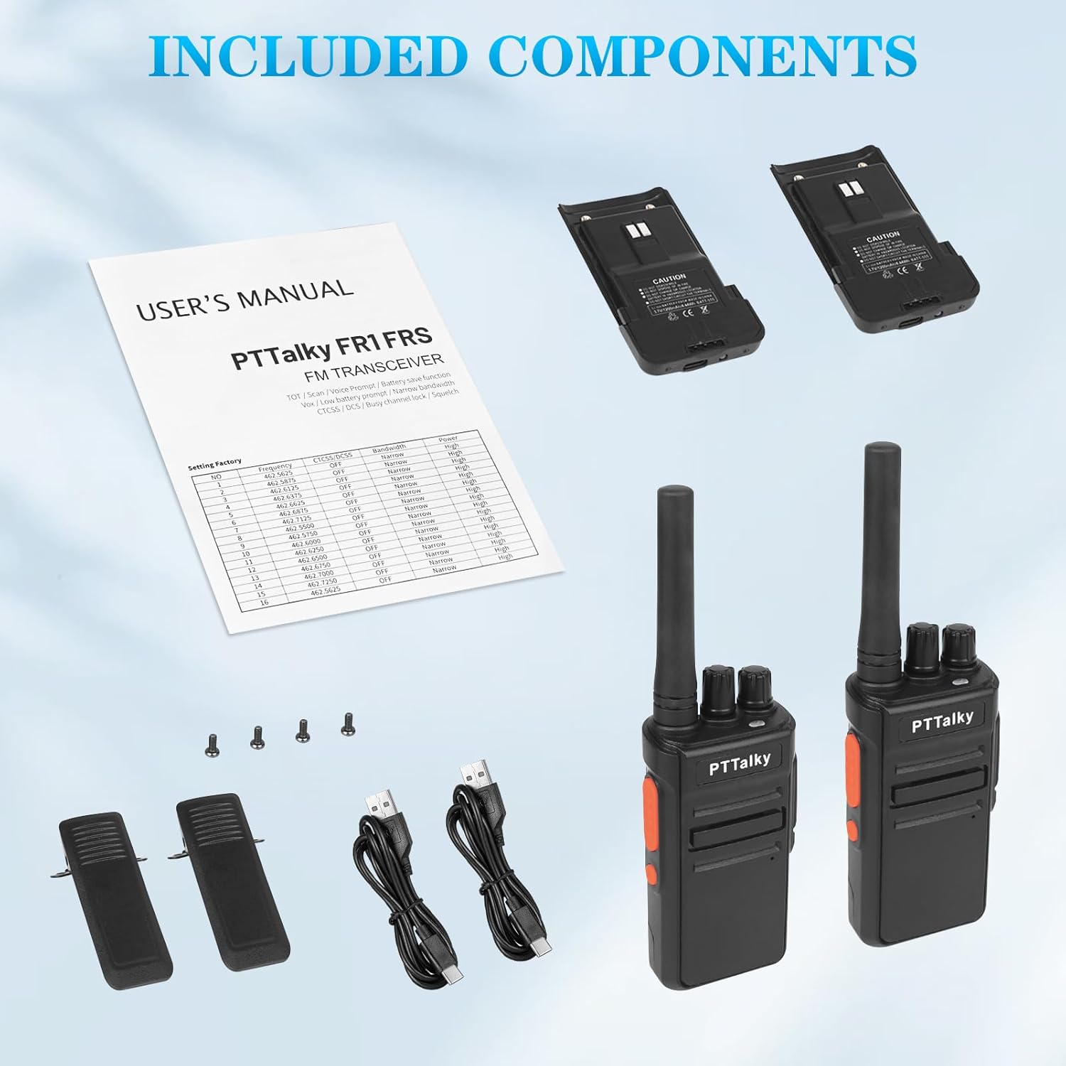 - 【Package includes】2 x FR1 long range walkie talkies ,2 x 1200mAh Li-ion Battery Pack , 2 x USB-C cable ,2 x Belt Clip ,2 x Desktop Charger ,2 x Earphone ,1 x English Manual .