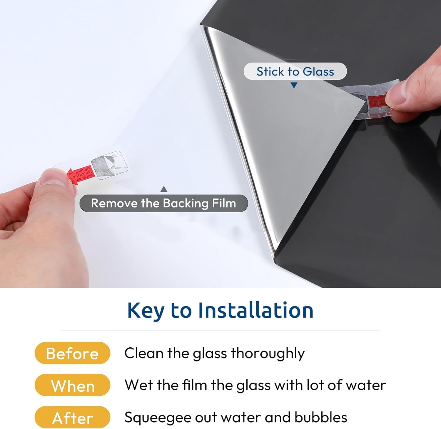 - No Adhesives, Easy Installation: Apply the static film in Minutes - For optimal results, start with a clean window. Measure and trim the film to size, then remove the backing film. Generously spray both the window and the adhesive side of the film with water. Place the film onto the window and squeegee across its to eliminate any air bubbles. Tip: more water, more easier installation