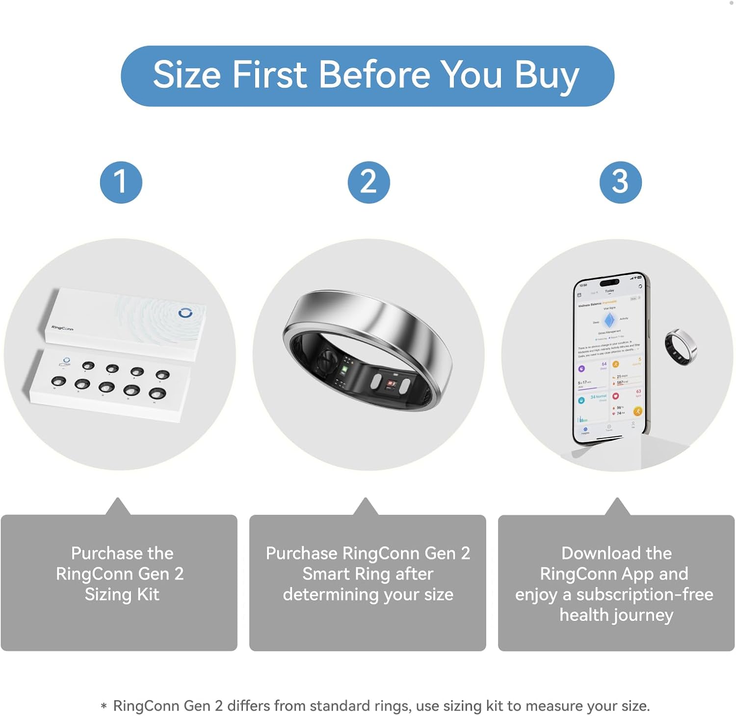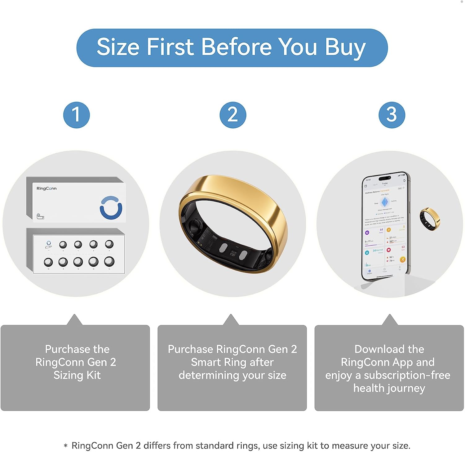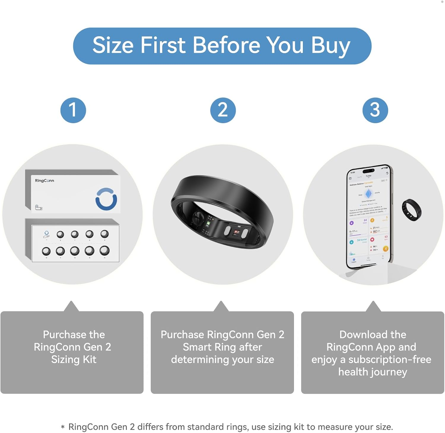 - [Size Before You Buy] RingConn Gen 2 Smart Ring uses unique sizing standards, different from other health rings. RingConn Gen 2 Sizing Kit helps you find the most comfortable and accurate fit for your finger, preventing the inconvenience of returns and exchanges by ensuring you select the correct size before purchasing