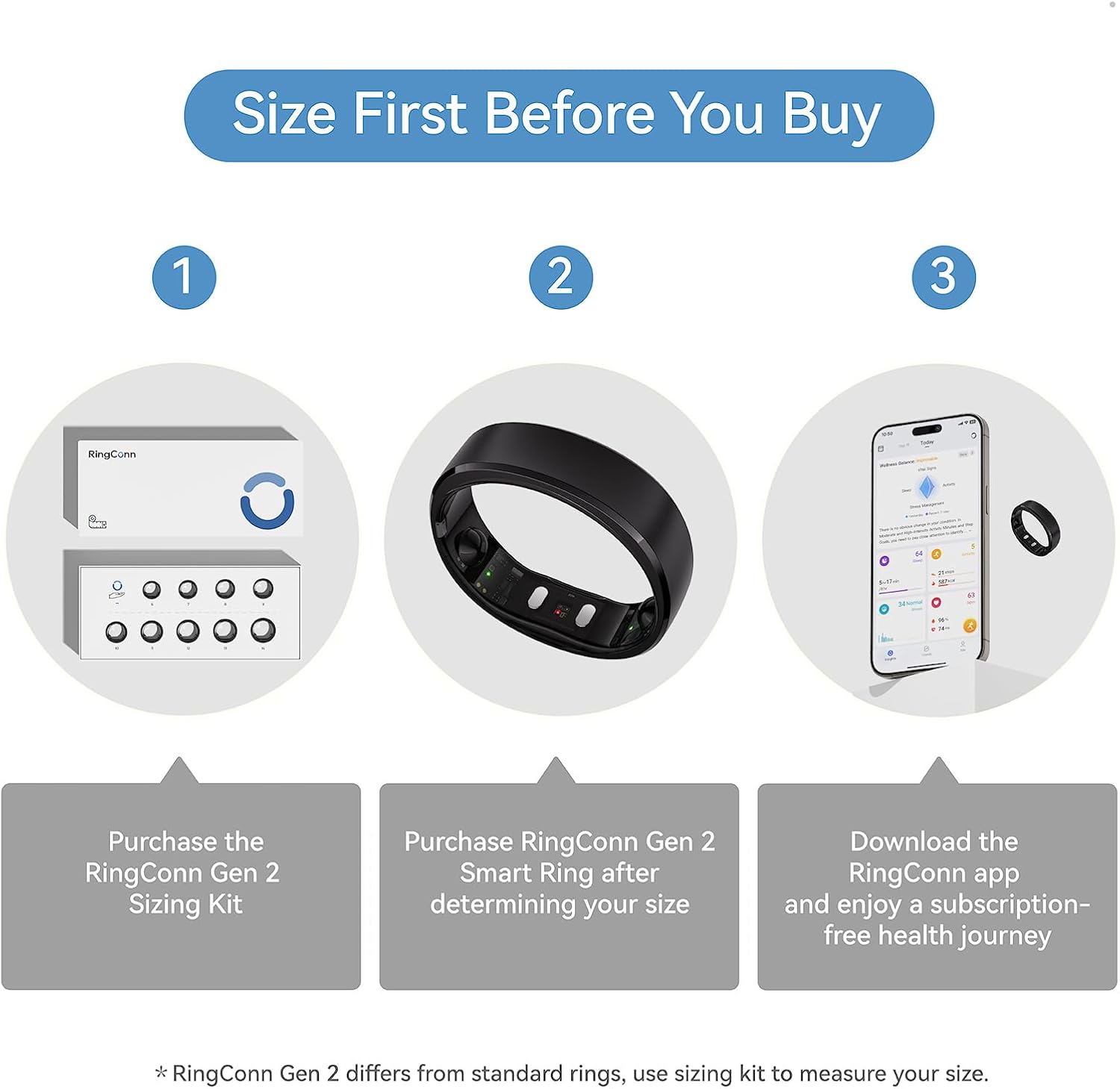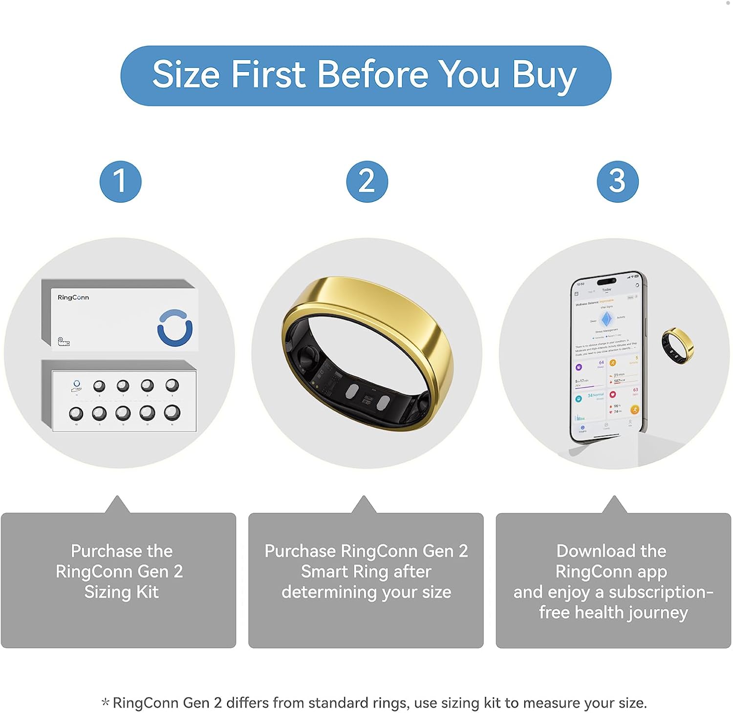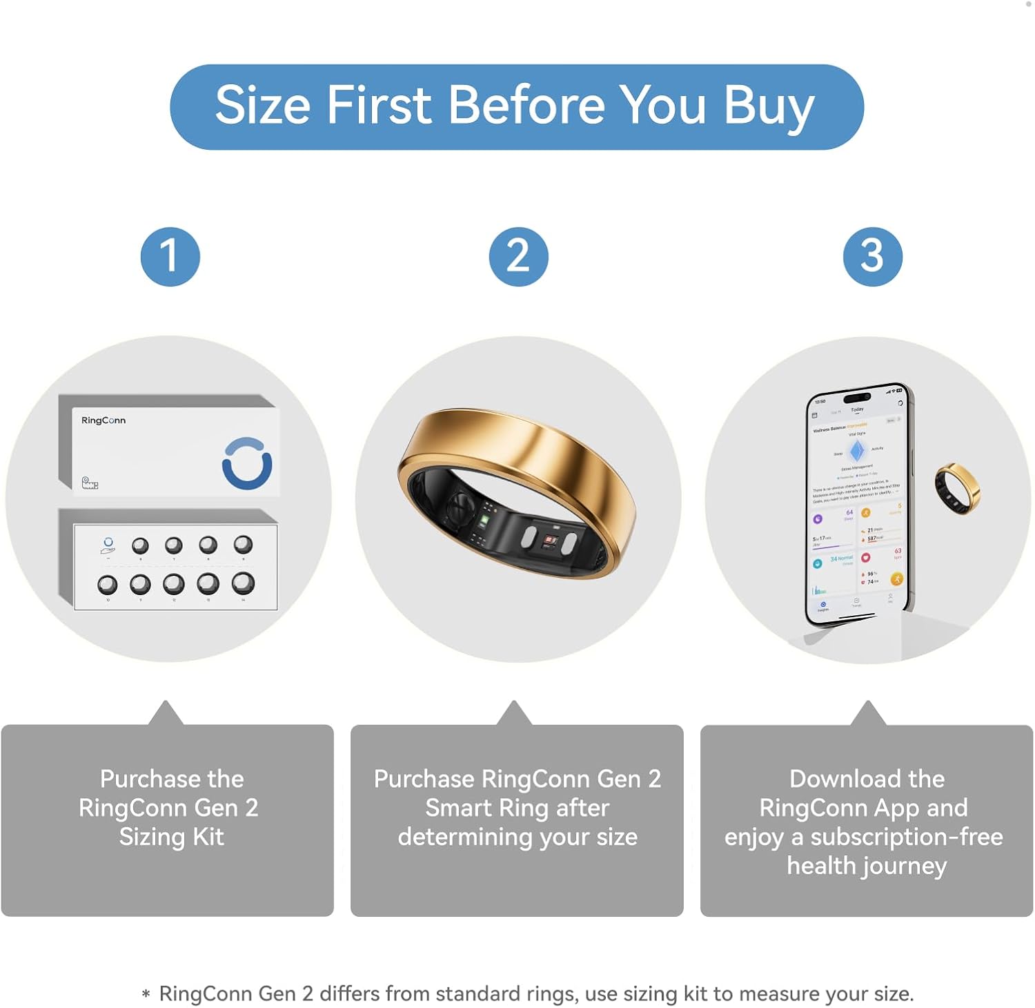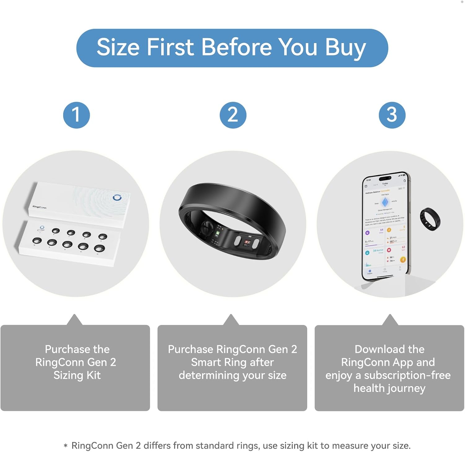 - [Size Before You Buy] RingConn Gen 2 Smart Ring uses unique sizing standards, different from other health rings. RingConn Gen 2 Sizing Kit helps you find the most comfortable and accurate fit for your finger, preventing the inconvenience of returns and exchanges by ensuring you select the correct size before purchasing