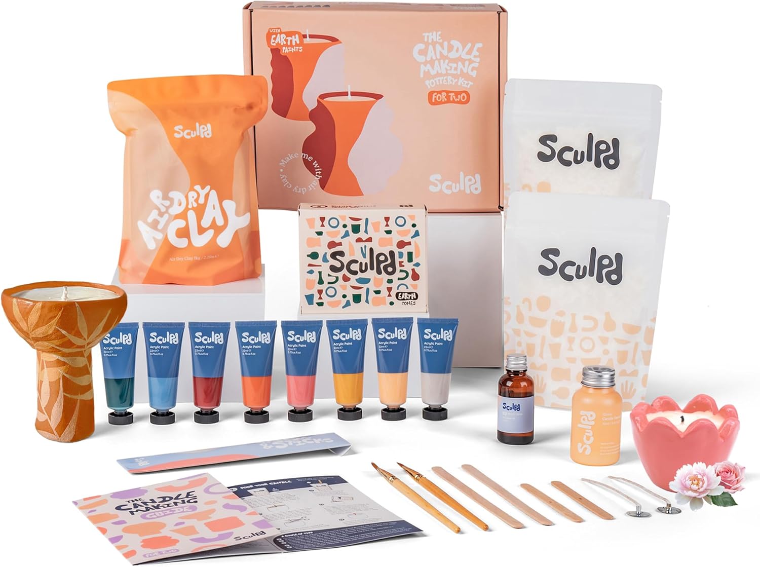 Complete 2-Person Arts & Crafts Set – Includes Air Dry Clay, Soy Wax, Fragrance, Paints & Tools – Creative DIY Gift for Adults & Teens