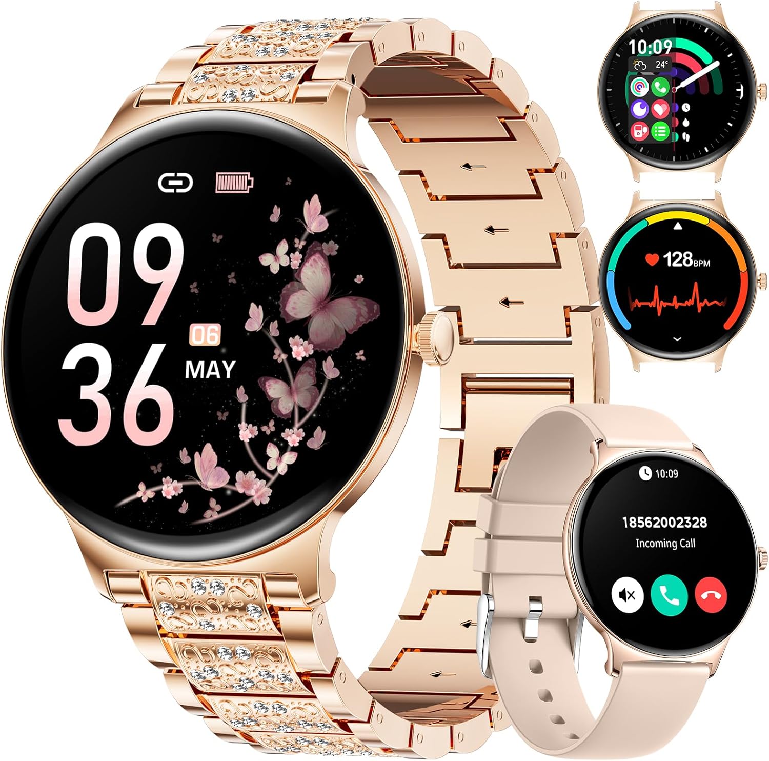 Smart Watches for Women Ultra Thin with AMOLED Screen, 2 Straps, Make/Answer Call,100+ Sport Modes, IP68 Waterproof Pedometer Android iOS Compatible Woman's Smartwatch with Diamond Band