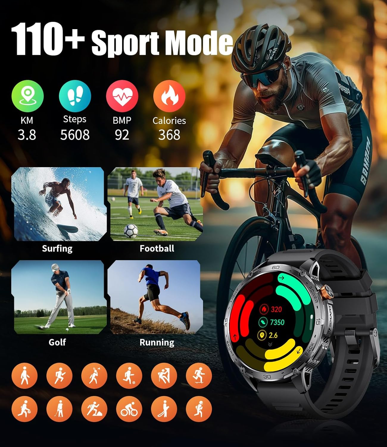 【With 120+ Sport Modes】Smartwatch supports a variety of sport modes including walking, running, hiking, cycling, basketball, badminton, soccer and other outdoor and indoor sports. Smart watch man can meet users' sports needs in different scenarios. It supports recording steps, distance, calories and other sports data.IP68 waterproof design, also built-in stopwatch and timer, make exercise more efficient and fitness more convenient.