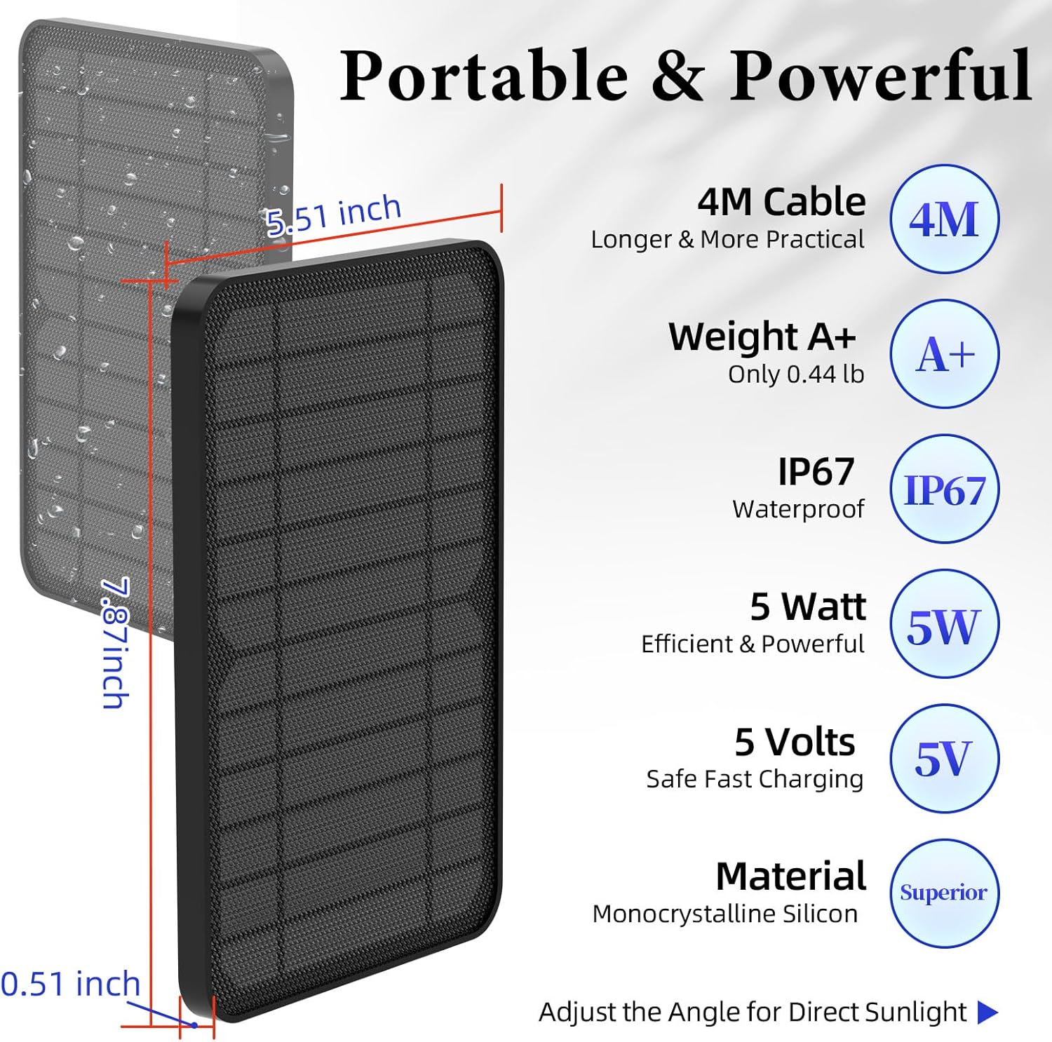 - Charging Efficiency - This solar panels provide a power output of 5W (Max), which is more efficient and faster than regular solar panels. PACKAGE LIST: 1 X Solar panel ( 13ft cable) ,1 X 360°secure mount bracket,3 X Installation screws,10 X Stickers. The solar panel is made of single crystal silicon,converts solar energy into electricity with high efficiency,strong power from the sun for extra power for night and the cloudy days