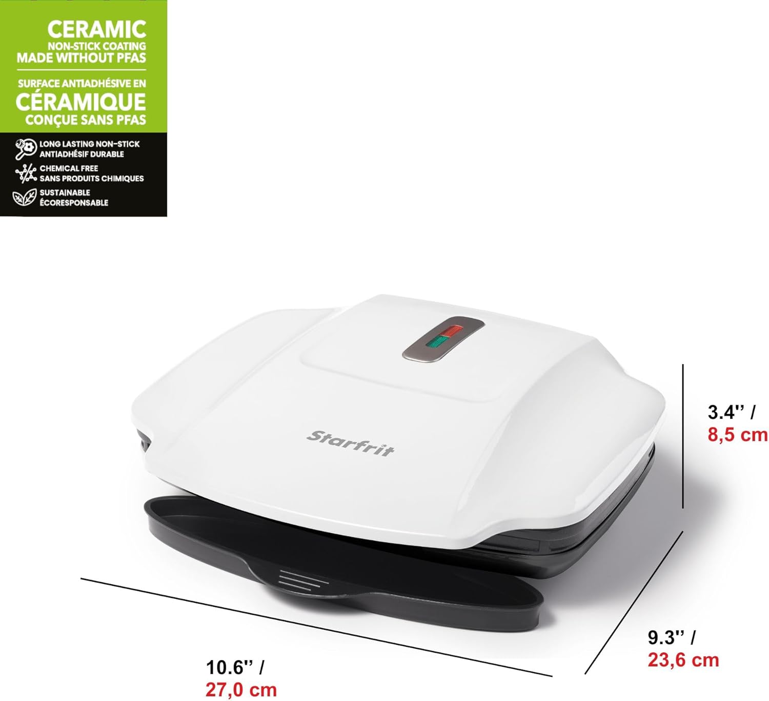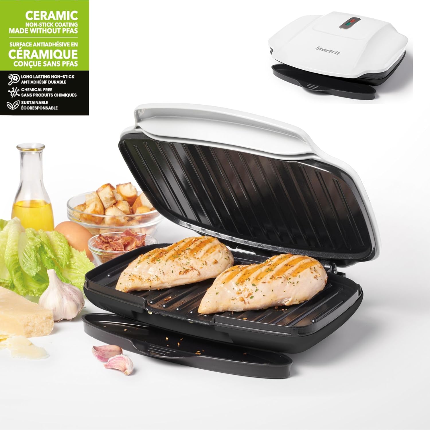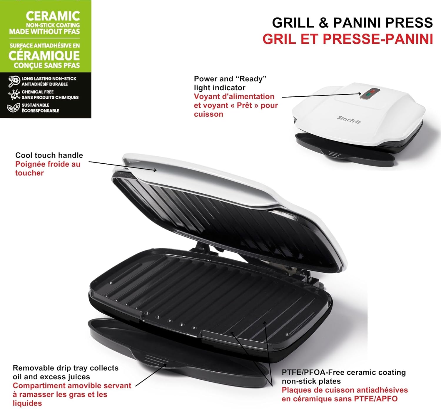 Starfrit Grill And Panini Press With Ceramic Coating - Non-Stick Coating - Removable Fat And Oil Collection - White