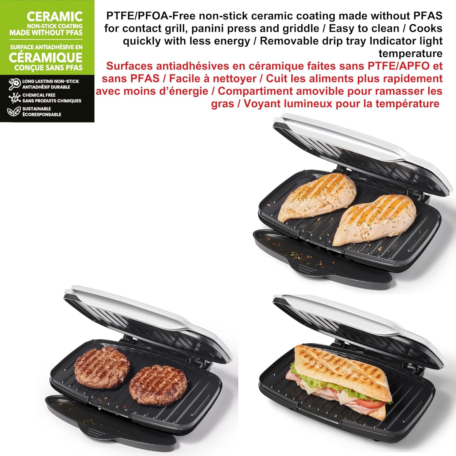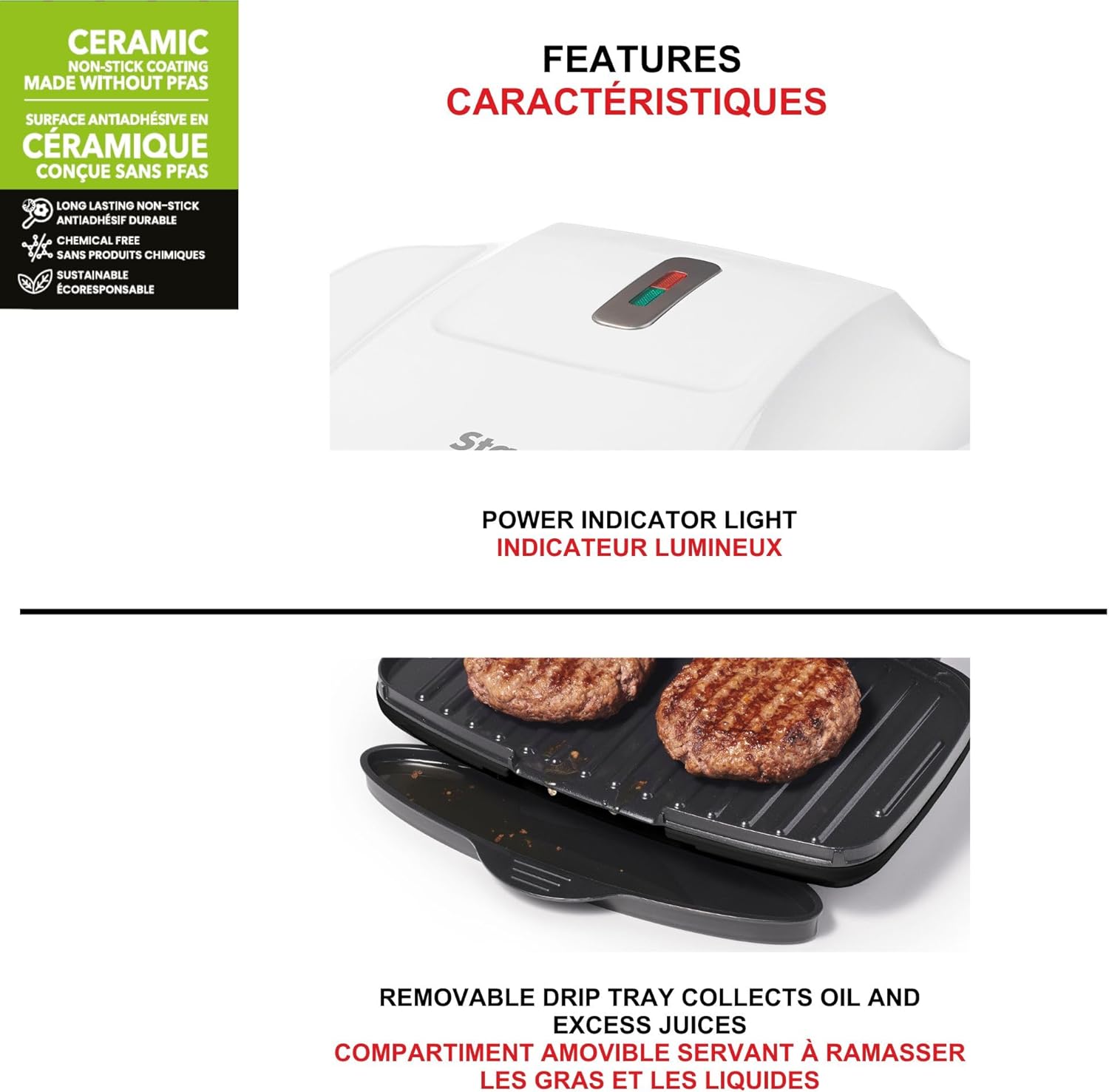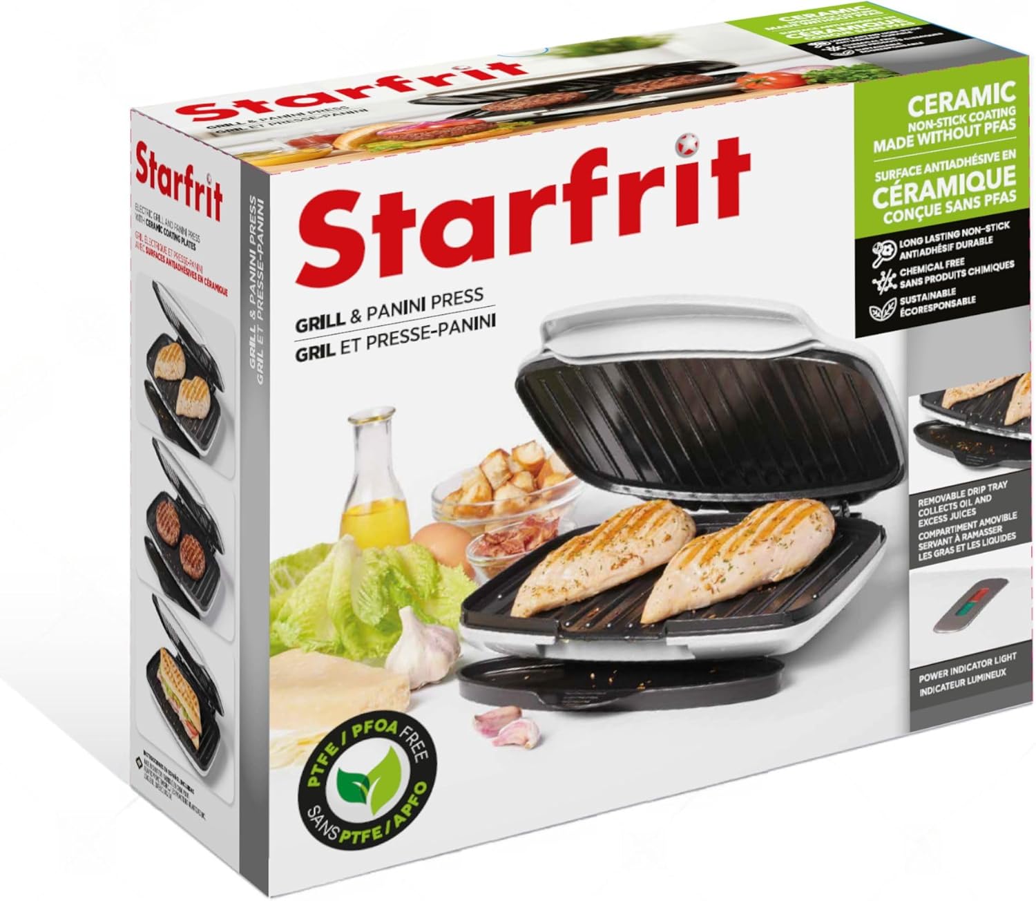 Starfrit Grill And Panini Press With Ceramic Coating - Non-Stick Coating - Removable Fat And Oil Collection - White