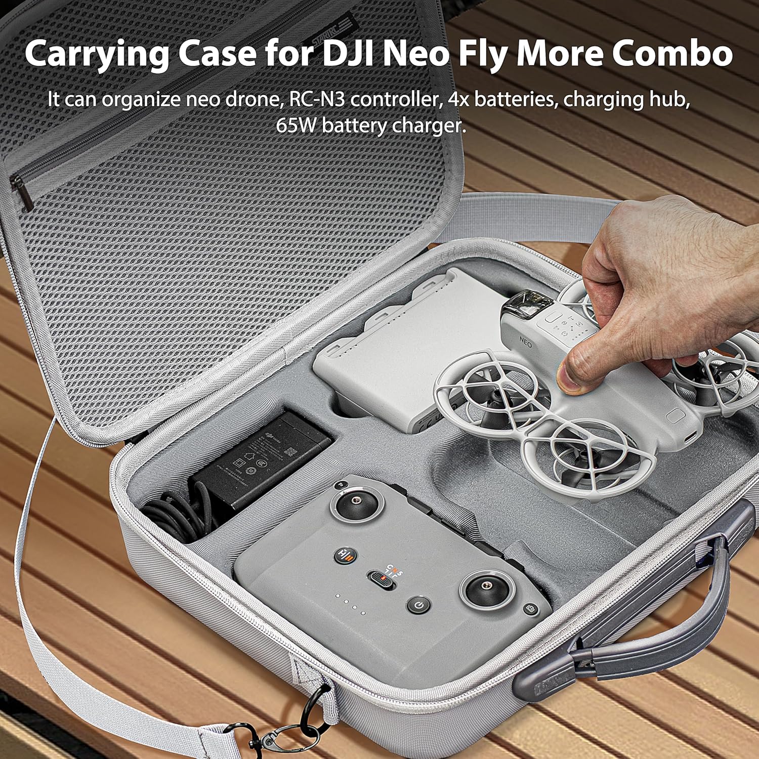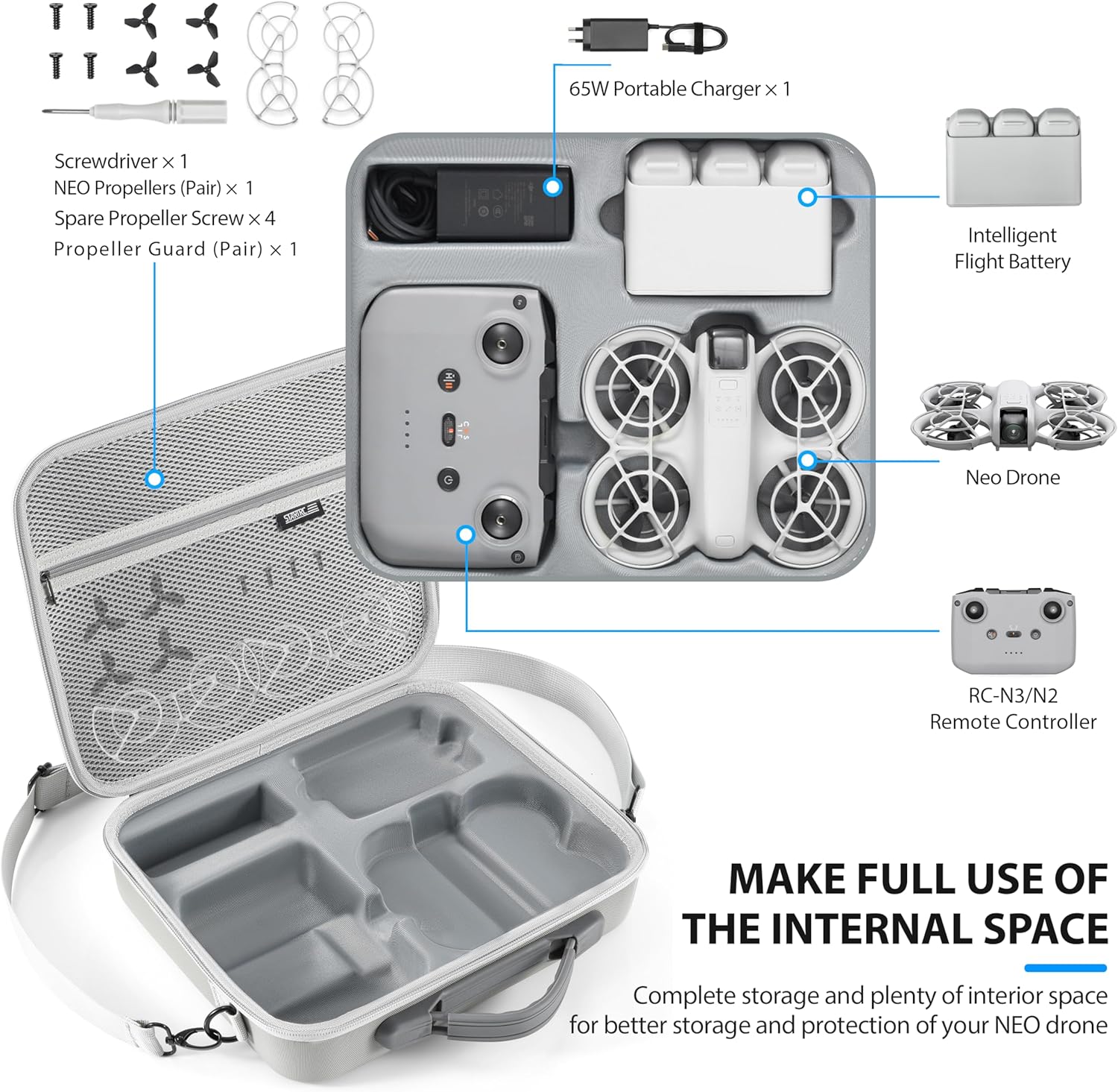 - Carry Case for DJI Neo:The STARTRC portable shoulder case is designed for DJI Neo drone and accessories. It can organize drone neo, RC-N3/N2 controller,3x batteries, battery charging hub, filter set, propellers, cable and other accessories