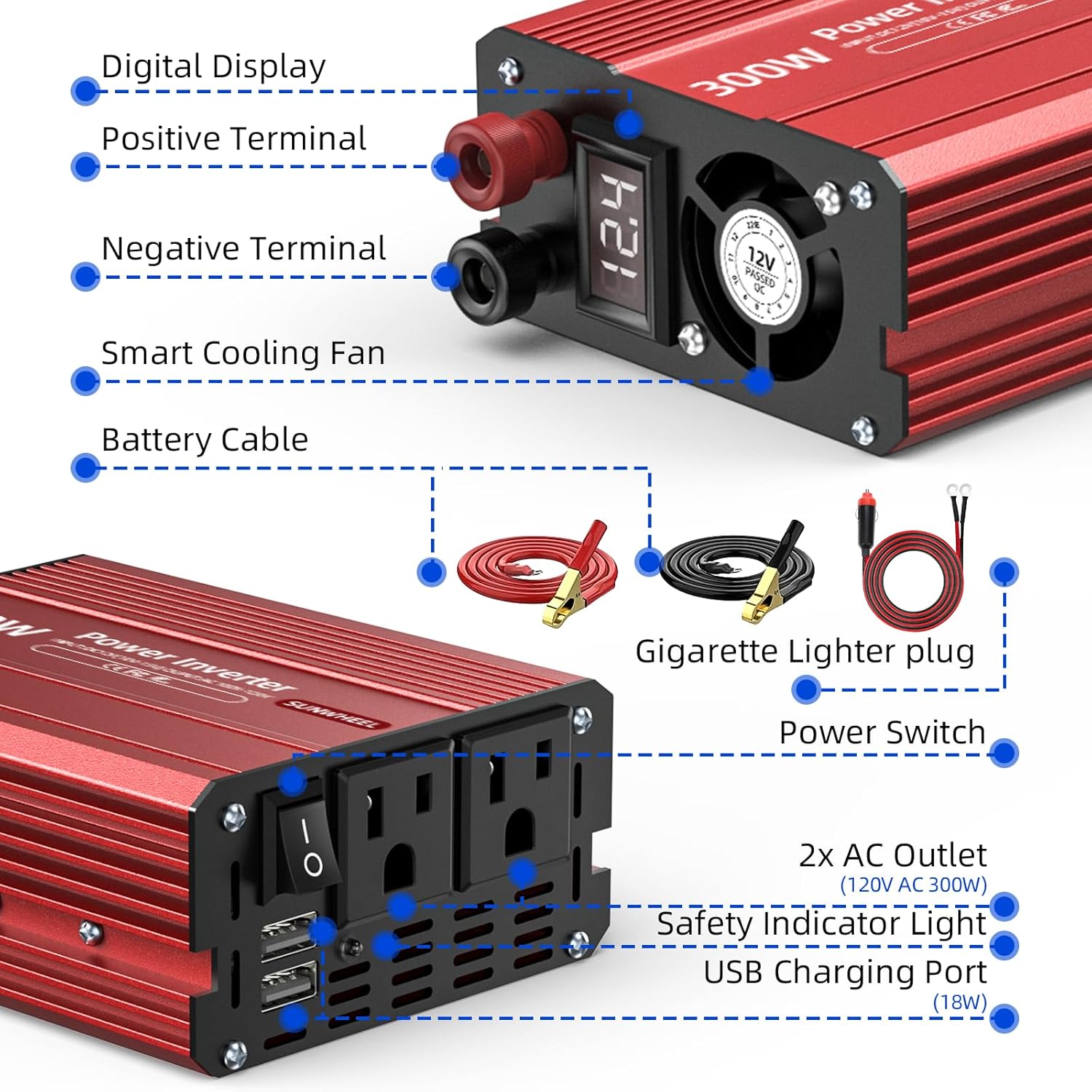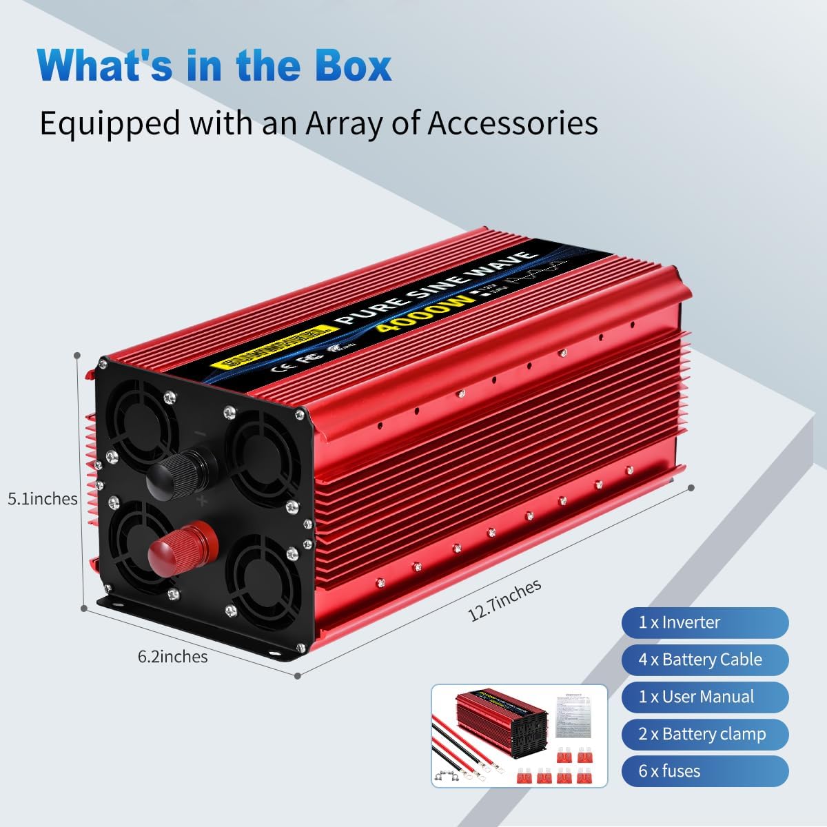 - 【What You Get】Package includes 1x 4000W Pure Sine Wave Inverter, 4x Battery Cables(2x Red,2x Black), 2x Battery clamp,2x clips, 6x Fuses, 1x Instruction Manual