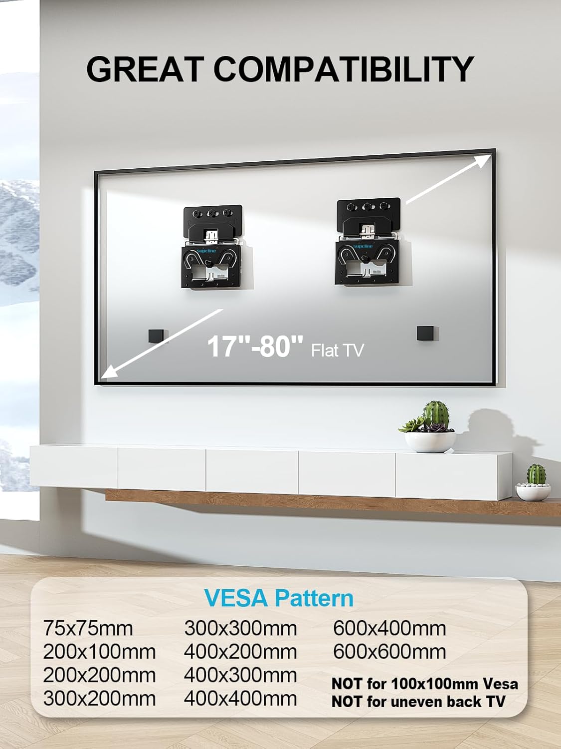 • Wide Compatibility: Perfectly tailored for 14"" to 80"" 4K LED/LCE/OLED flat/frame TV, this mount supports single-wall panel installations with 75×75mm VESA and dual-wall panel setups from 200×100mm up to unlimited sizes. Widely compatible with TCL, Samsung, Sony, Panasonic, Toshiba, Sharp, LG, Philips, JVC, and more brands frame TV. (Not for 100x100mm VESA.)