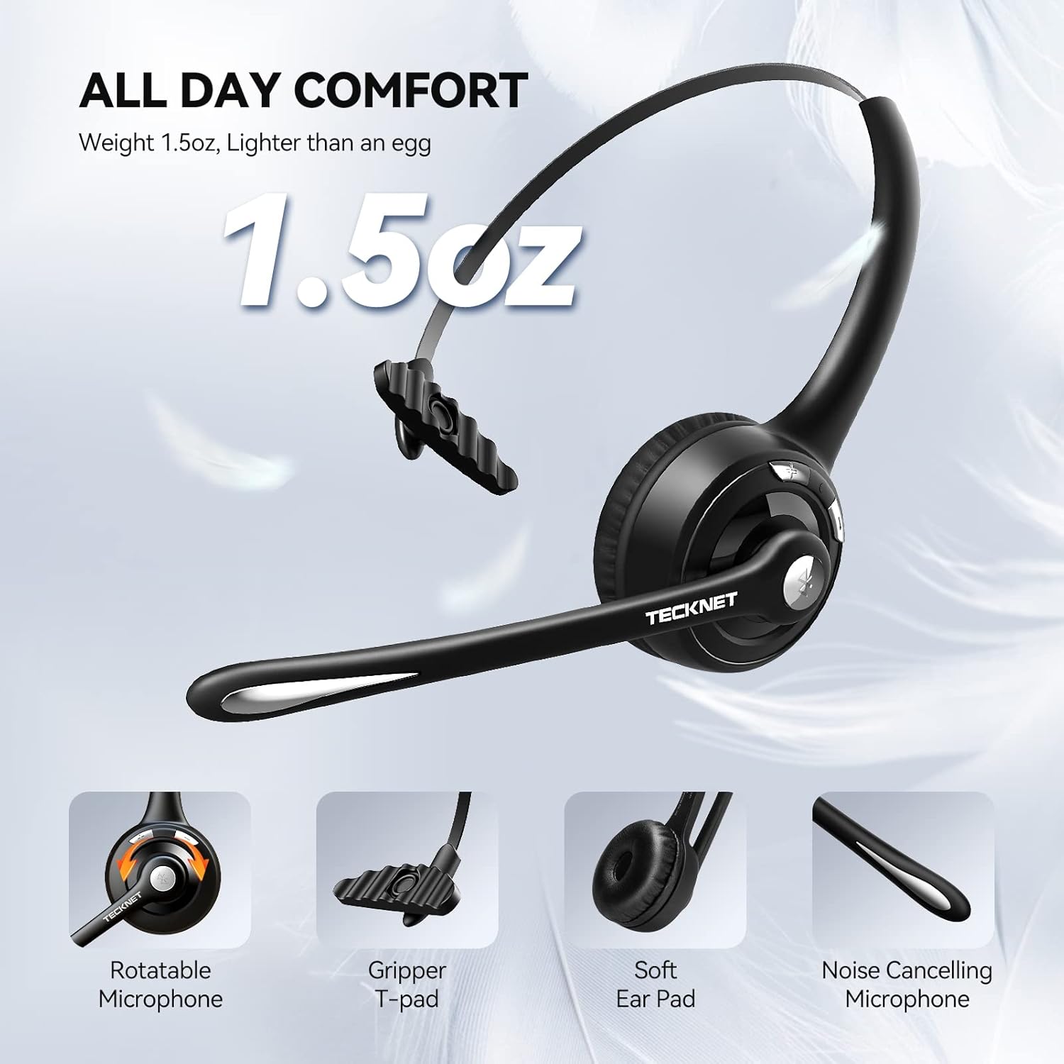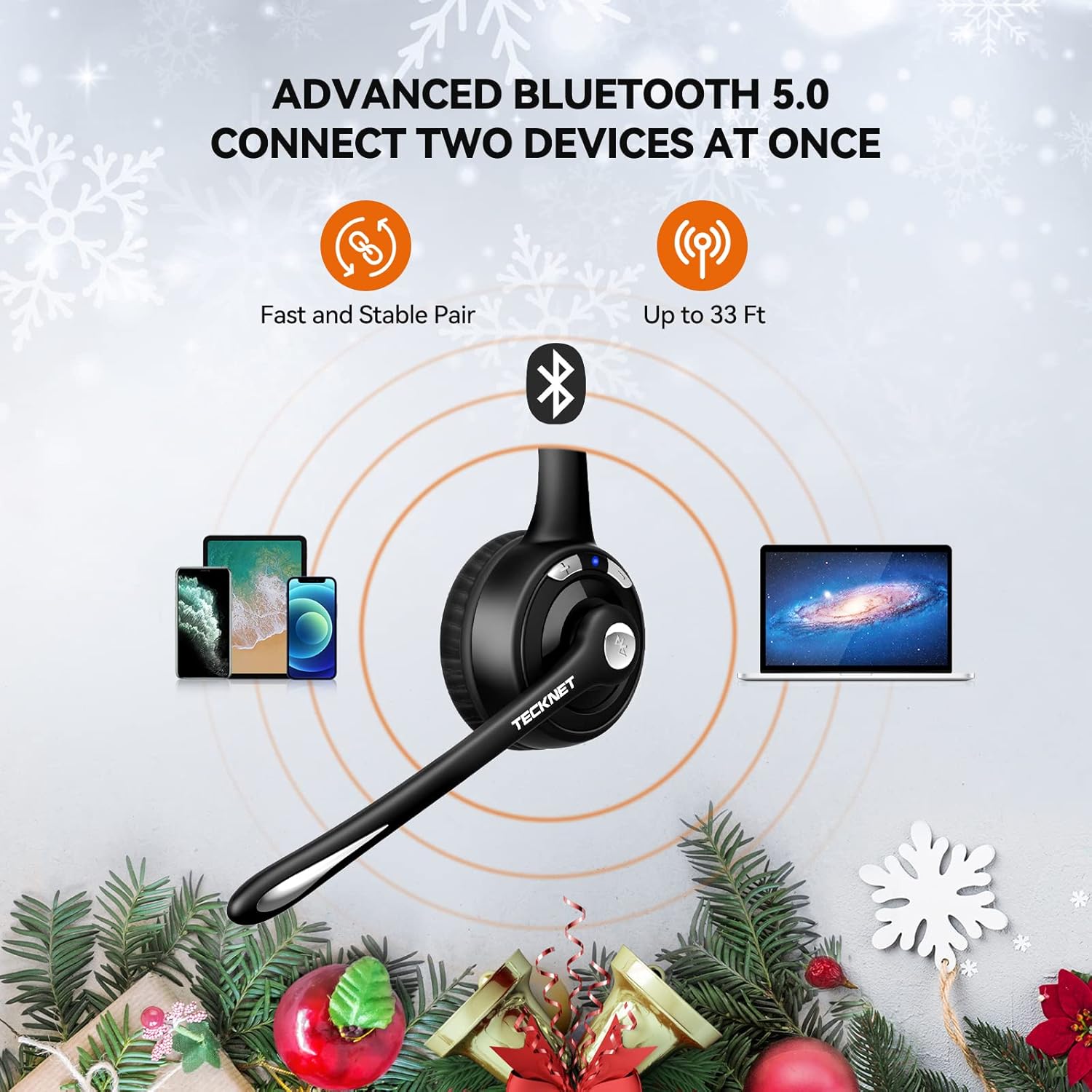 TECKNET Wireless Headset, Bluetooth Headphones with Noise Cancelling Microphone for Trucker, Hand Free Wireless Headset with Mute Mic for Cellphone/PC/Home/Office/Call Center