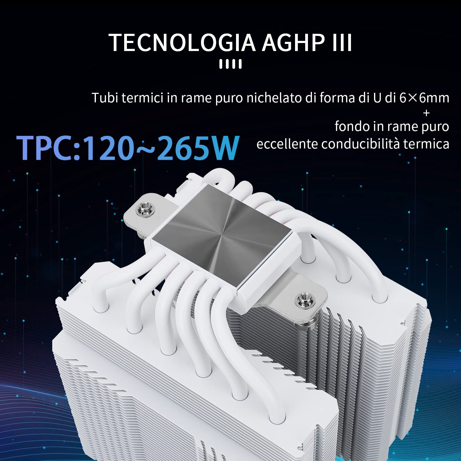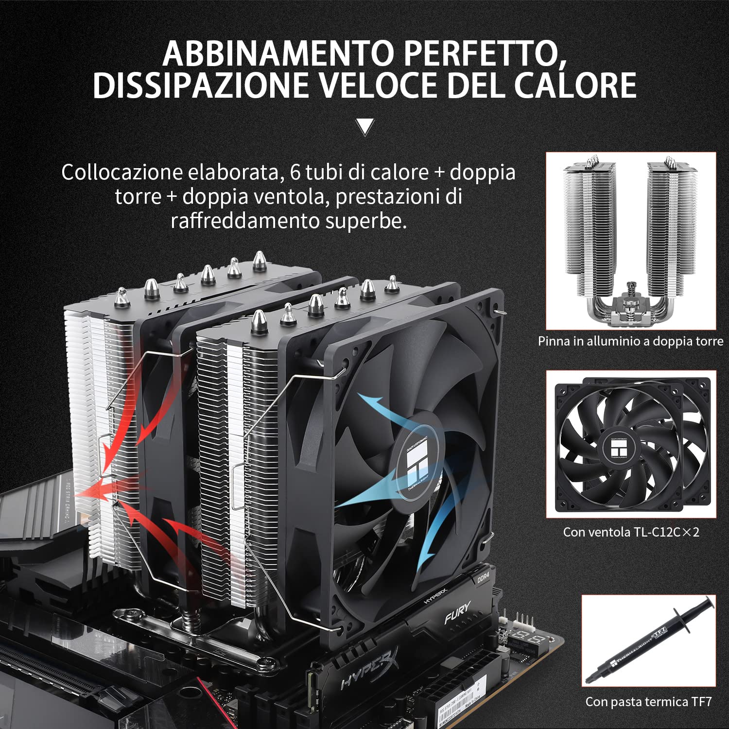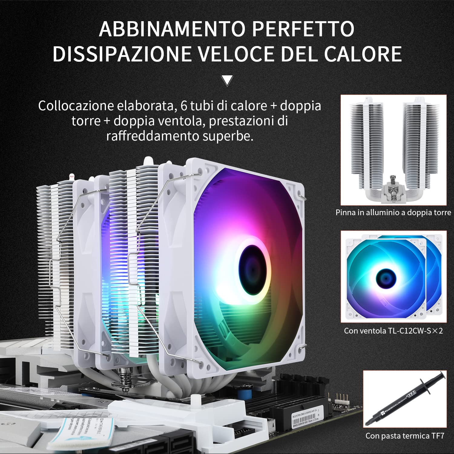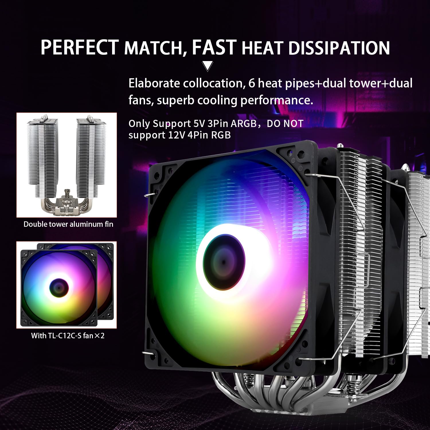 • [Dual PWM Fans] TL-C12C Reverse Fan*2; Standard size PWM fan: 120x120x25mm (4.72x4.72x0.98 inches); Fan speed (RPM): 1550rpm±10%; Power interface: 4pin; Voltage: 12V; Air volume: 66.17 CFM (MAX); The noise value is≤25.6dB (A), and dual fans can provide stronger air flow, further improving the heat dissipation effect of the cpu cooler.