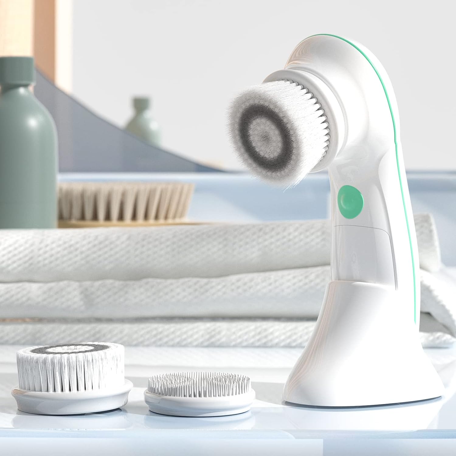TOUCHBeauty Facial Cleansing Brush Electric, Face Cleansing Brush with Stand, 3 Brush Heads, 2 Speeds, IPX5 Waterproof, Battery-Powered, Suitable for All Skin Types, AG-0759D, White