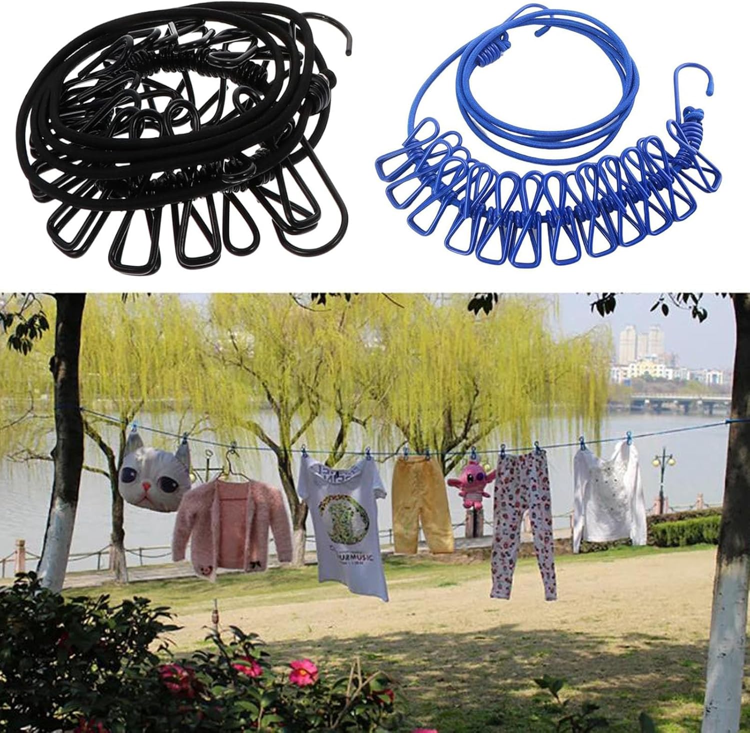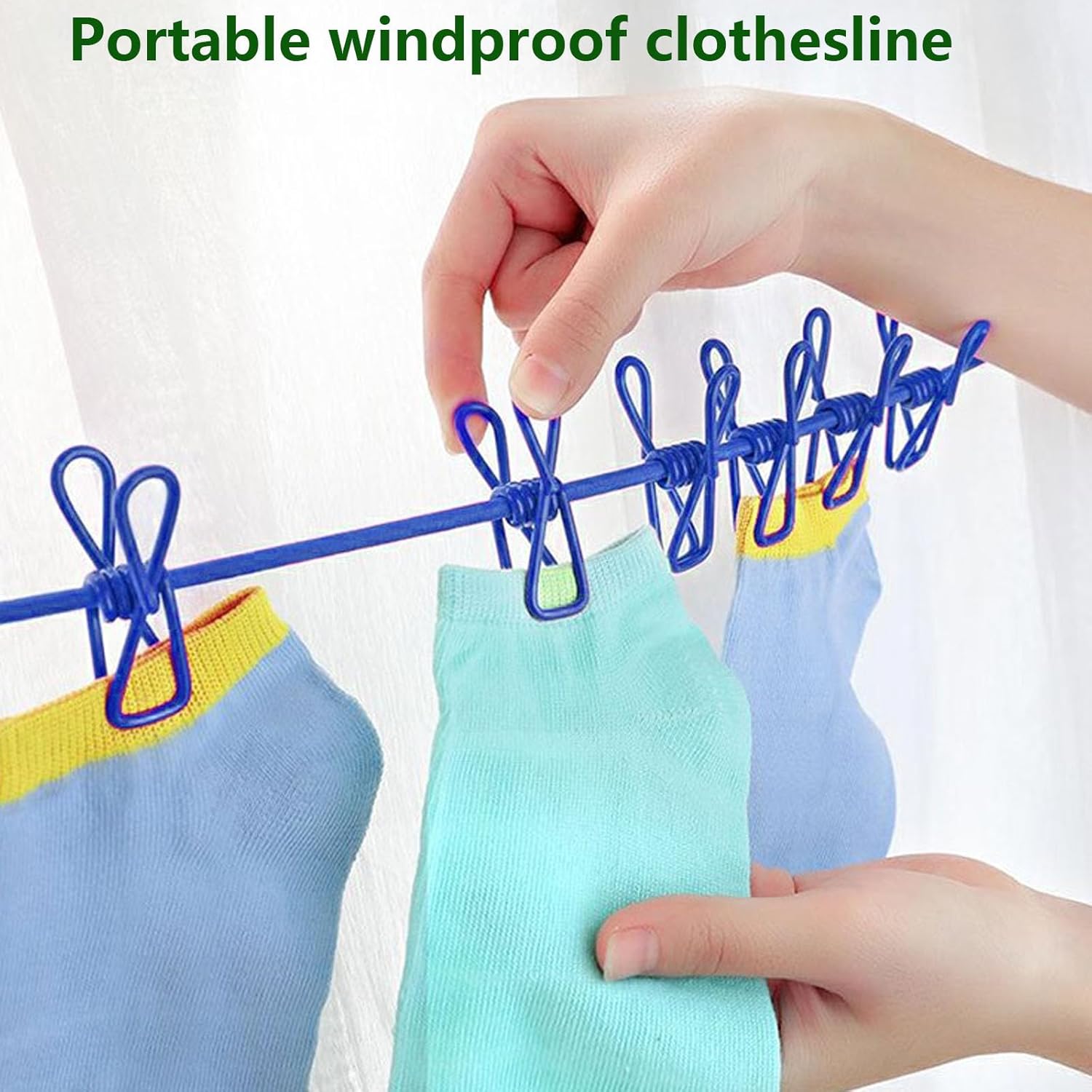 Made from high-strength elastic and equipped with powerful hooks and clips, this clothesline holds up in any condition—whether tied between trees or balcony railings. -