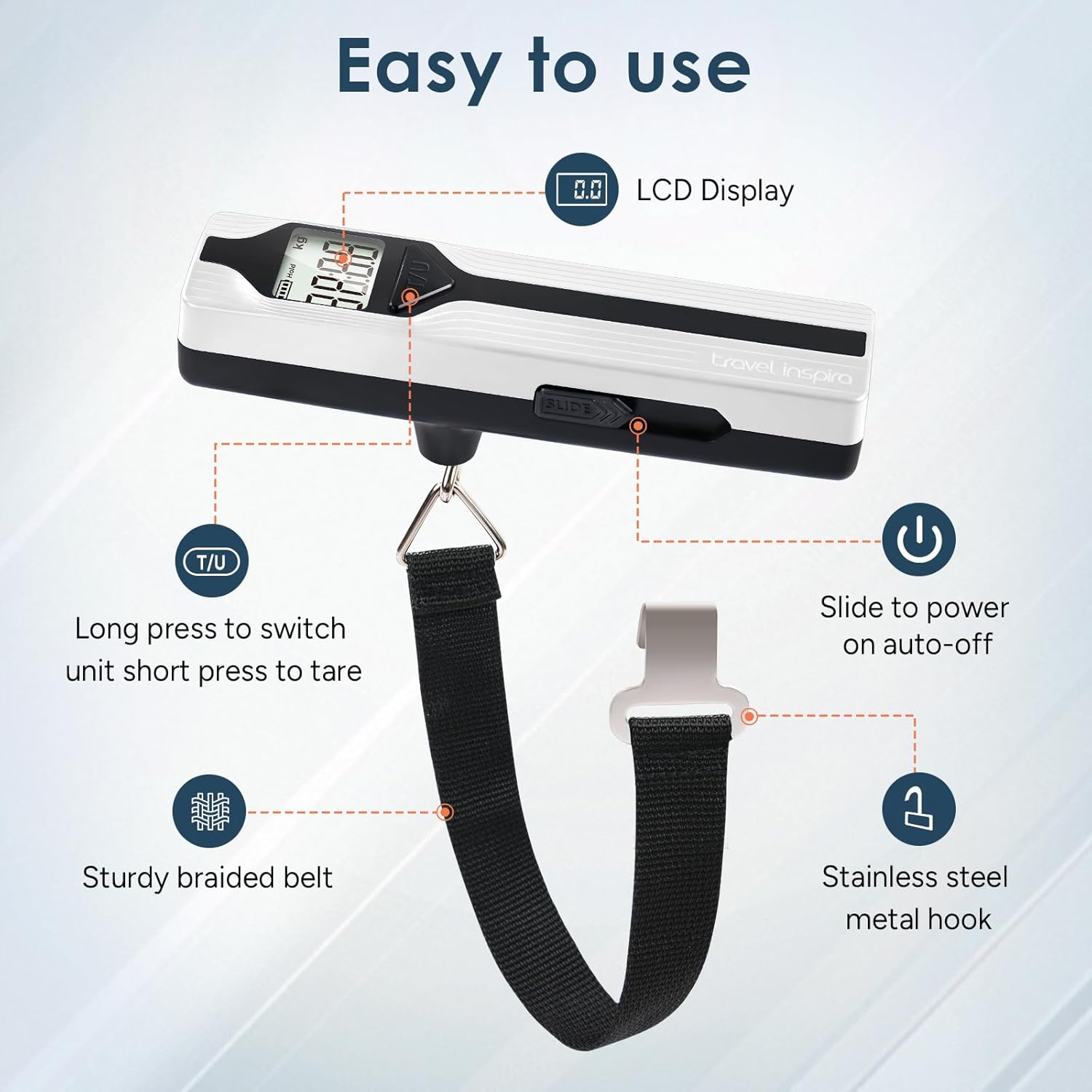 - EASY TO USE: Only quickly push the side button 4-5 times, long press the U/T button to convert the unit lb/kg. Accurate measurement, Unit conversion, Overload warning, Tare function so you never pay excess baggage fees again