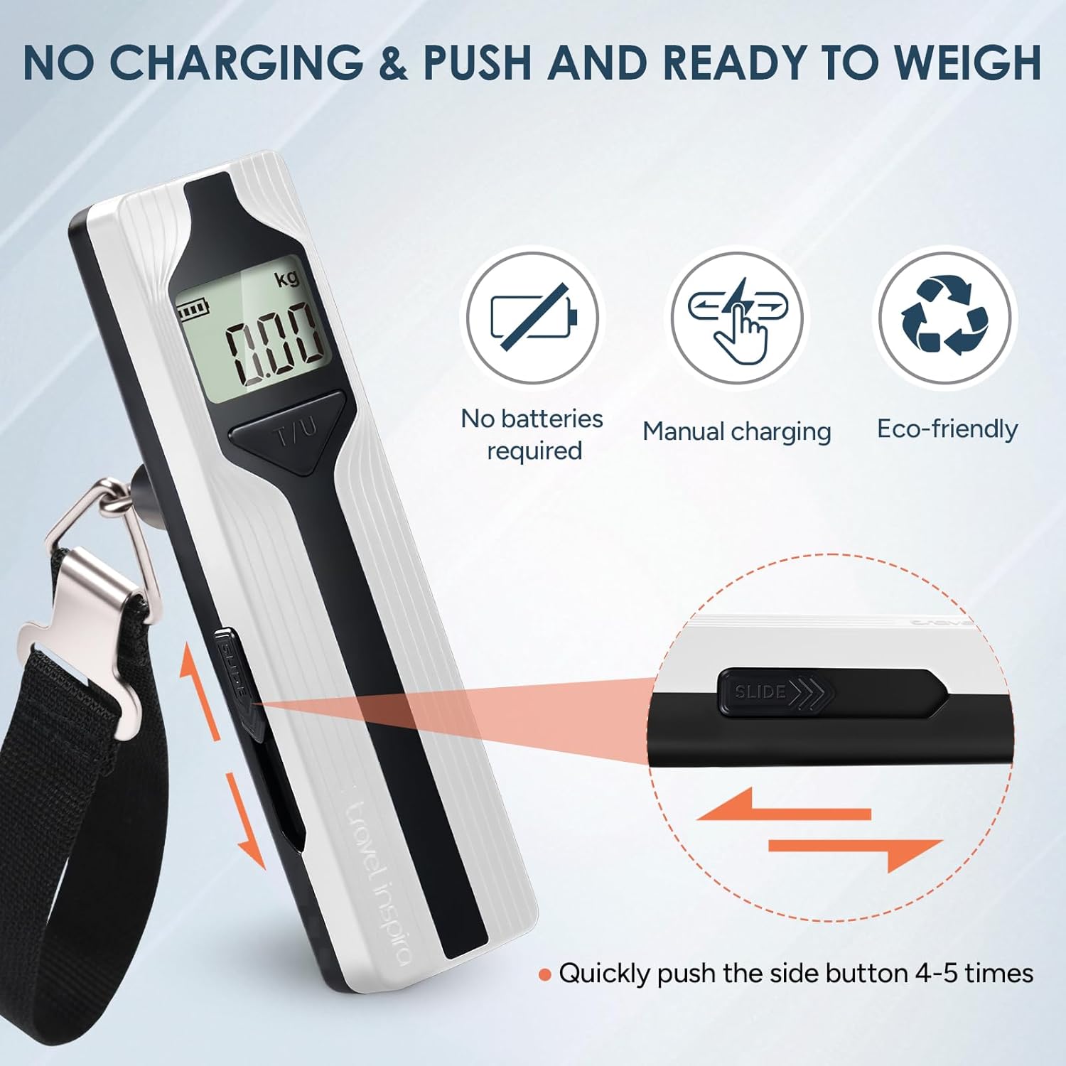 - BATTERY-FREE: Simple button push dynamo power, you can say goodbye to the battery to reduce carbon emissions. An environmentally friendly alternative to batteries. No dead or leaking batteries. The kinetic energy would be converted to electric power to get your luggage scale running