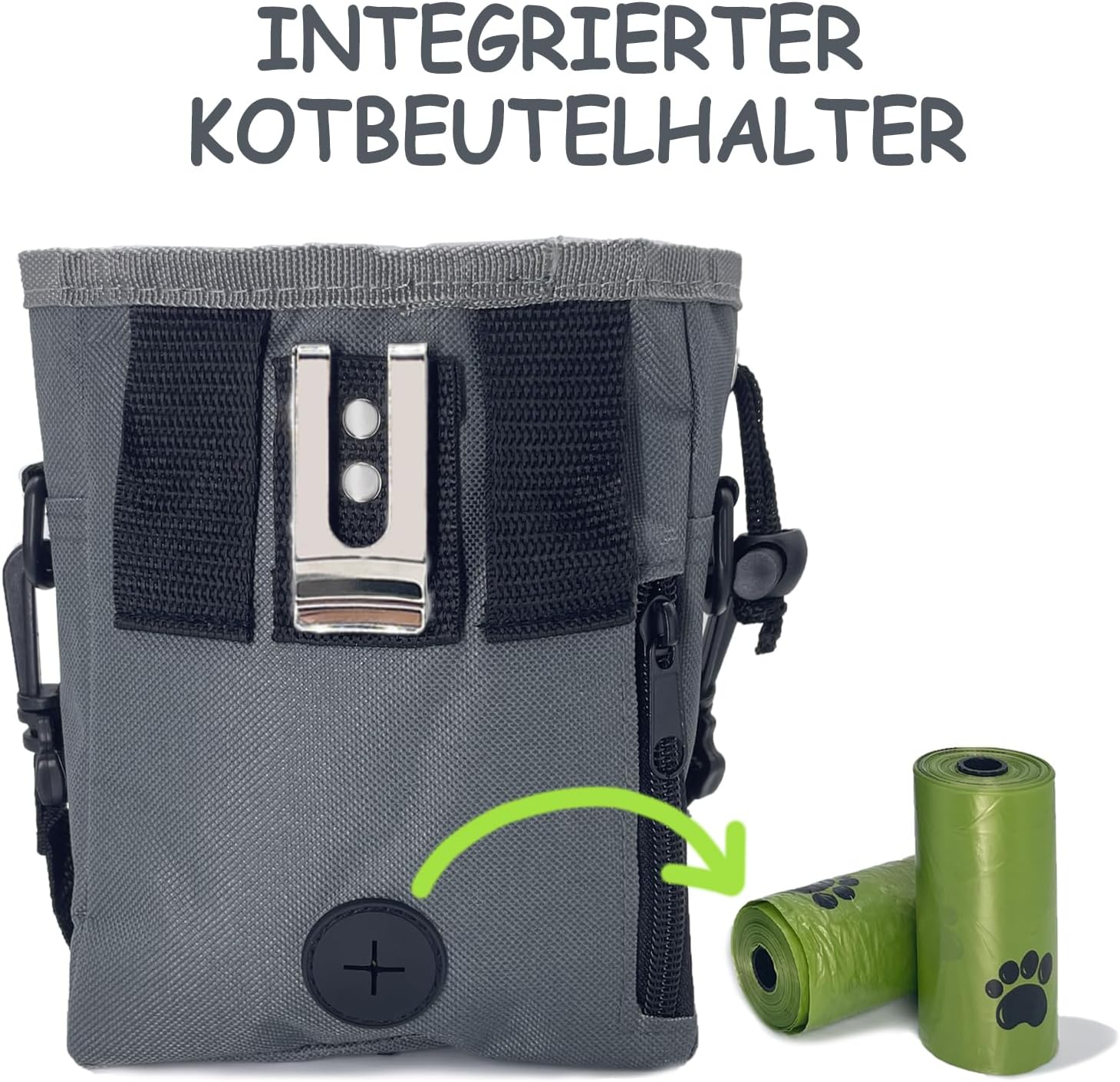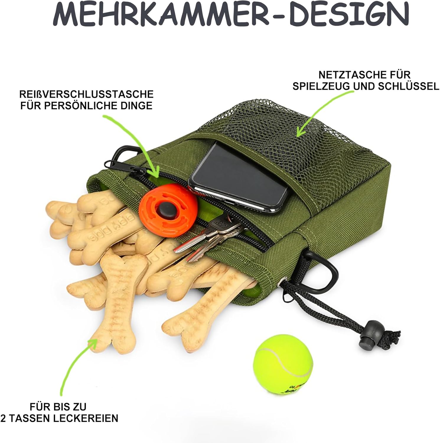 - HIGH CAPACITY STORAGE - More than just a treat pouch! This dog treat bag offers multiple compartments to hold your pup’s snacks, toys, your phone, wallet, and keys. The back zippered pocket doubles as a convenient poop bag dispenser.