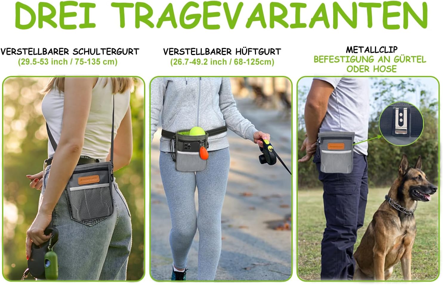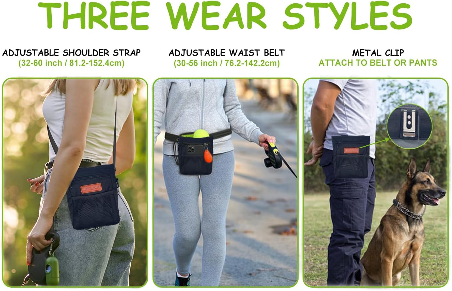 - 3 WAYS TO WEAR - Our dog treat pouches for pet training can be worn around the waist, crossbody, or clipped to your belt or pants. No matter your preference, you can train your dog hands-free and distraction-free.