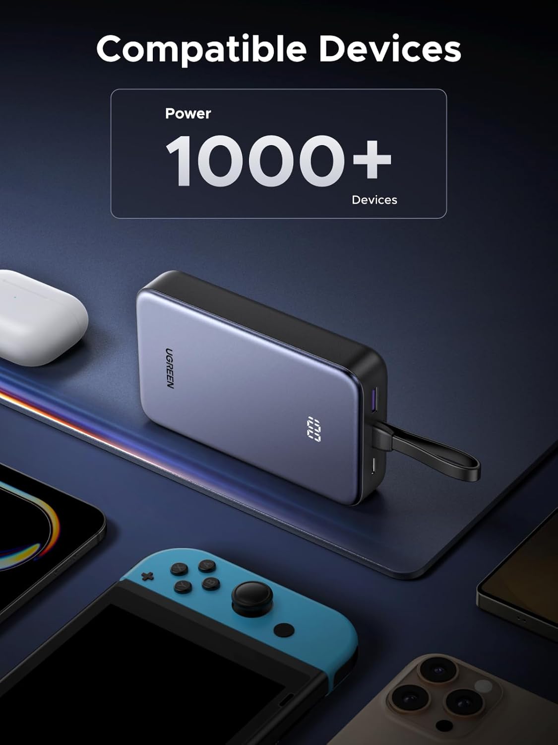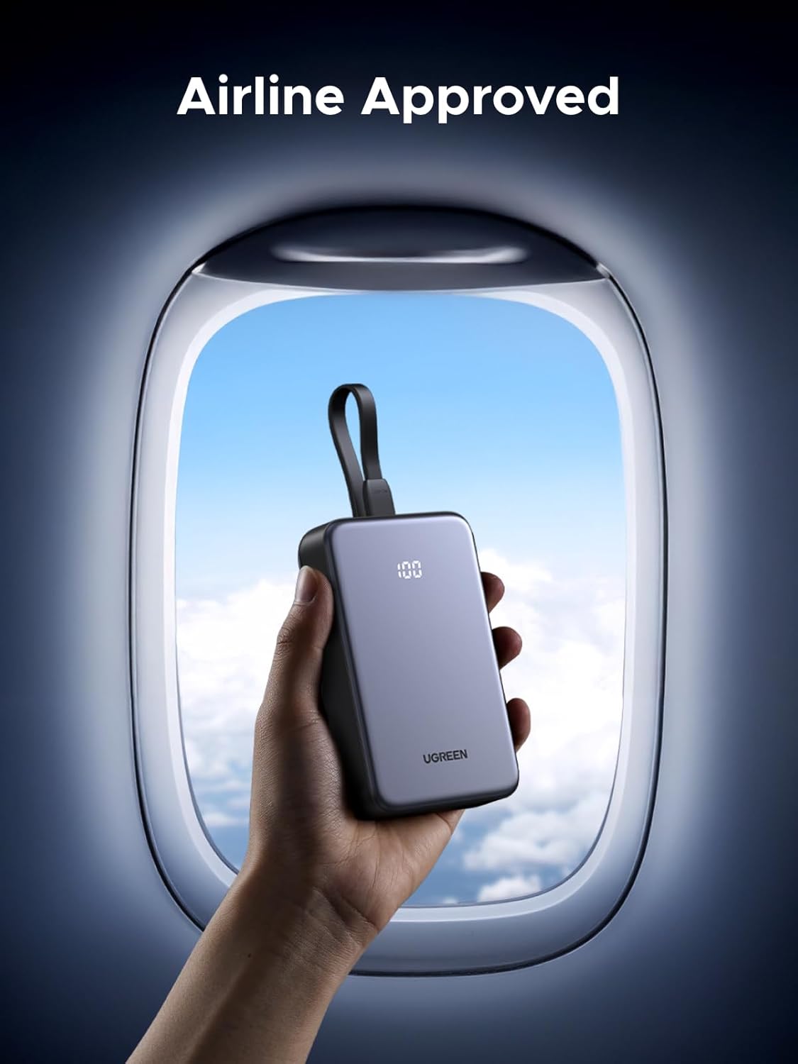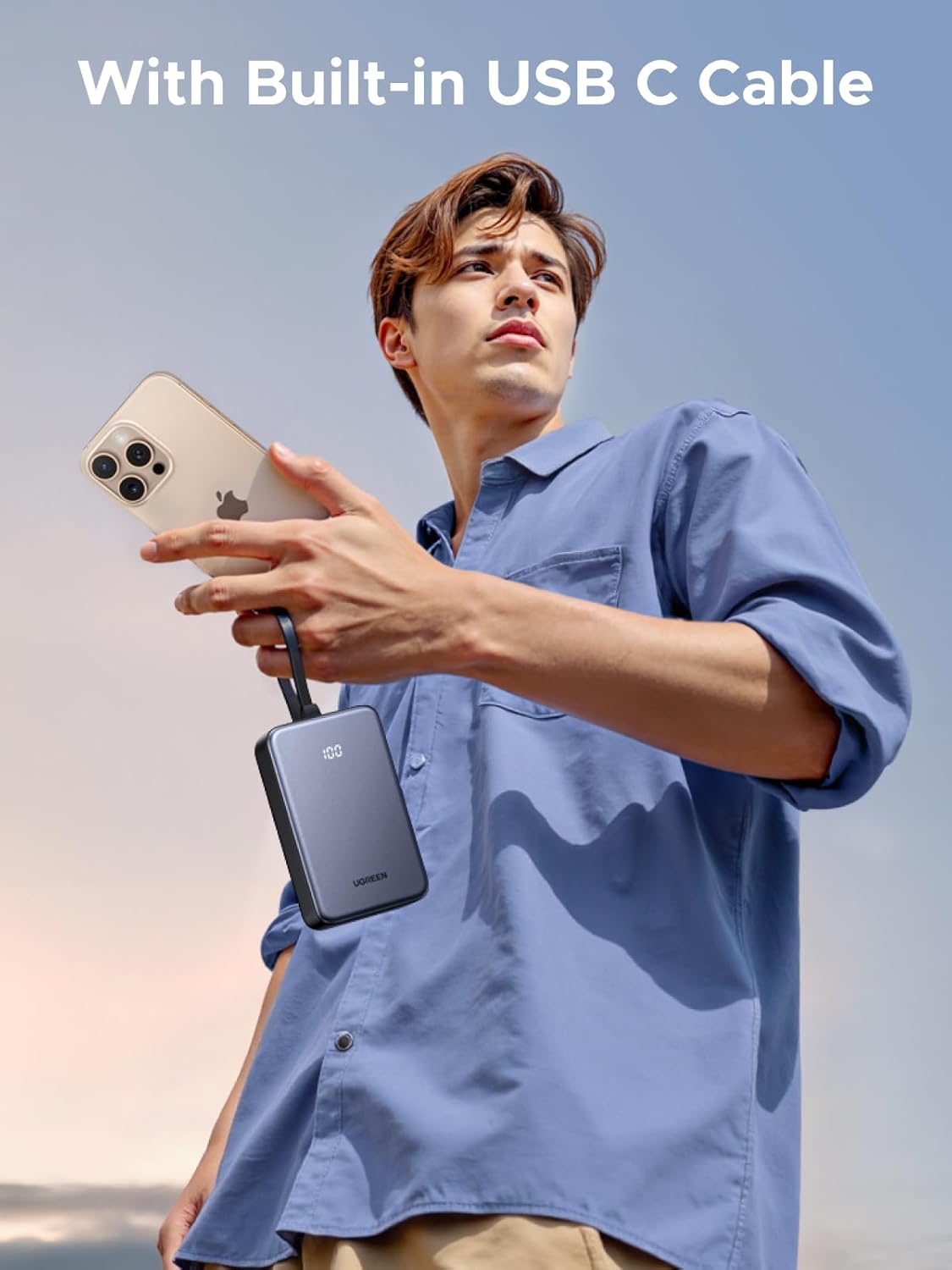 UGREEN 20000mAh 22.5W Power Bank with Built in Cable, USB Type C Portable Charger Battery Pack 3 Output with LED Display Compatible with iPhone 16 15 Pro Max, Galaxy S24 S23, Pixel 8 Pro Series