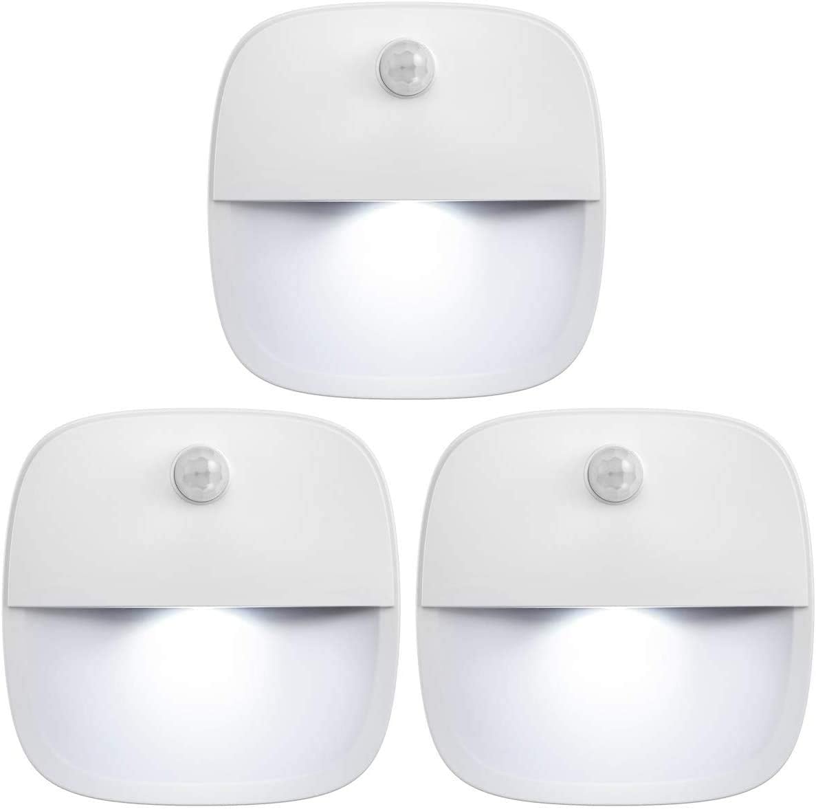 (upgraded) motion sensor light, cordless battery powered LED night light, wall light, closet light, security light for stairs, hallways, bathrooms, kitchens, cabinets (white - 3 pack)