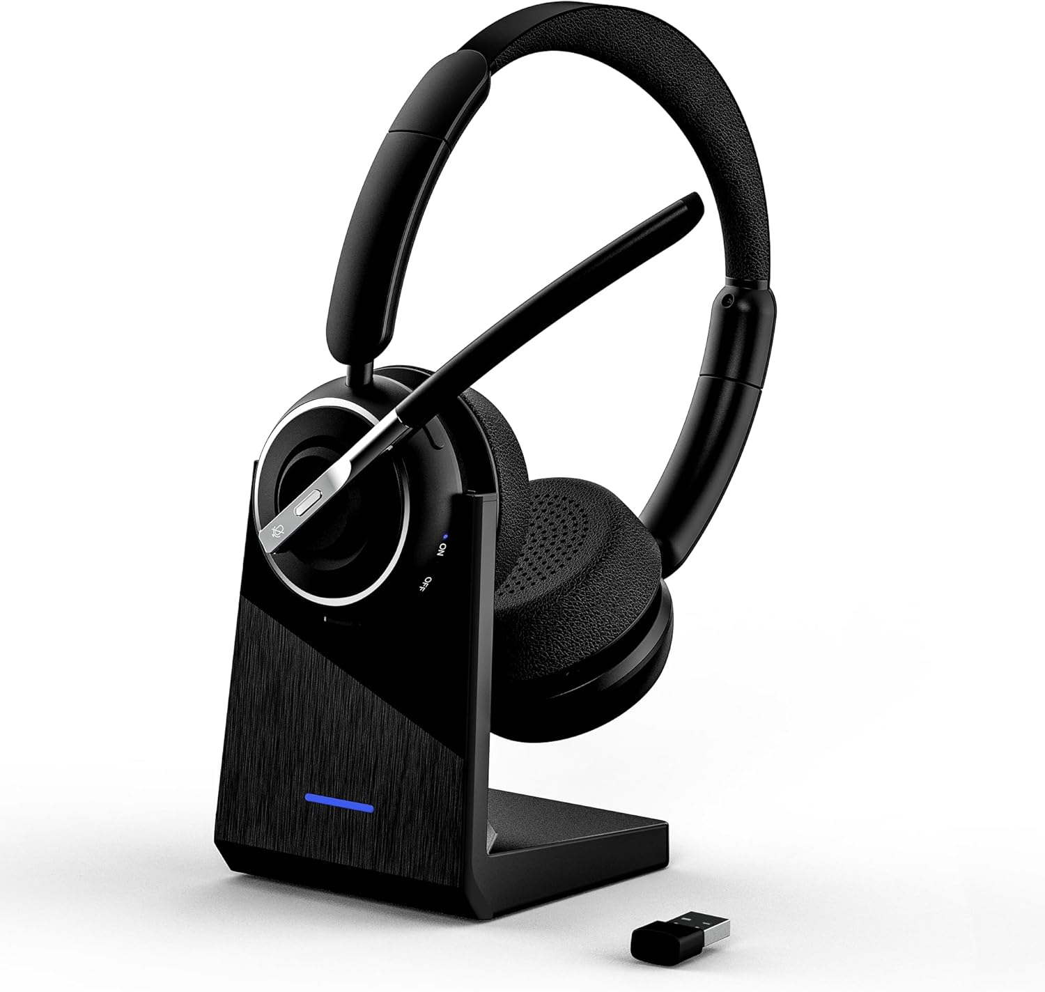 (Upgraded Version) PrancyBt Wireless Headset, Bluetooth Headset with AI Noise Cancelling Mic, Bluetooth V5.2 Headphones with USB Dongle, Charging Base & Mic Mute for PC/Cell Phones/Call Center