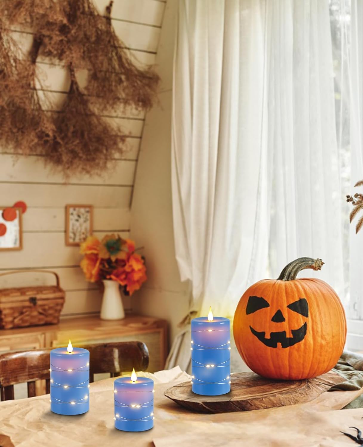 Upinmz Blue Flickering Flameless Candles with Embedded String Lights, Battery Operated Candles with Remote Control and Timer,Flameless LED Candles for Home Decoration,Real Wax, Set of 3