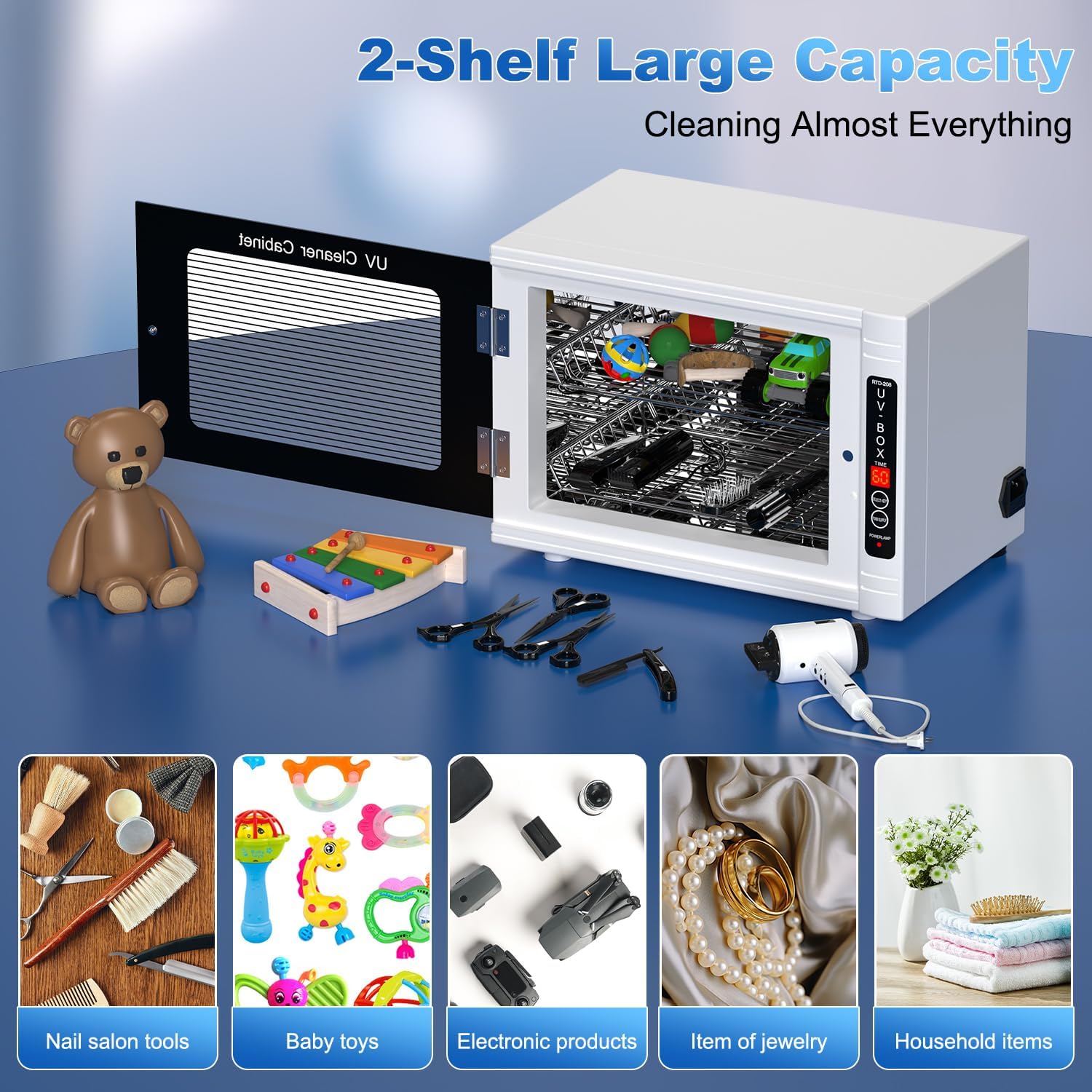 【𝐋𝐚𝐫𝐠𝐞 𝐂𝐚𝐩𝐚𝐜𝐢𝐭𝐲 𝐒𝐭𝐨𝐫𝐚𝐠𝐞】12L large capacity UV cleaning box with 2 spacious removable racks that can accommodate your phone, cutlery, toothbrushes, towels, nail salon tools or barber equipment ect