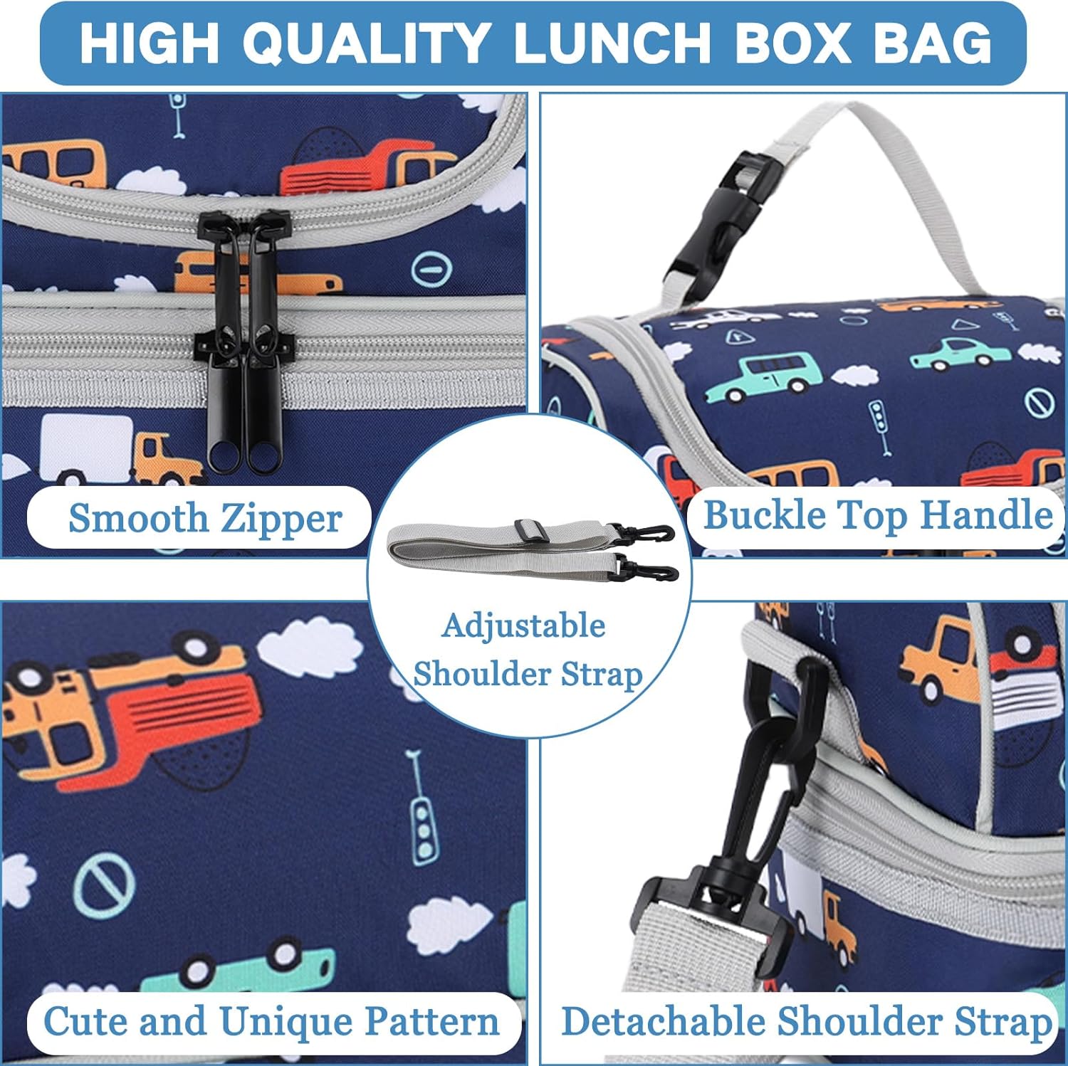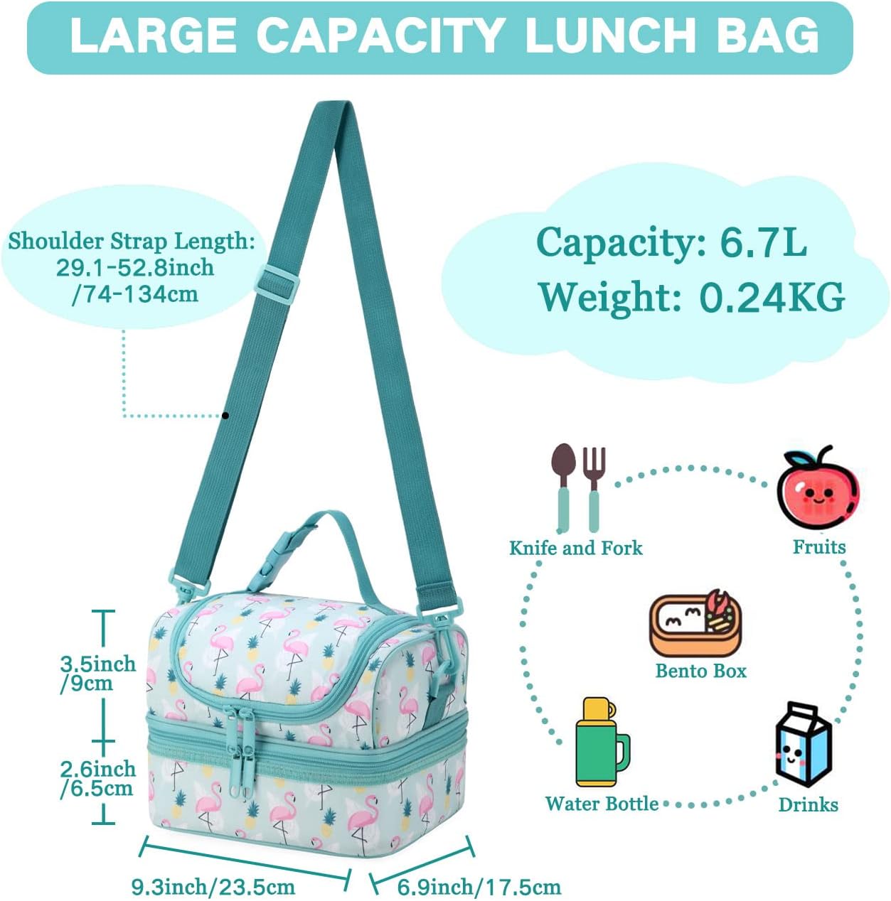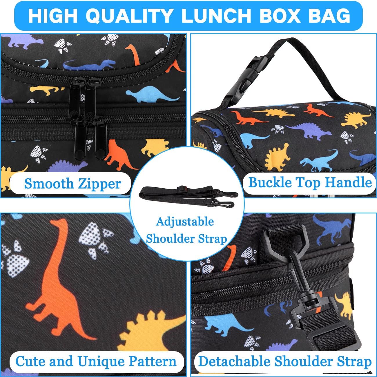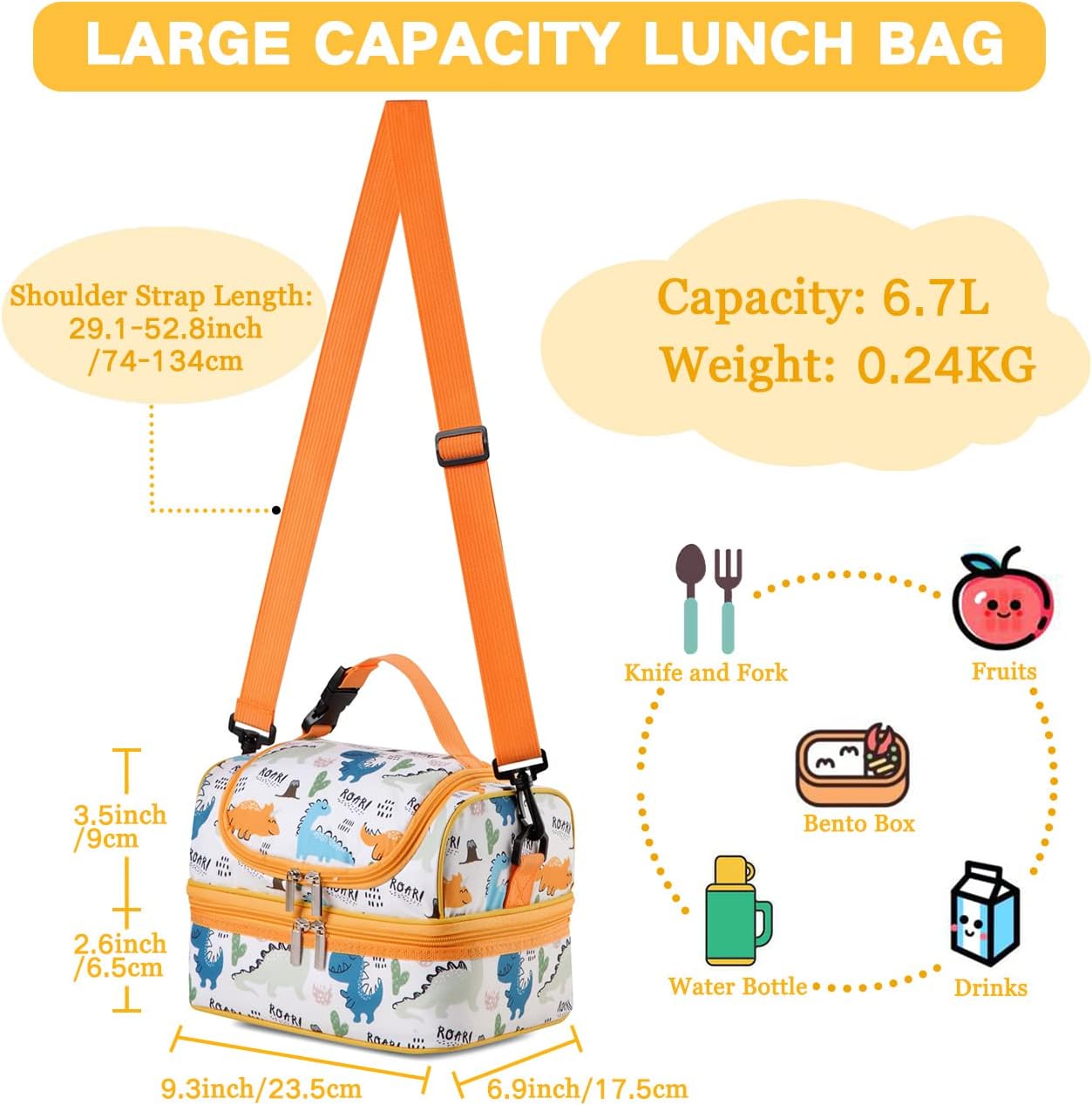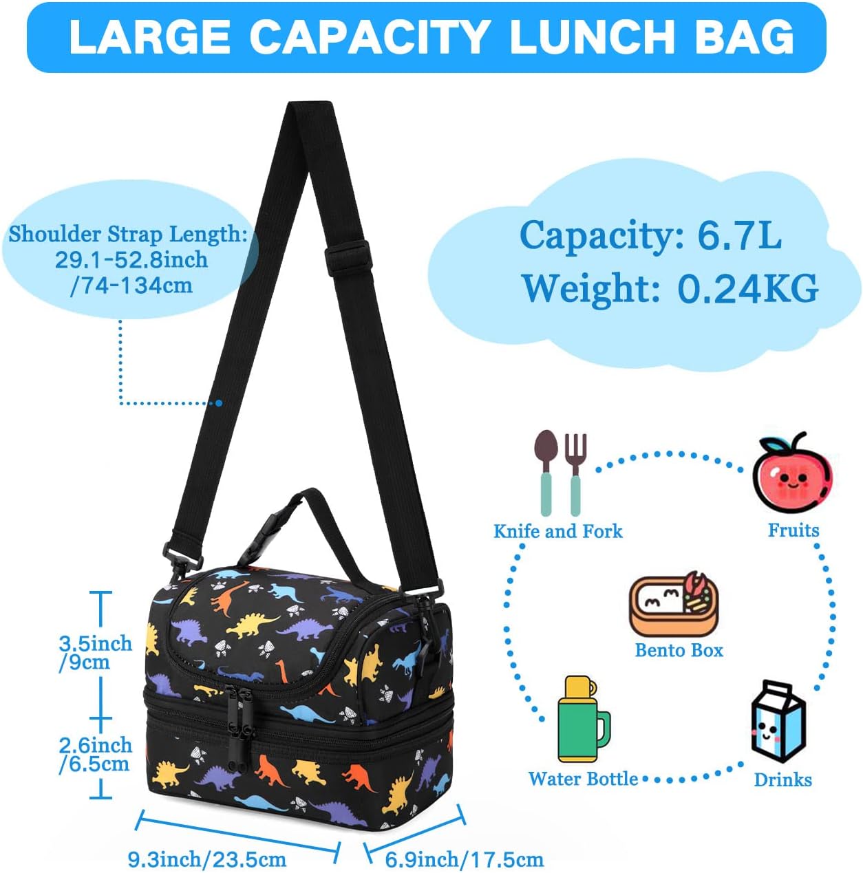 - 🖤SEPERATE COMPARTMENTS: The lunch container tote bag features double compartments,the bottom layer is for bento lunch boxes laying flat,the top compartment is for hot food and the small essentials.It has an insulated wipe-clean interior with plenty of space for sandwiches and snacks.With the detachable adjustable shoulder strap,your little one could hold the lunch bag by hand or by hands-free crossbody way.