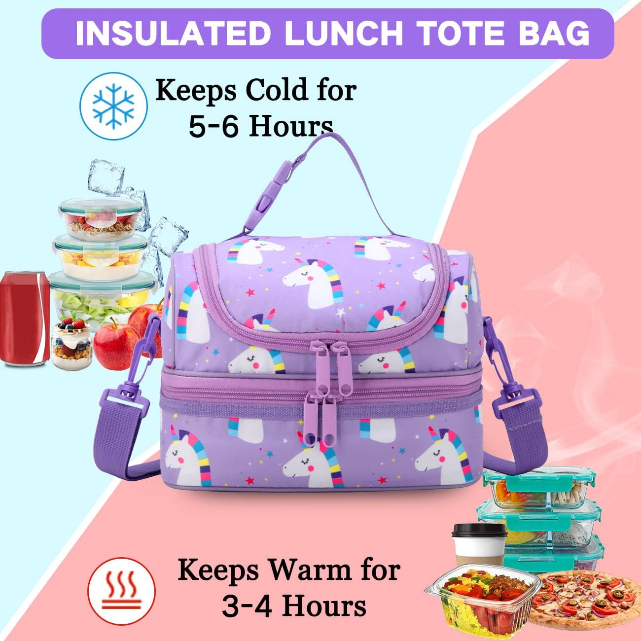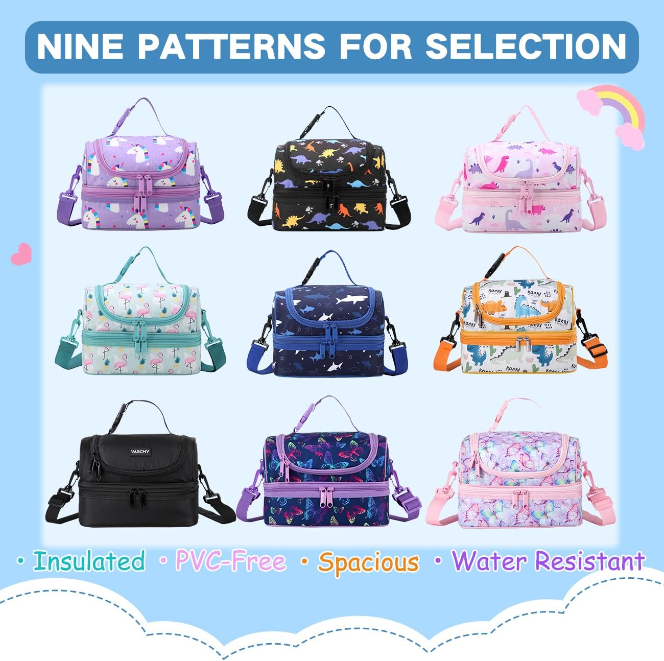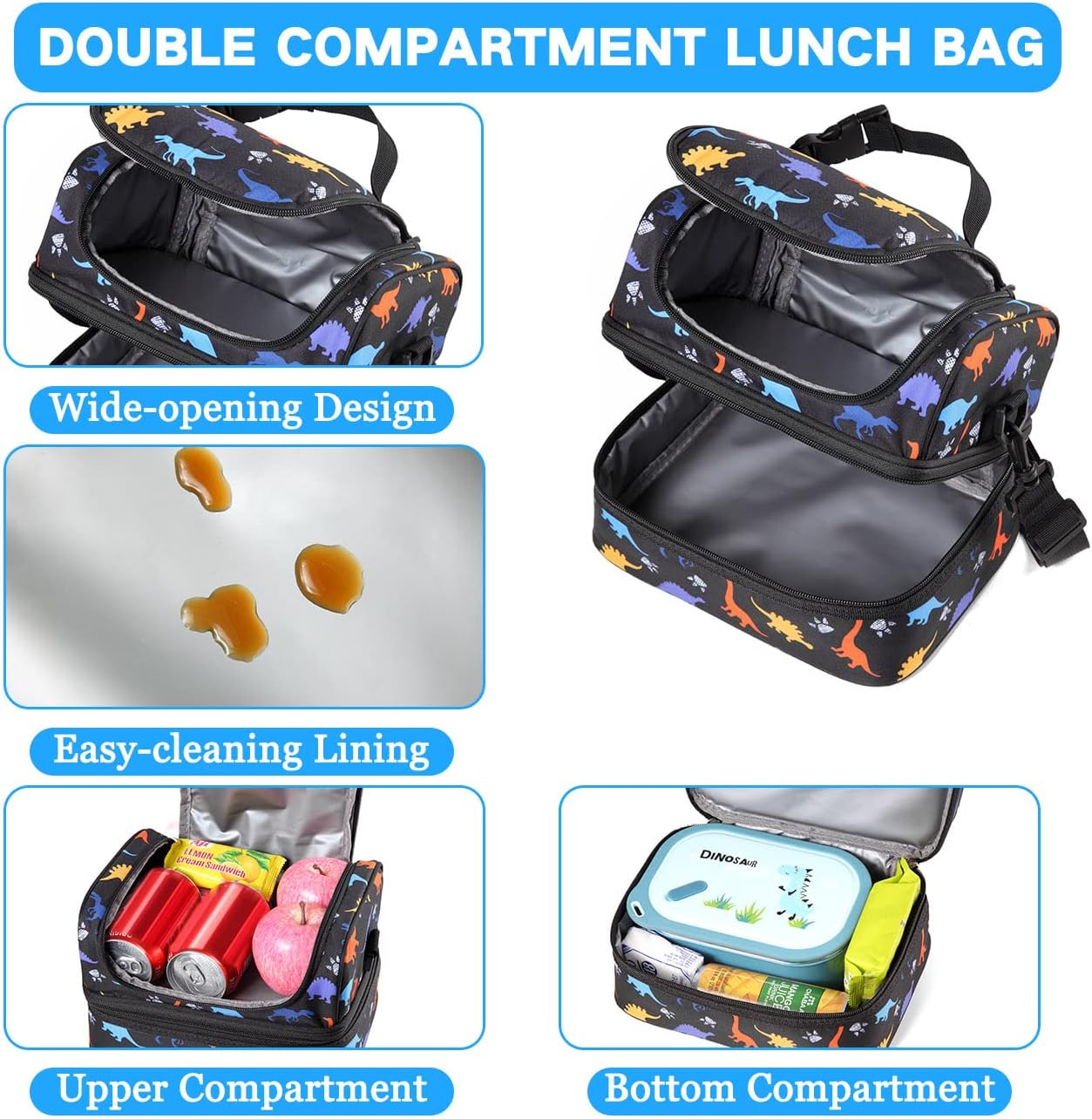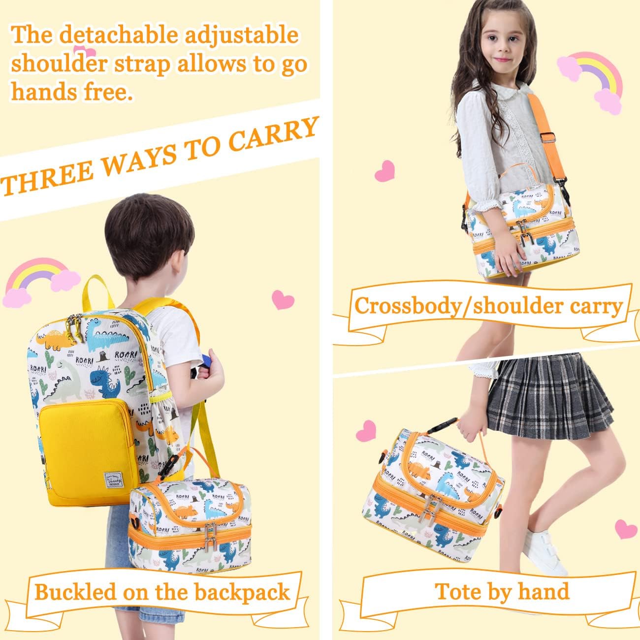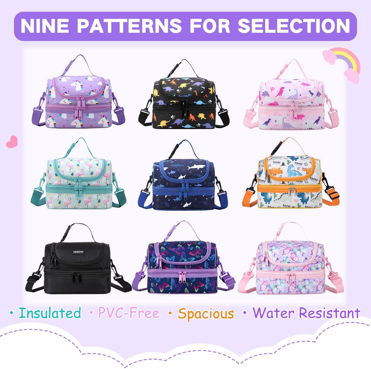 - 🖤SEPERATE COMPARTMENTS: The lunch container tote bag features double compartments,the bottom layer is for bento lunch boxes laying flat,the top compartment is for hot food and the small essentials.It has an insulated wipe-clean interior with plenty of space for sandwiches and snacks.With the detachable adjustable shoulder strap,your little one could hold the lunch bag by hand or by hands-free crossbody way.
