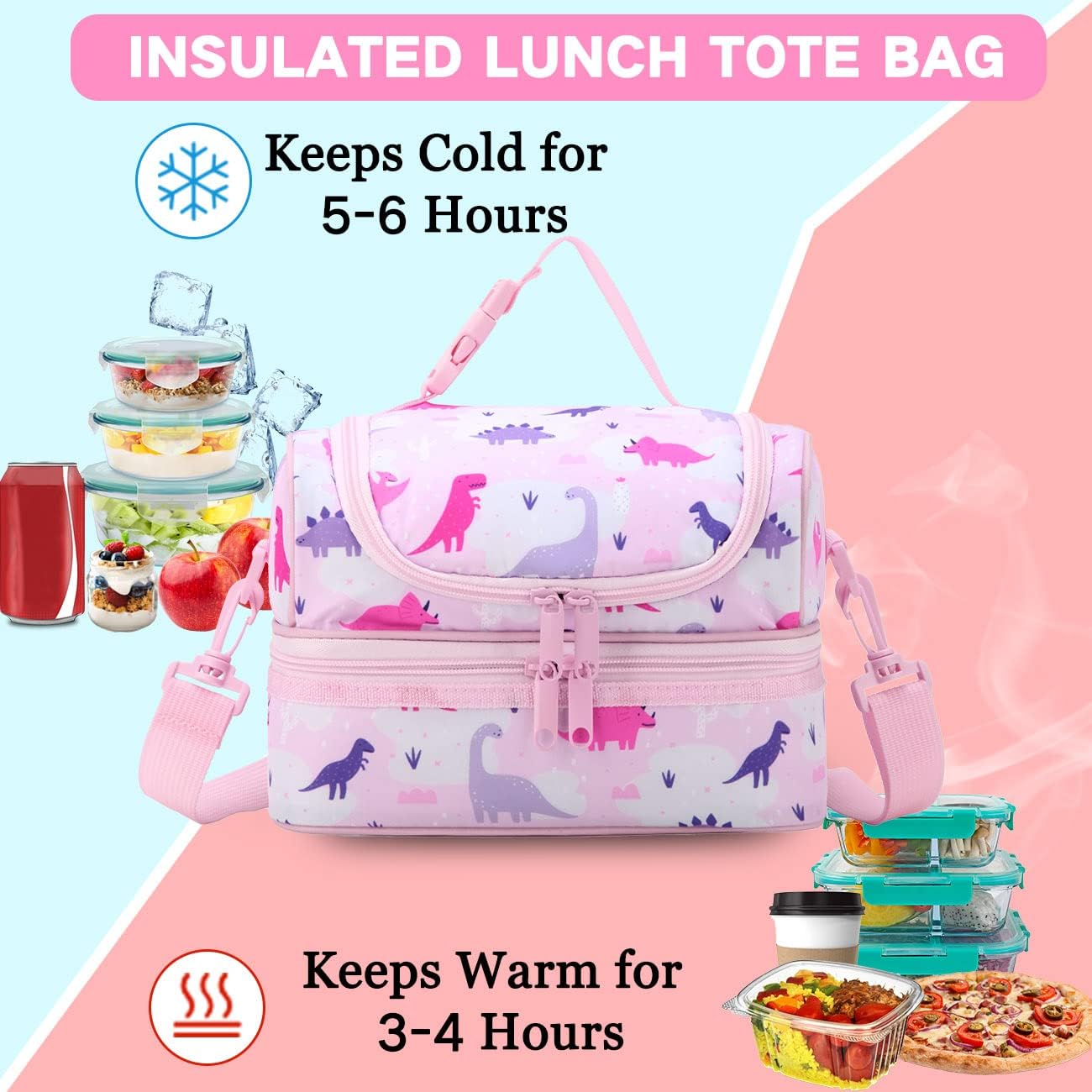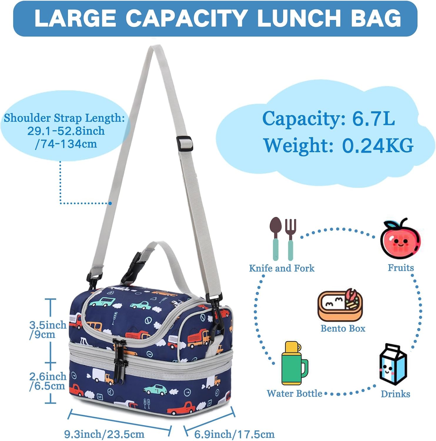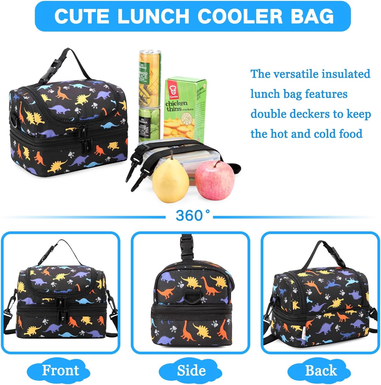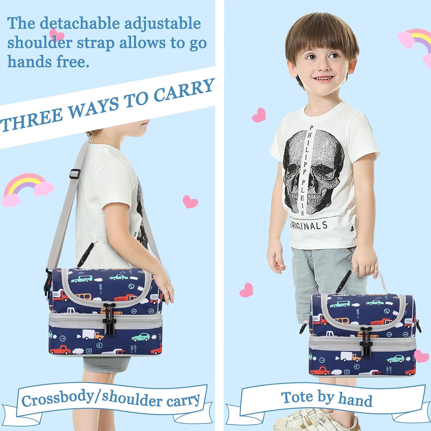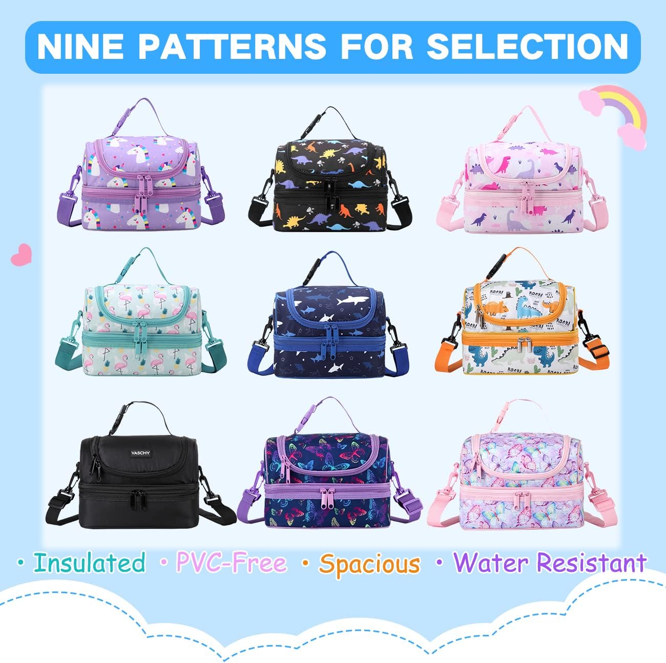 - 🖤SEPERATE COMPARTMENTS: The lunch container tote bag features double compartments,the bottom layer is for bento lunch boxes laying flat,the top compartment is for hot food and the small essentials.It has an insulated wipe-clean interior with plenty of space for sandwiches and snacks.With the detachable adjustable shoulder strap,your little one could hold the lunch bag by hand or by hands-free crossbody way.