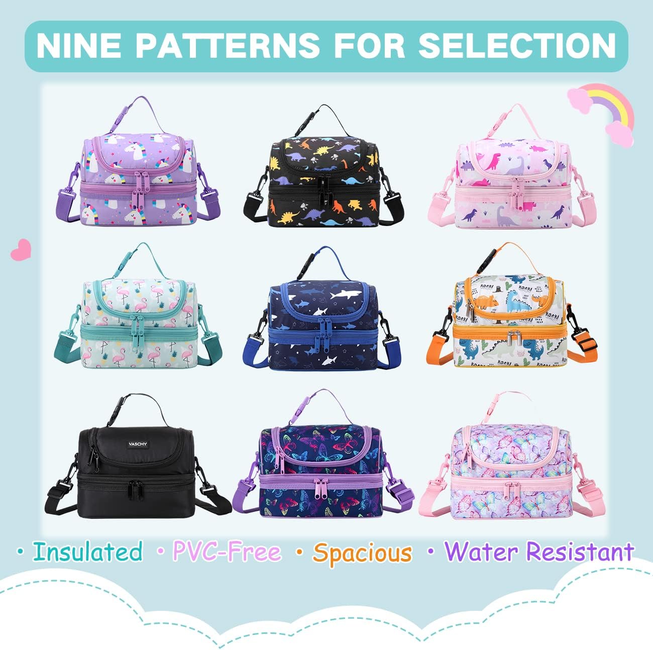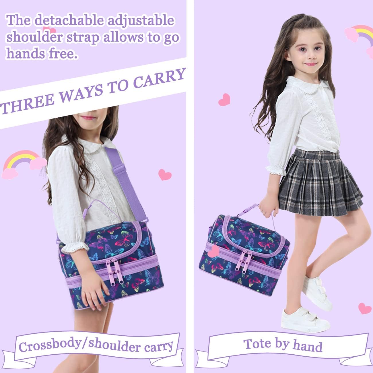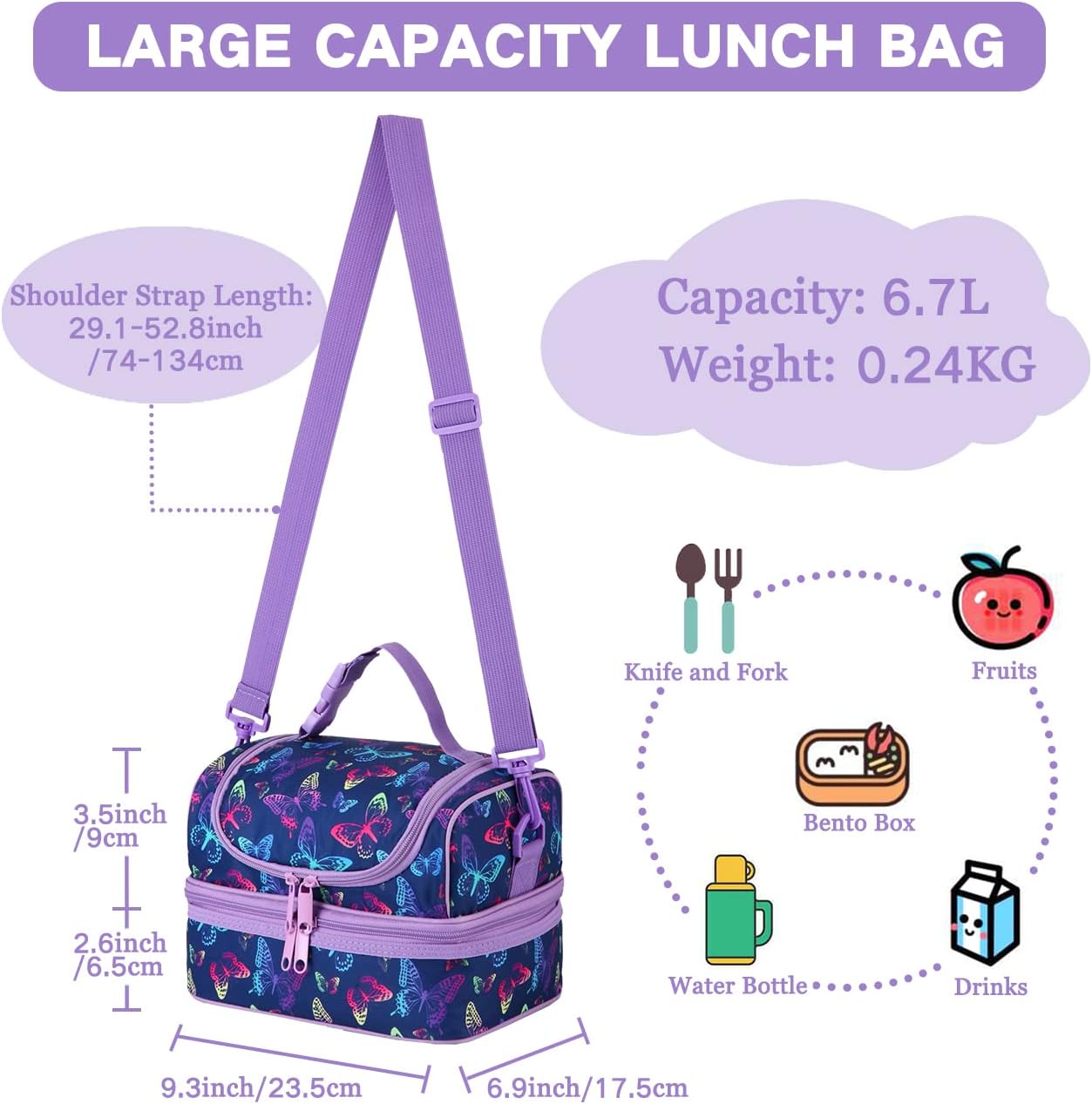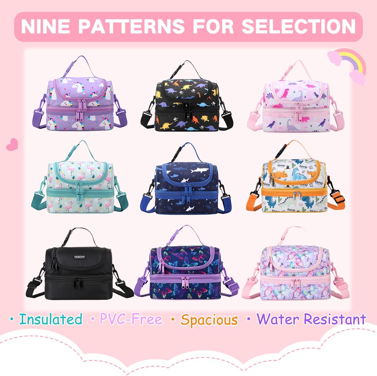 - 🖤SEPERATE COMPARTMENTS: The lunch container tote bag features double compartments,the bottom layer is for bento lunch boxes laying flat,the top compartment is for hot food and the small essentials.It has an insulated wipe-clean interior with plenty of space for sandwiches and snacks.With the detachable adjustable shoulder strap,your little one could hold the lunch bag by hand or by hands-free crossbody way.