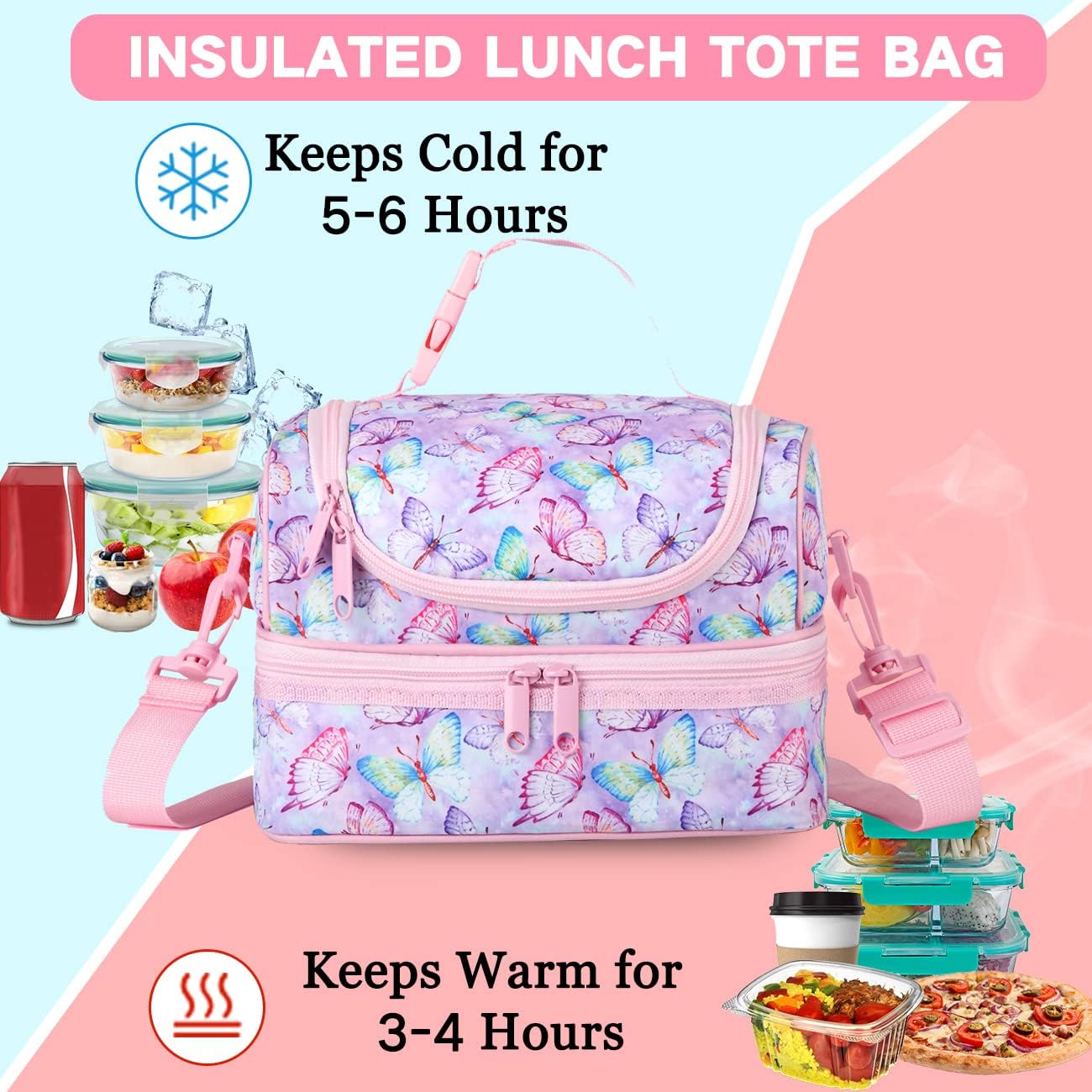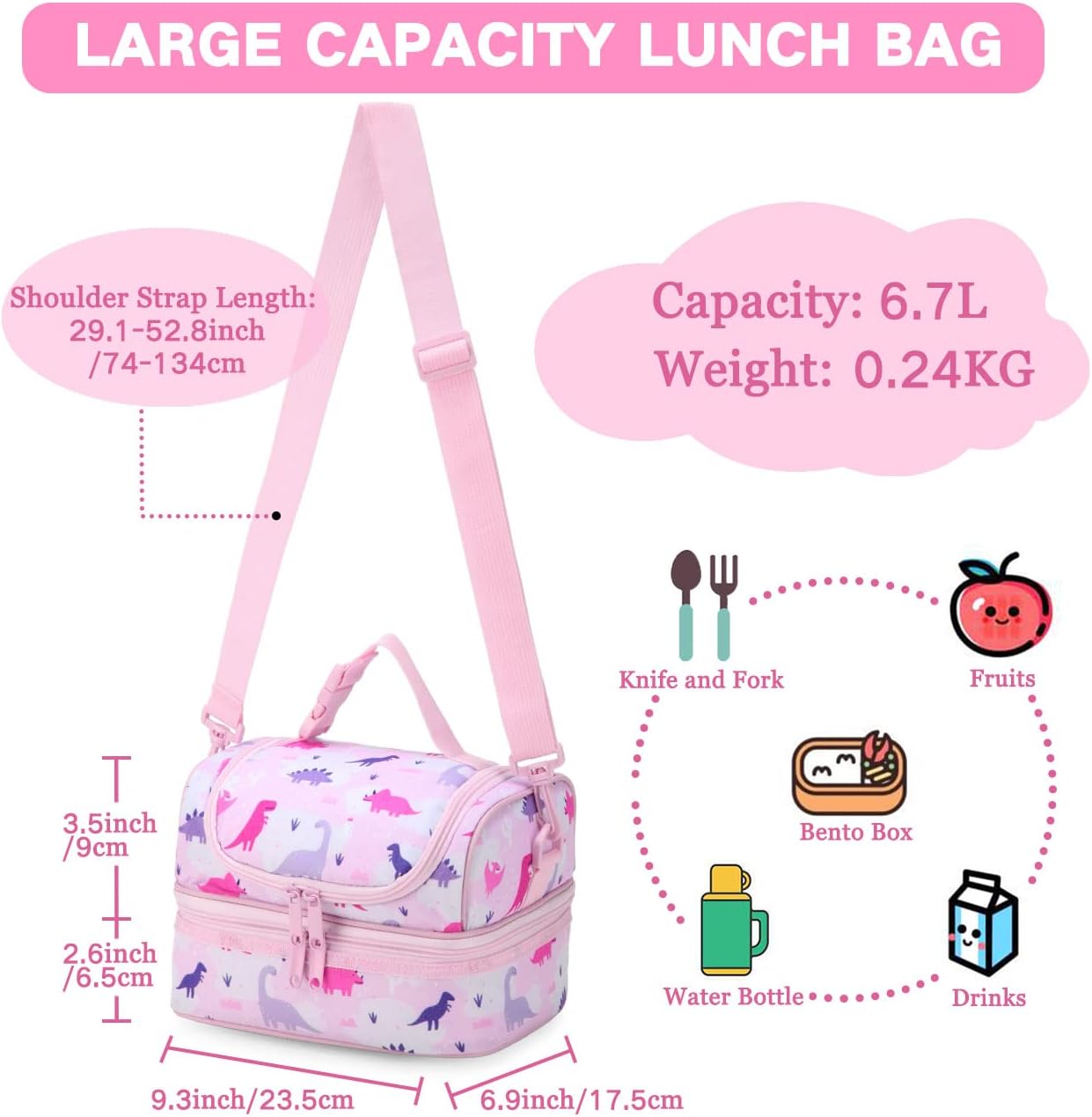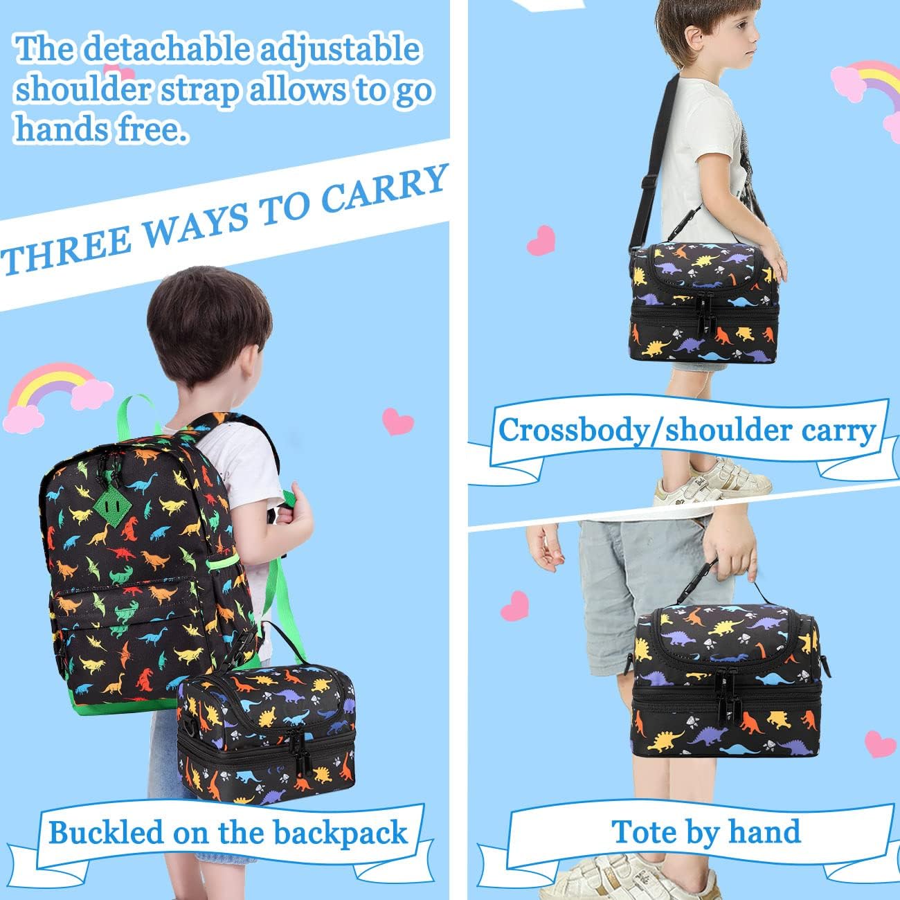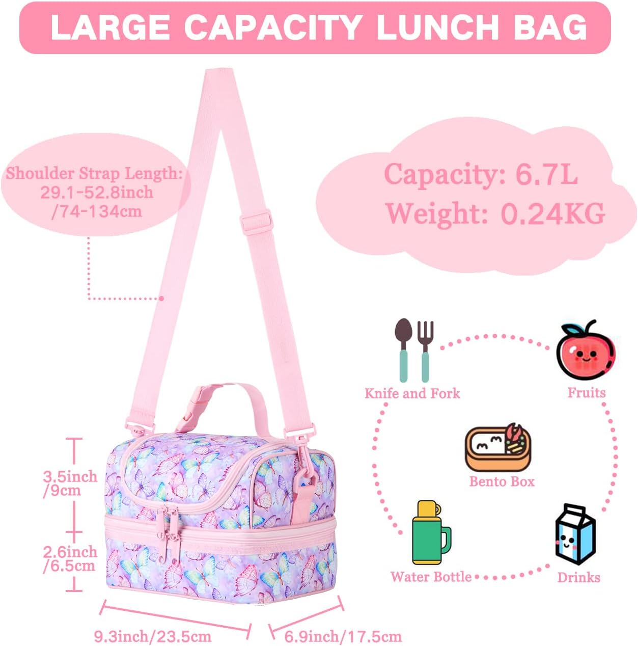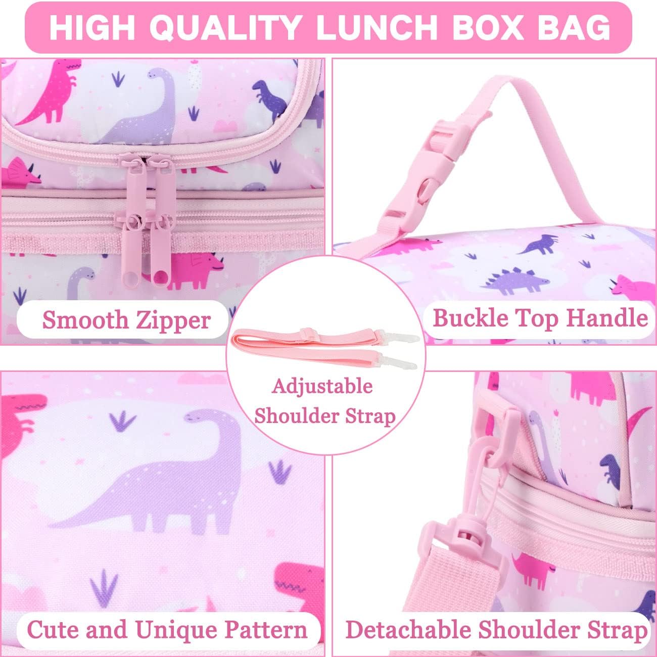 - 🖤SEPERATE COMPARTMENTS: The lunch container tote bag features double compartments,the bottom layer is for bento lunch boxes laying flat,the top compartment is for hot food and the small essentials.It has an insulated wipe-clean interior with plenty of space for sandwiches and snacks.With the detachable adjustable shoulder strap,your little one could hold the lunch bag by hand or by hands-free crossbody way.