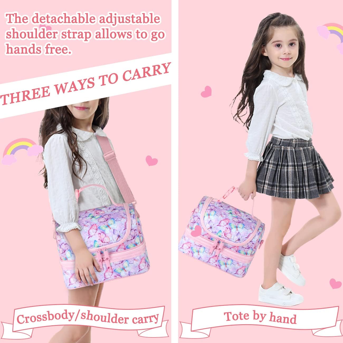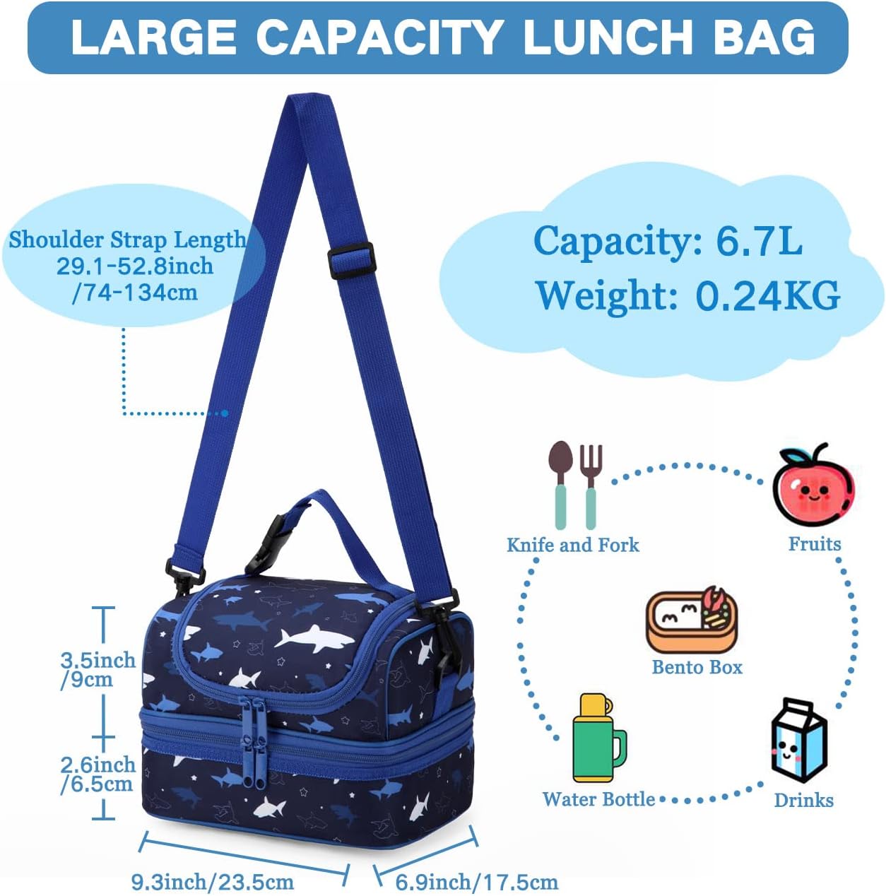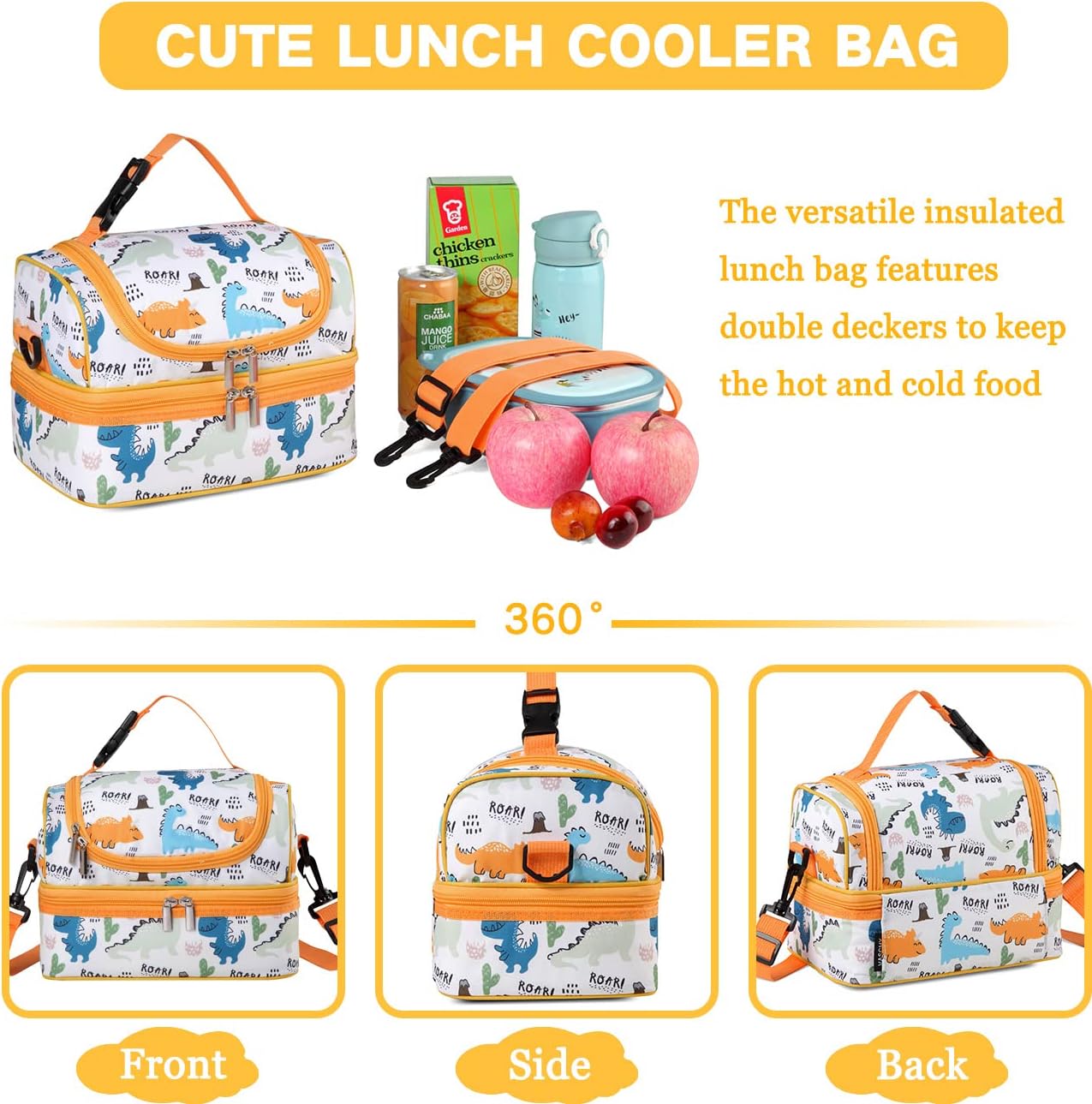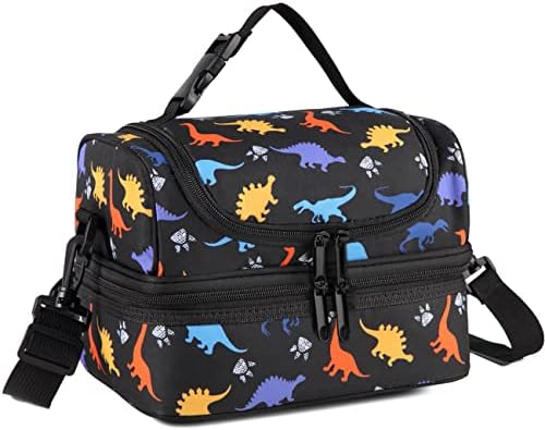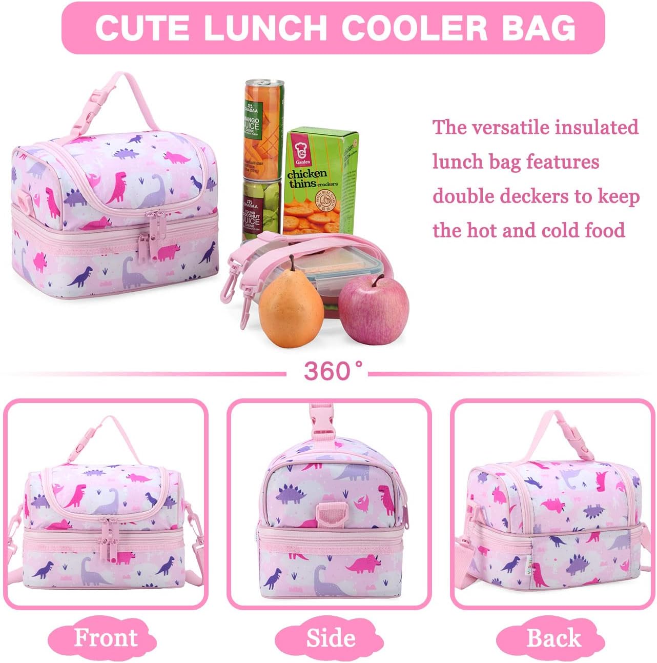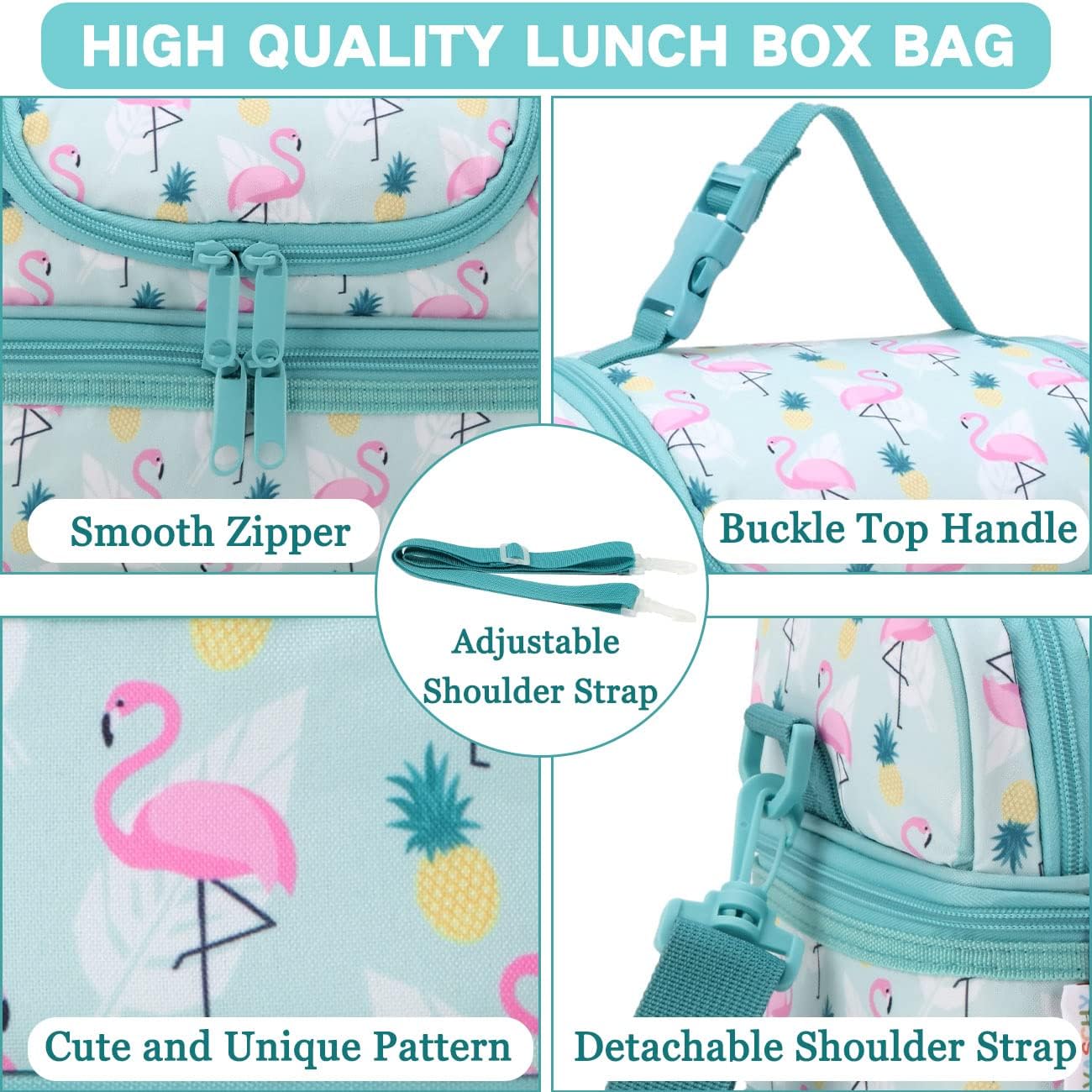 - 🖤SEPERATE COMPARTMENTS: The lunch container tote bag features double compartments,the bottom layer is for bento lunch boxes laying flat,the top compartment is for hot food and the small essentials.It has an insulated wipe-clean interior with plenty of space for sandwiches and snacks.With the detachable adjustable shoulder strap,your little one could hold the lunch bag by hand or by hands-free crossbody way.
