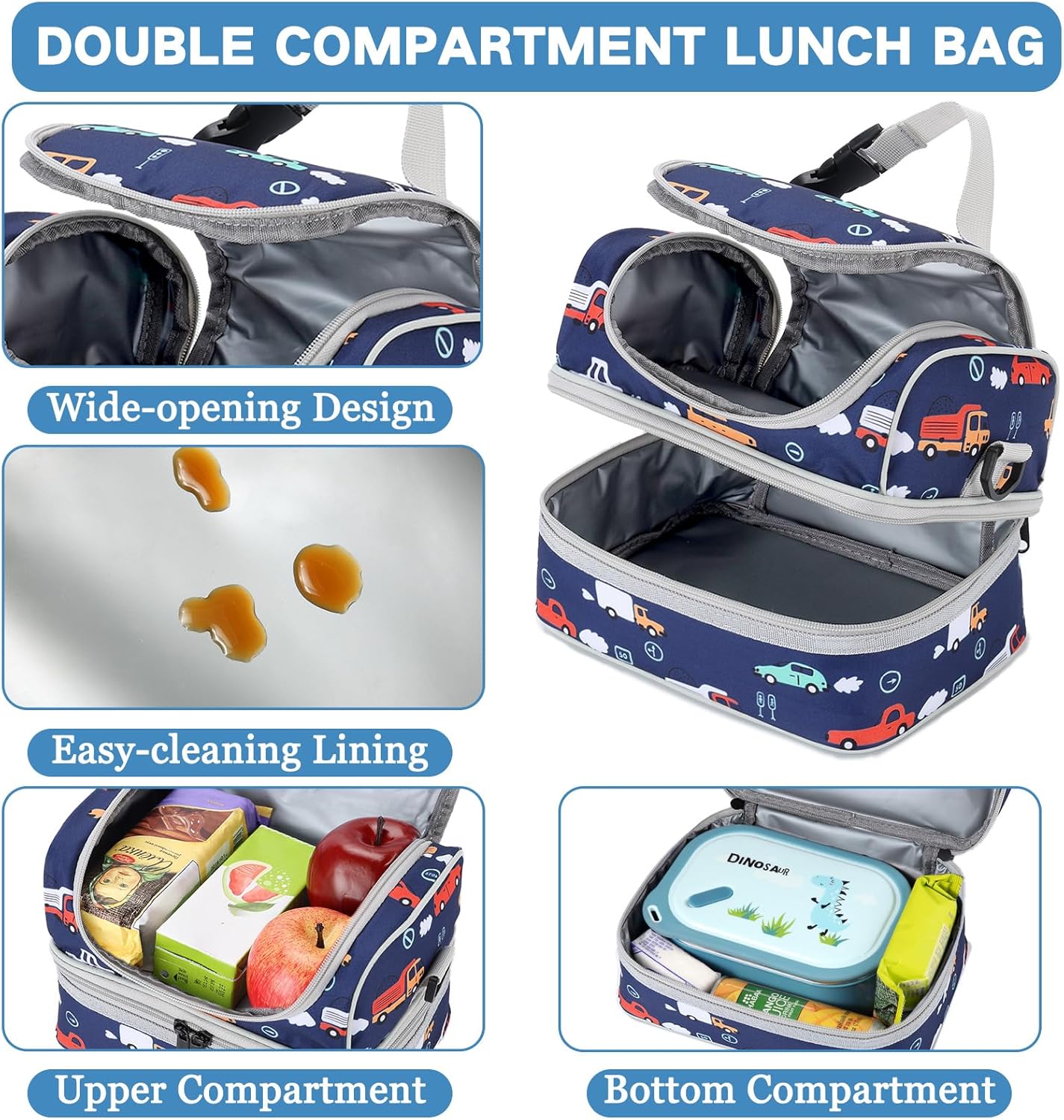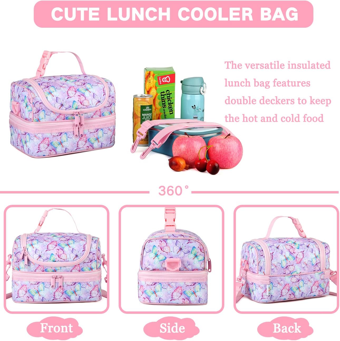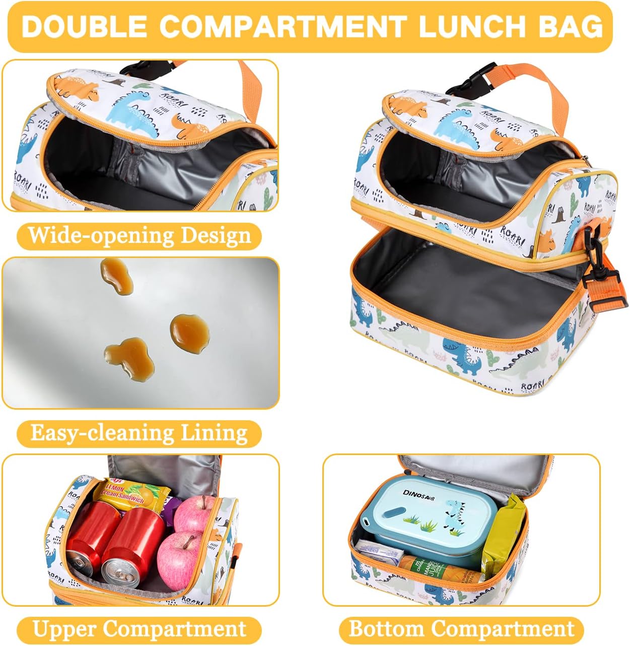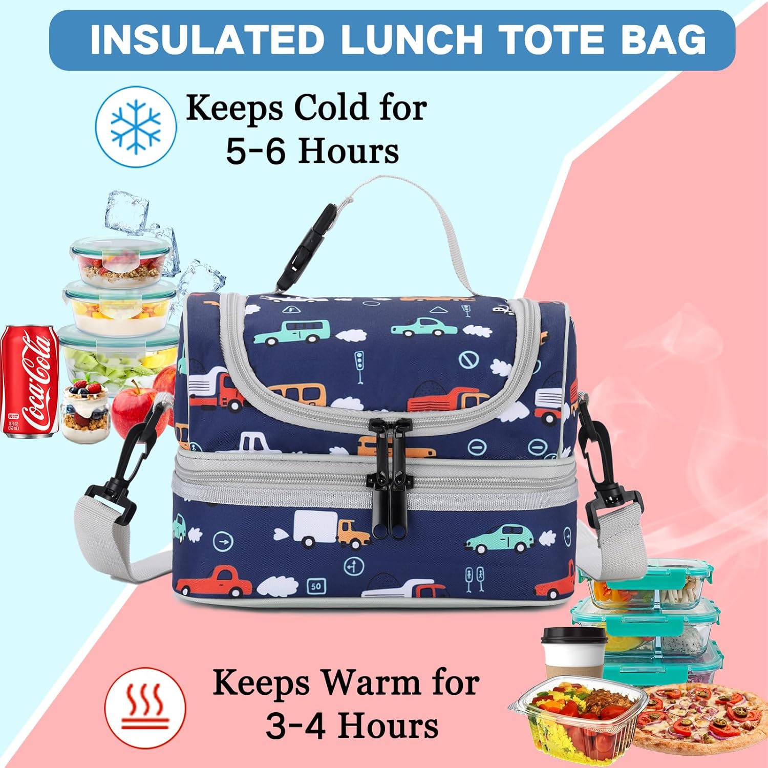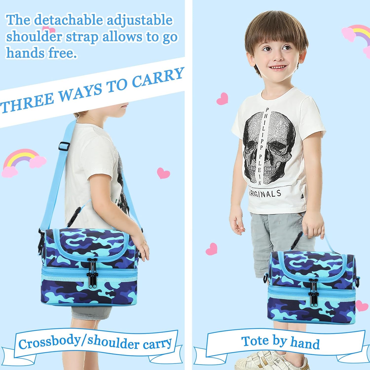 - 🖤SEPERATE COMPARTMENTS: The lunch container tote bag features double compartments,the bottom layer is for bento lunch boxes laying flat,the top compartment is for hot food and the small essentials.It has an insulated wipe-clean interior with plenty of space for sandwiches and snacks.With the detachable adjustable shoulder strap,your little one could hold the lunch bag by hand or by hands-free crossbody way.