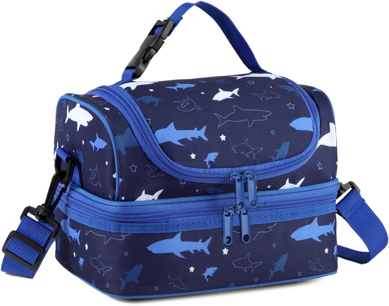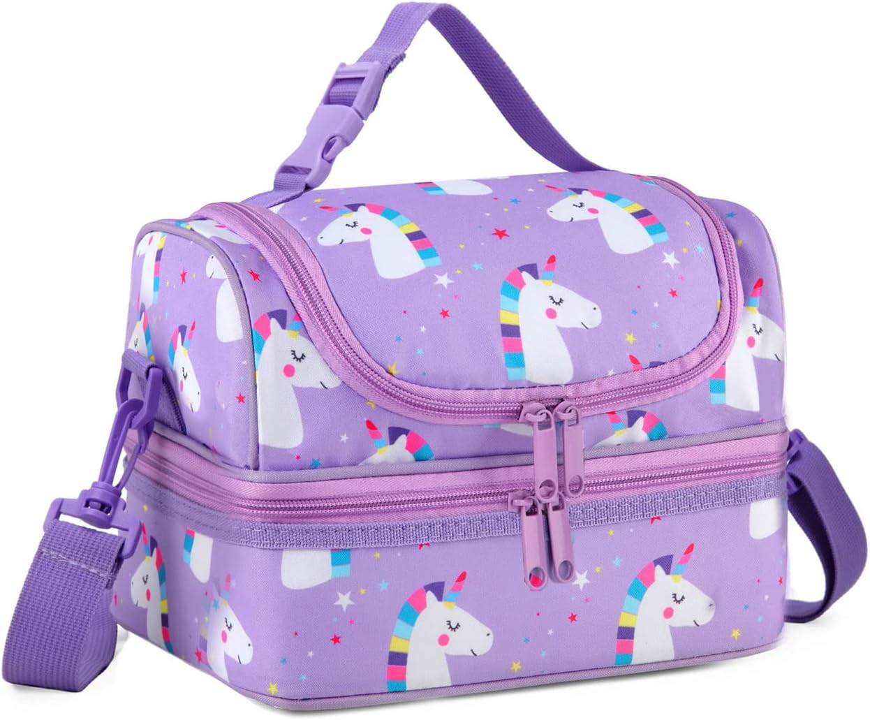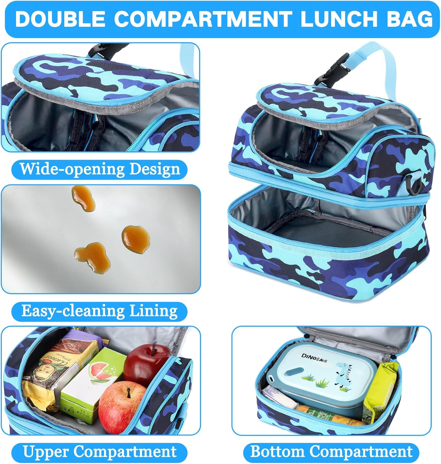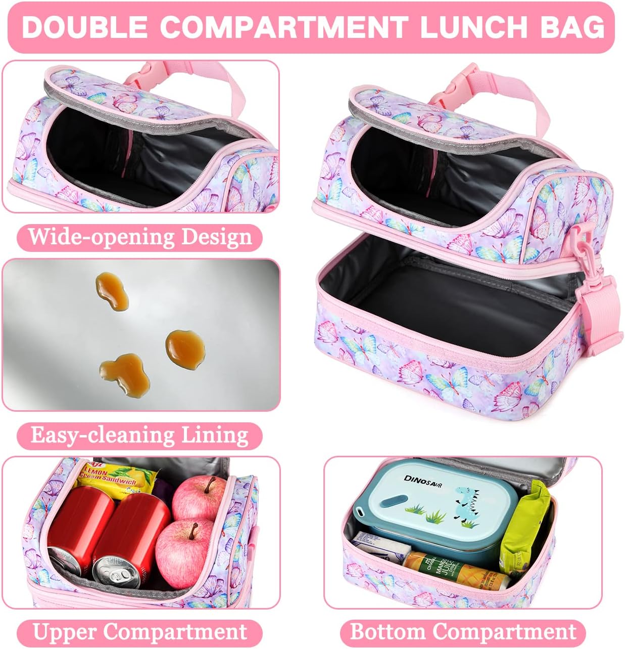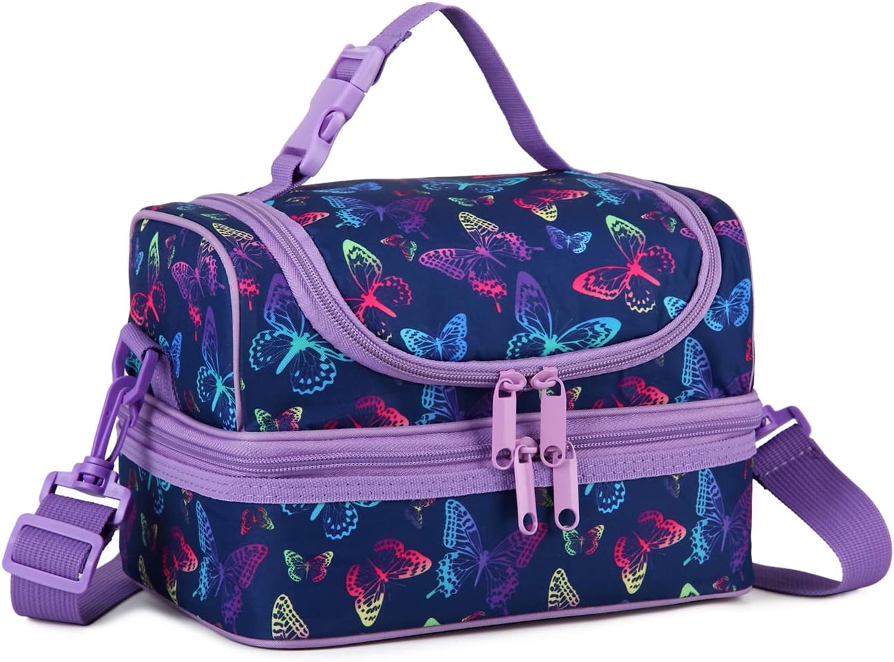 - 🖤SEPERATE COMPARTMENTS: The lunch container tote bag features double compartments,the bottom layer is for bento lunch boxes laying flat,the top compartment is for hot food and the small essentials.It has an insulated wipe-clean interior with plenty of space for sandwiches and snacks.With the detachable adjustable shoulder strap,your little one could hold the lunch bag by hand or by hands-free crossbody way.