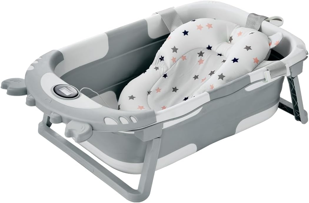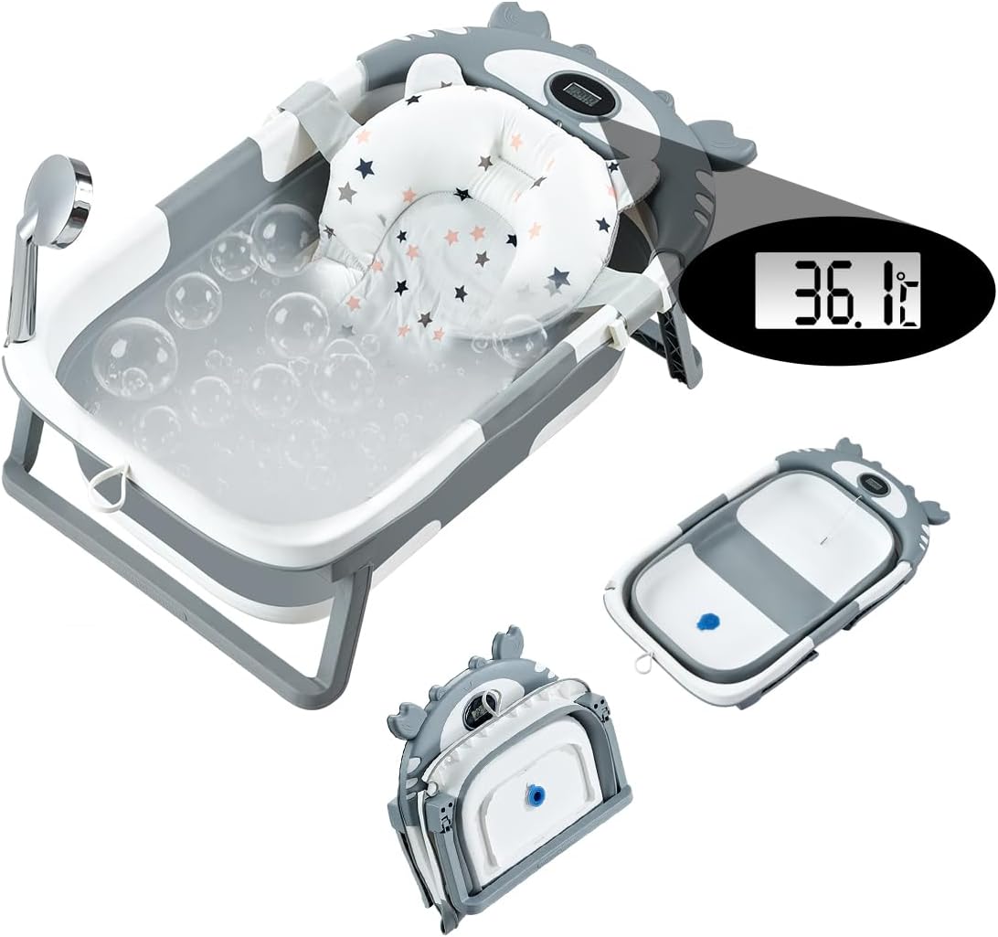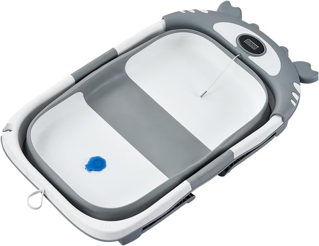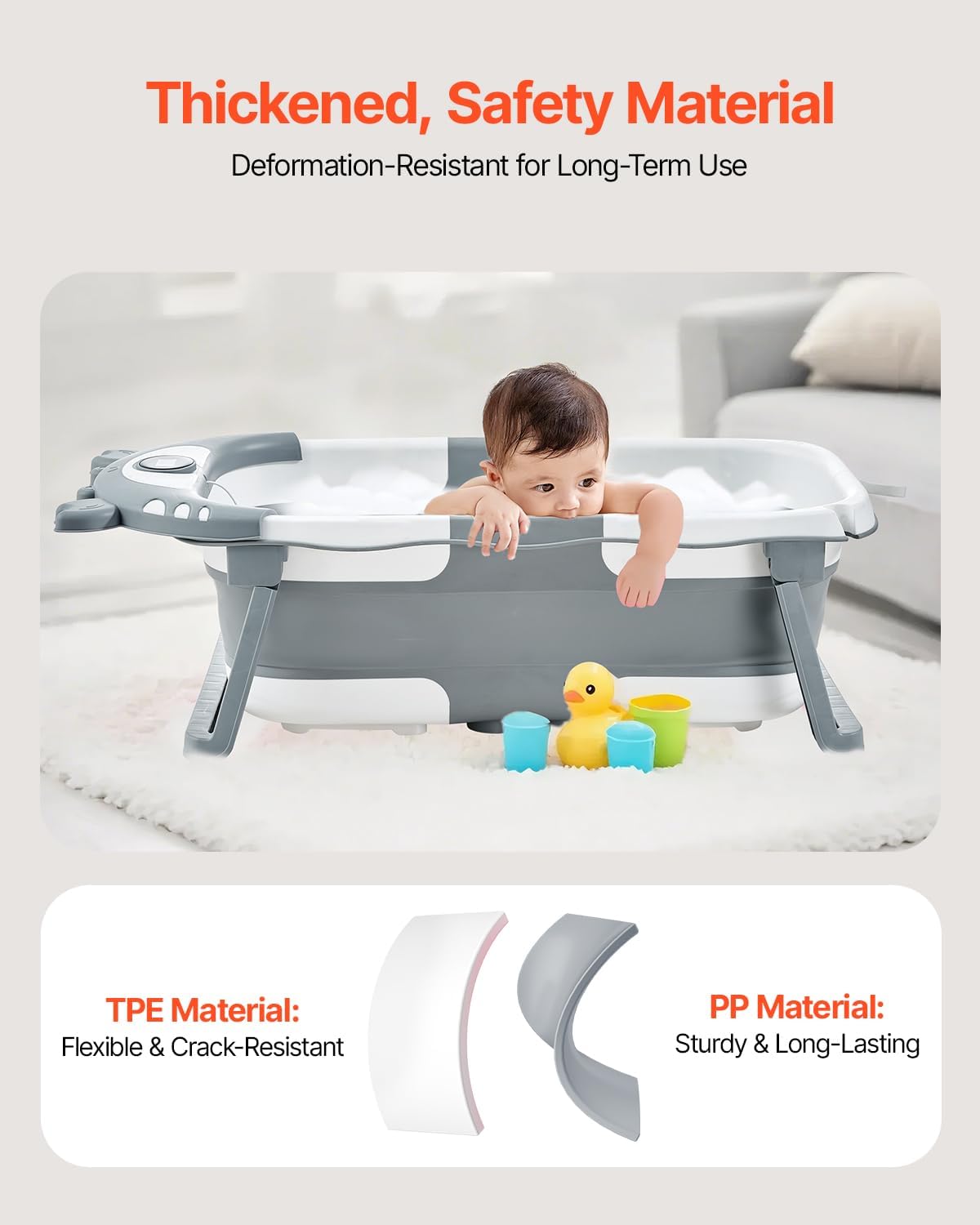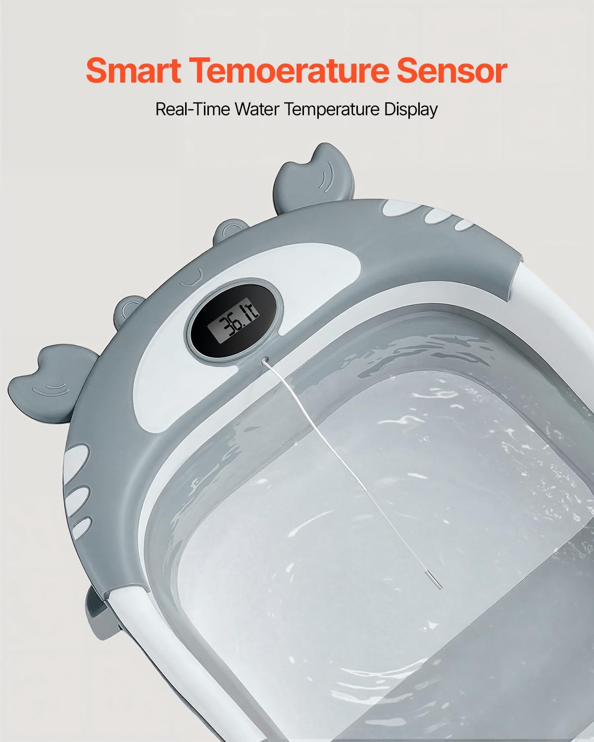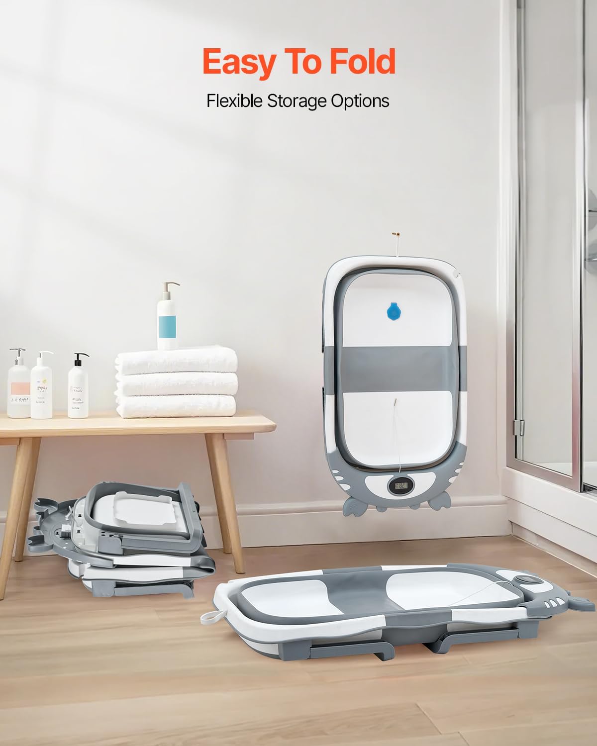 VEVOR Baby Bathtub, 5 Gal Capacity, Collapsible Baby Bath Tub with Thermometer and Soft Cushion, Durable & Portable Grey Bathtub with Showerhead Holder & Drainage Hole, Fit for 0-24 Months Toddlers
