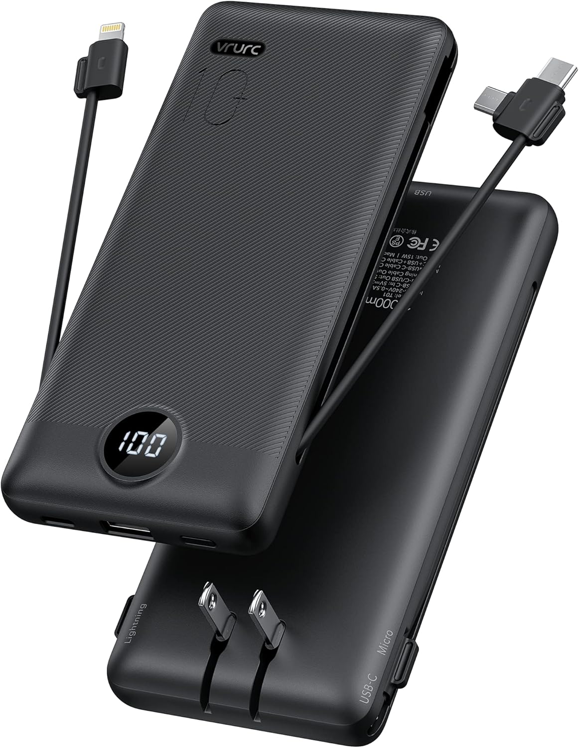 VRURC Portable Charger with Built-in Cables and AC Wall Plug, 10000mAh Power Bank USB C Phone Charger 5 Output 2 Input LED Display Ultra Slim External Battery Pack Compatible with Smart Devices-Black
