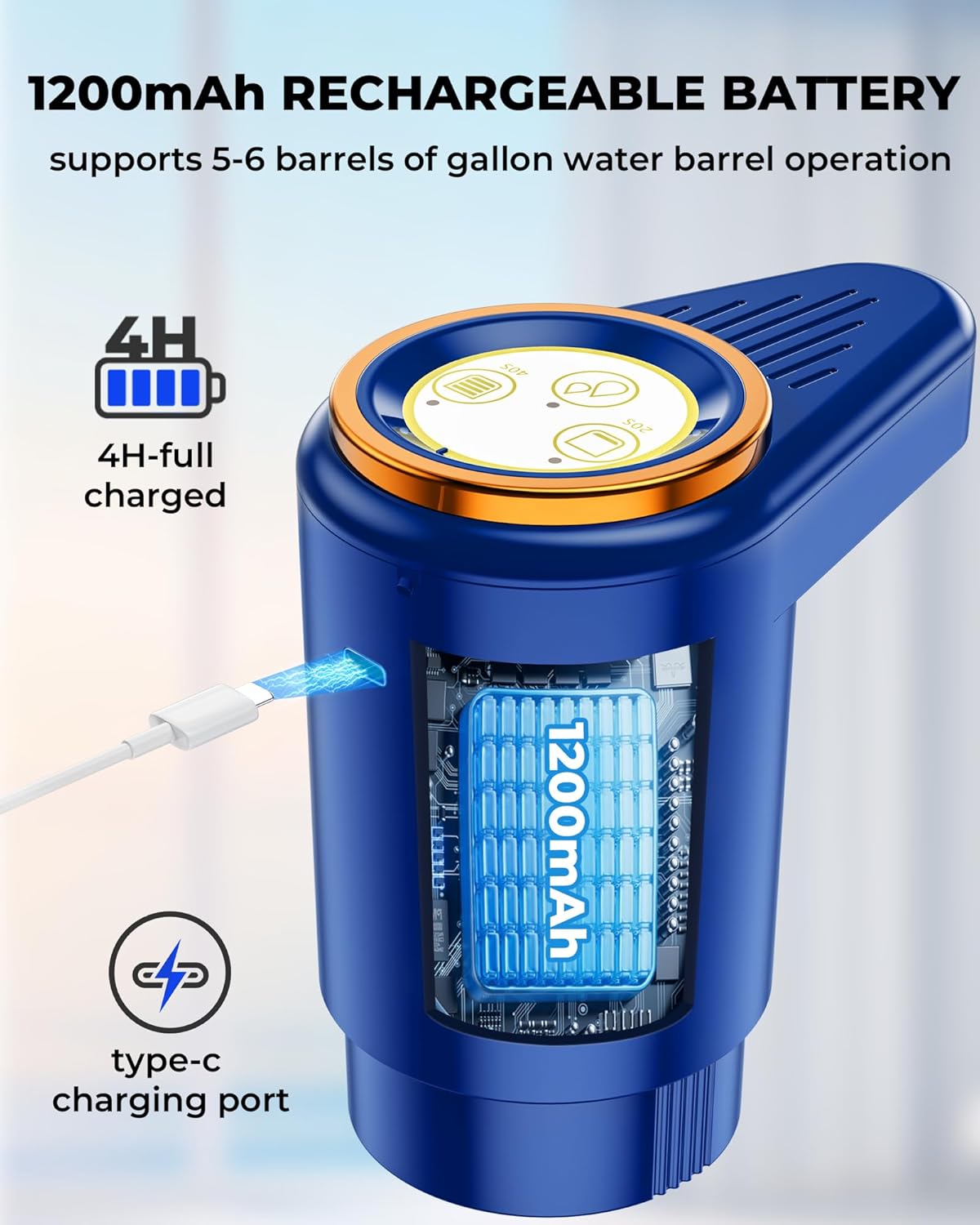 🔋【USB-C Rechargeable & Long Battery Life】 Equipped with a powerful 1200mAh rechargeable battery, this water pump can last 30–40 days or about 4–6 bottles per charge. No more frequent charging—ideal for daily use at home, in the office, or even outdoors as a water table pump.