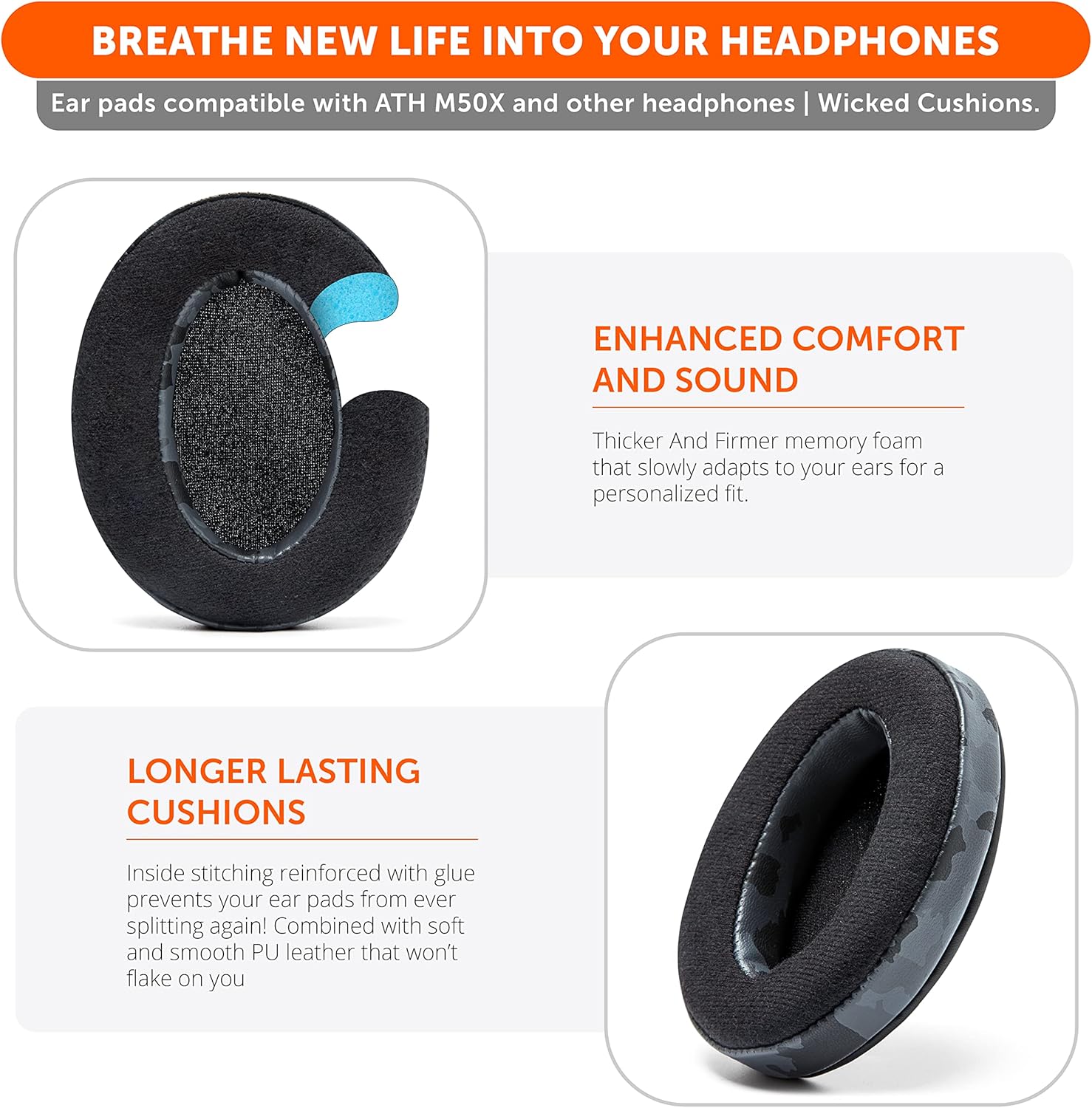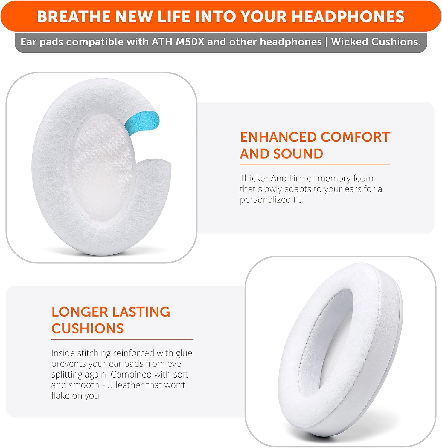 - Rugged Durability: These replacement earpads were made to last for longer… We added stitching and reinforced it with glue on the inside seam to avoid splits and breaks. Extra thickness prevents your ear pads from becoming flat as time goes by.